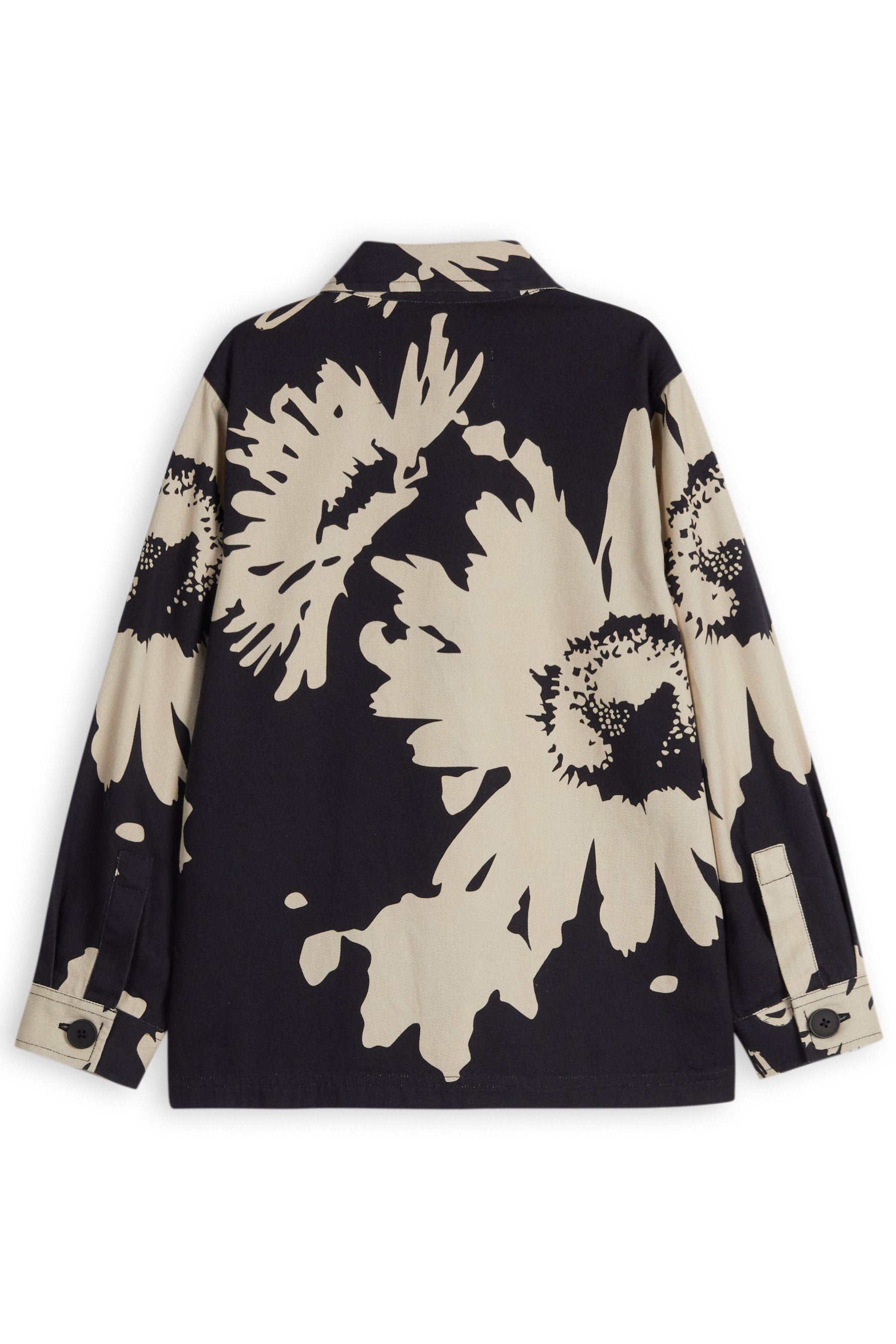 Relaxed fit, button-up shirt jacket with lapel collar, long buttoned-cuff sleeves, and side pockets