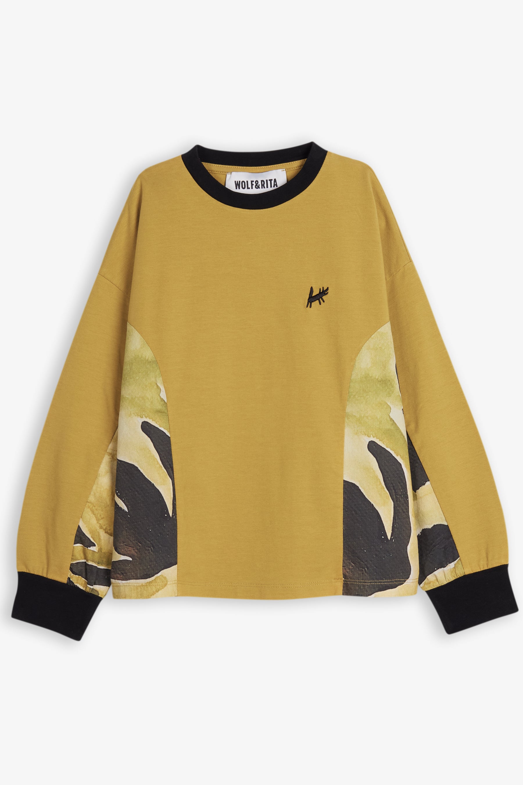 Long sleeved panelled t-shirt, contrasted collar and ribbed cuffs, small embroidery