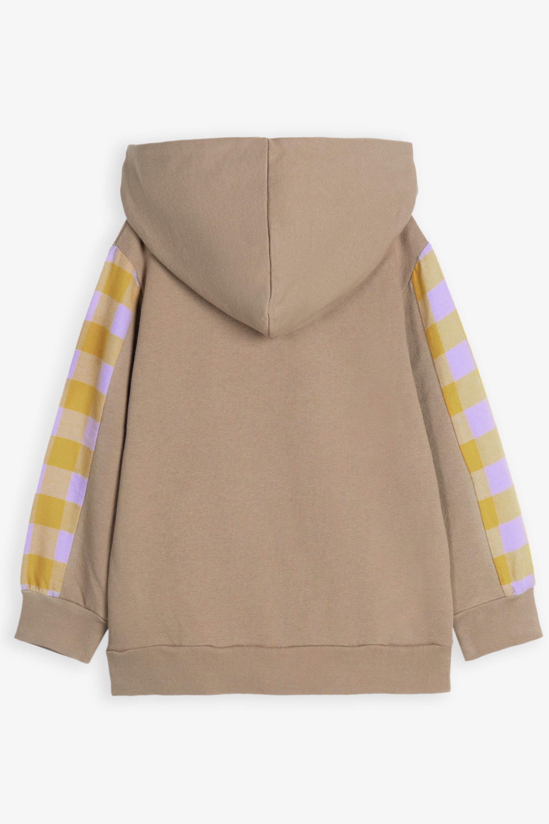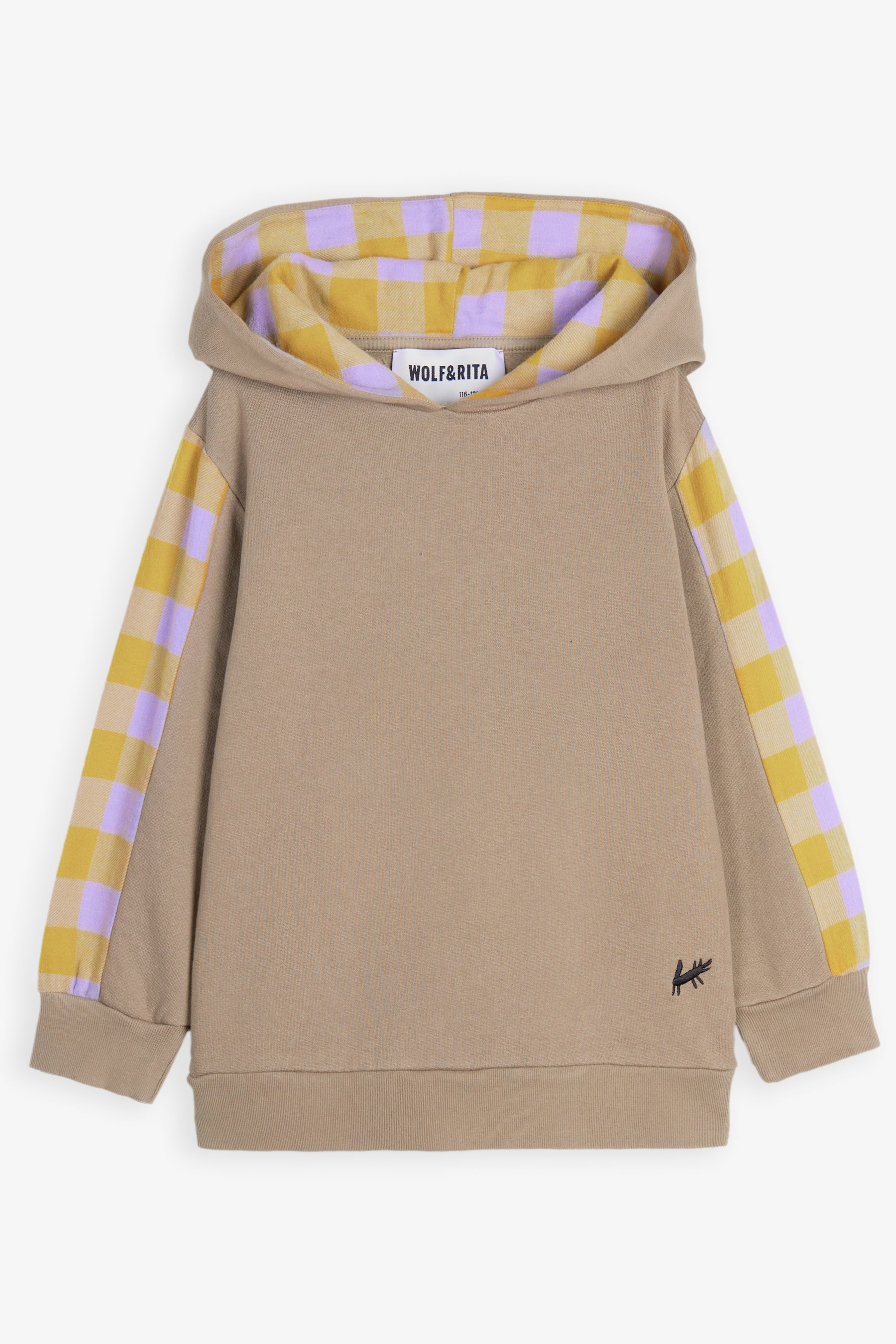 Long sleeved panelled hoodie, contrasted cuffs, contrasted lining on hoodie, small embroidery