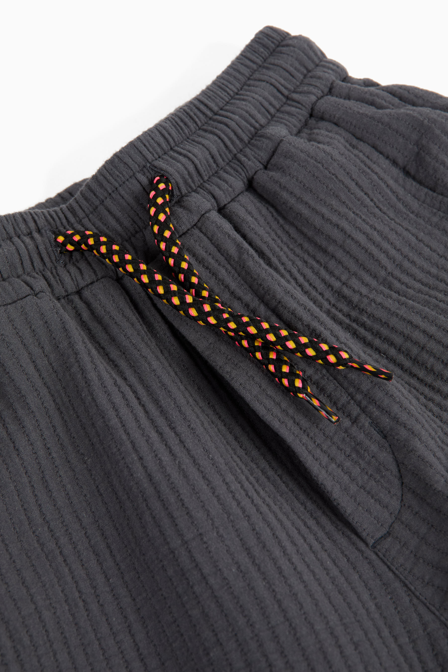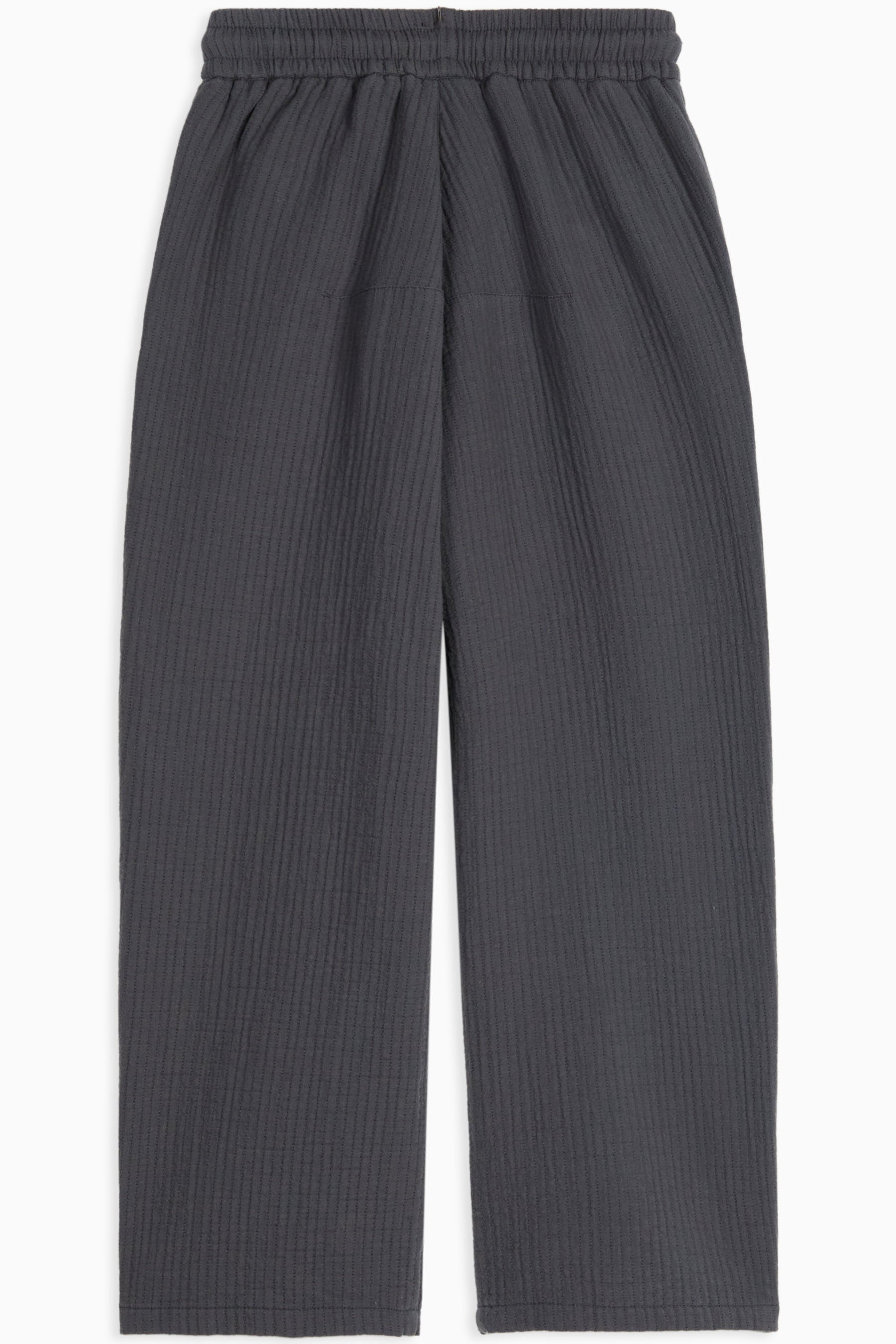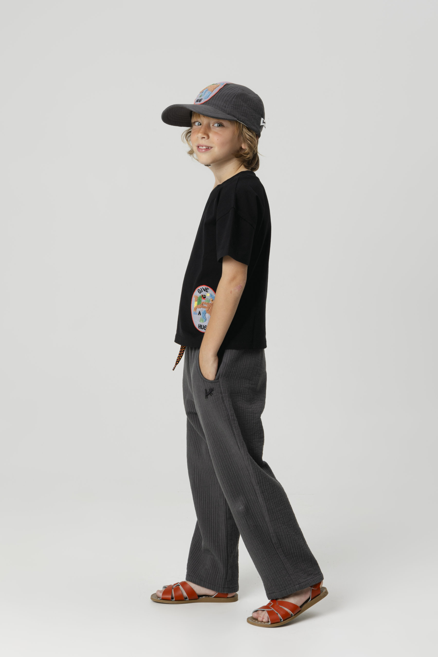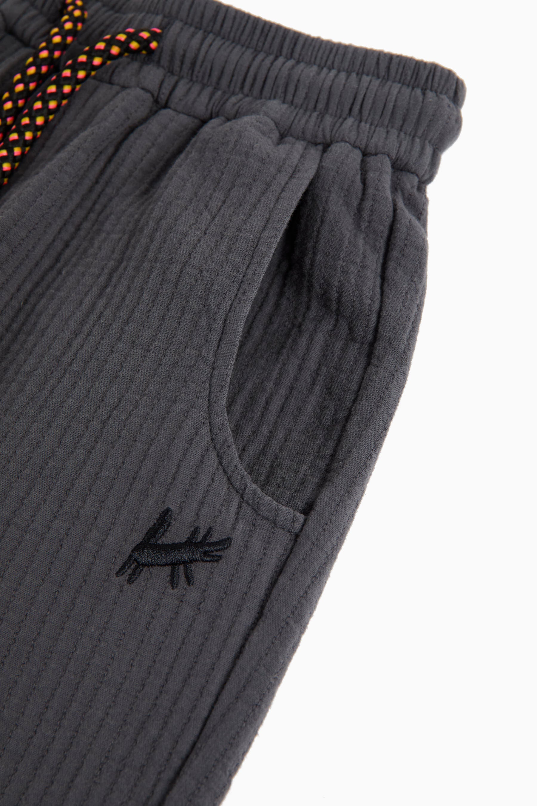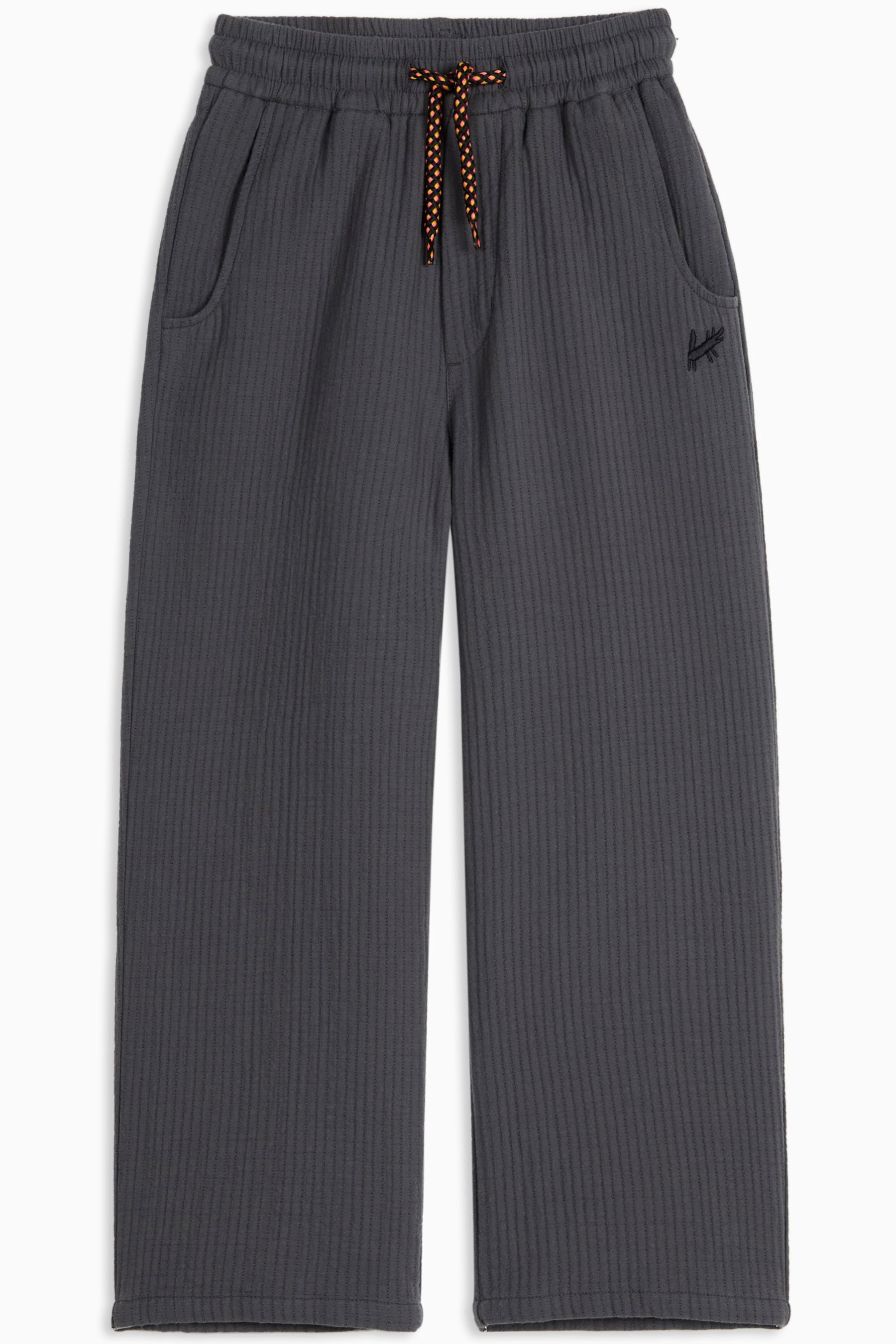 Straight wide trousers, curved side pockets, elastic waist and adjustable drawstring, small mascot embroidery