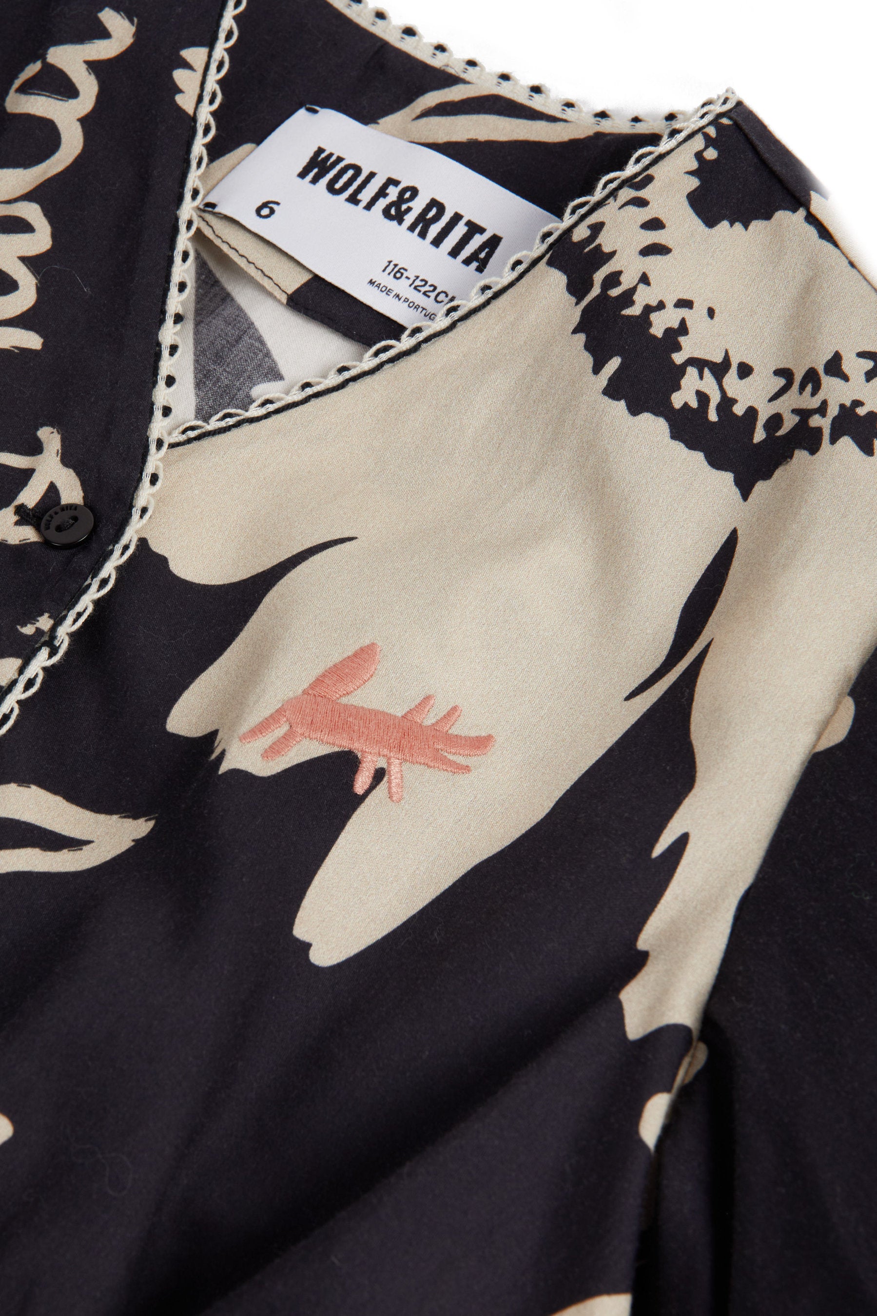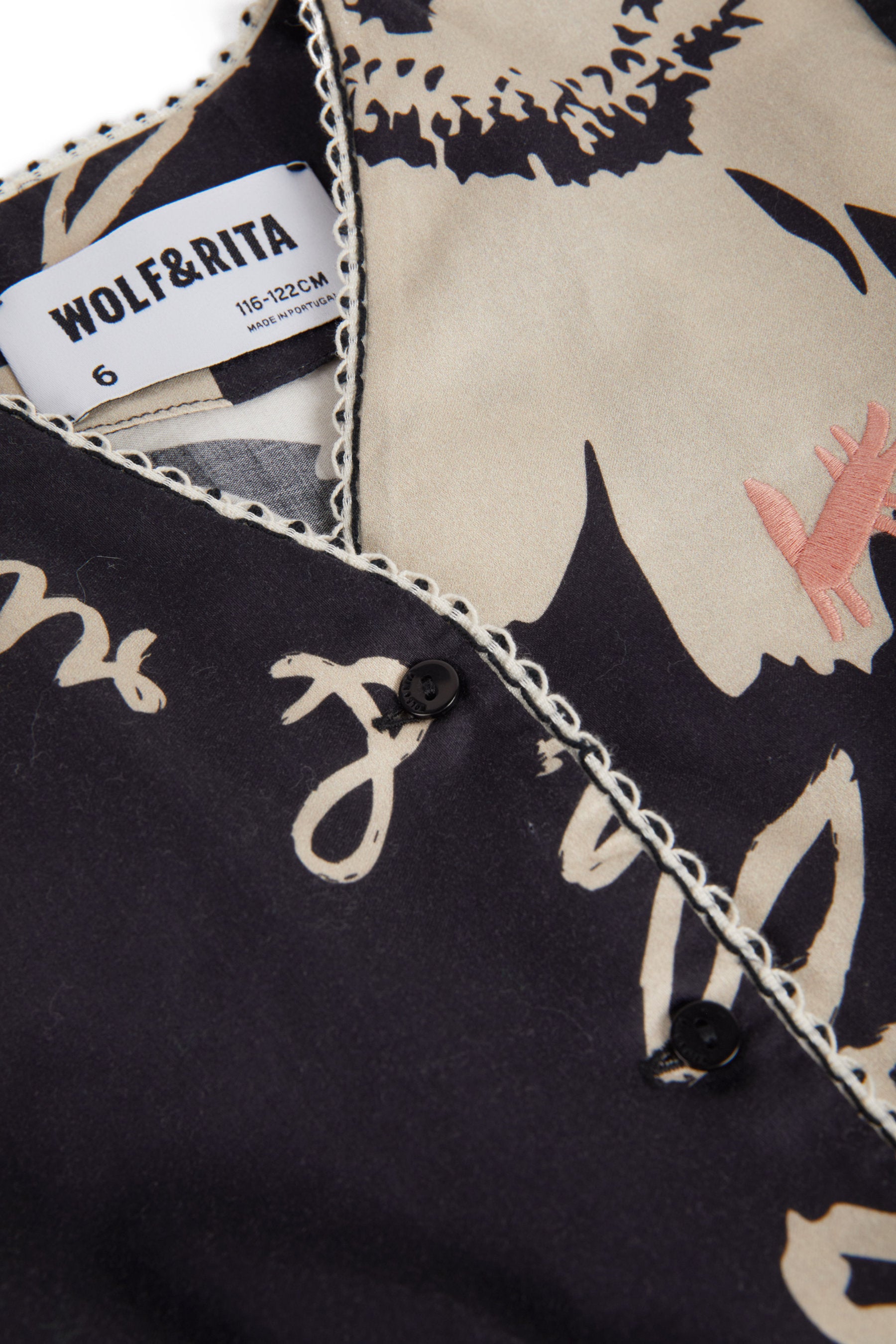 Short sleeved blouse with v-neck, puff sleeves, front buttons, lace detail and small mascot embroidery