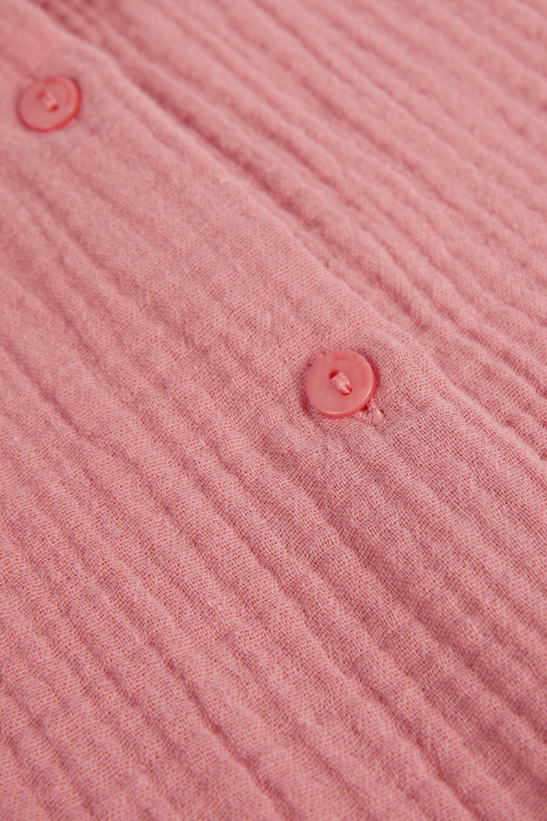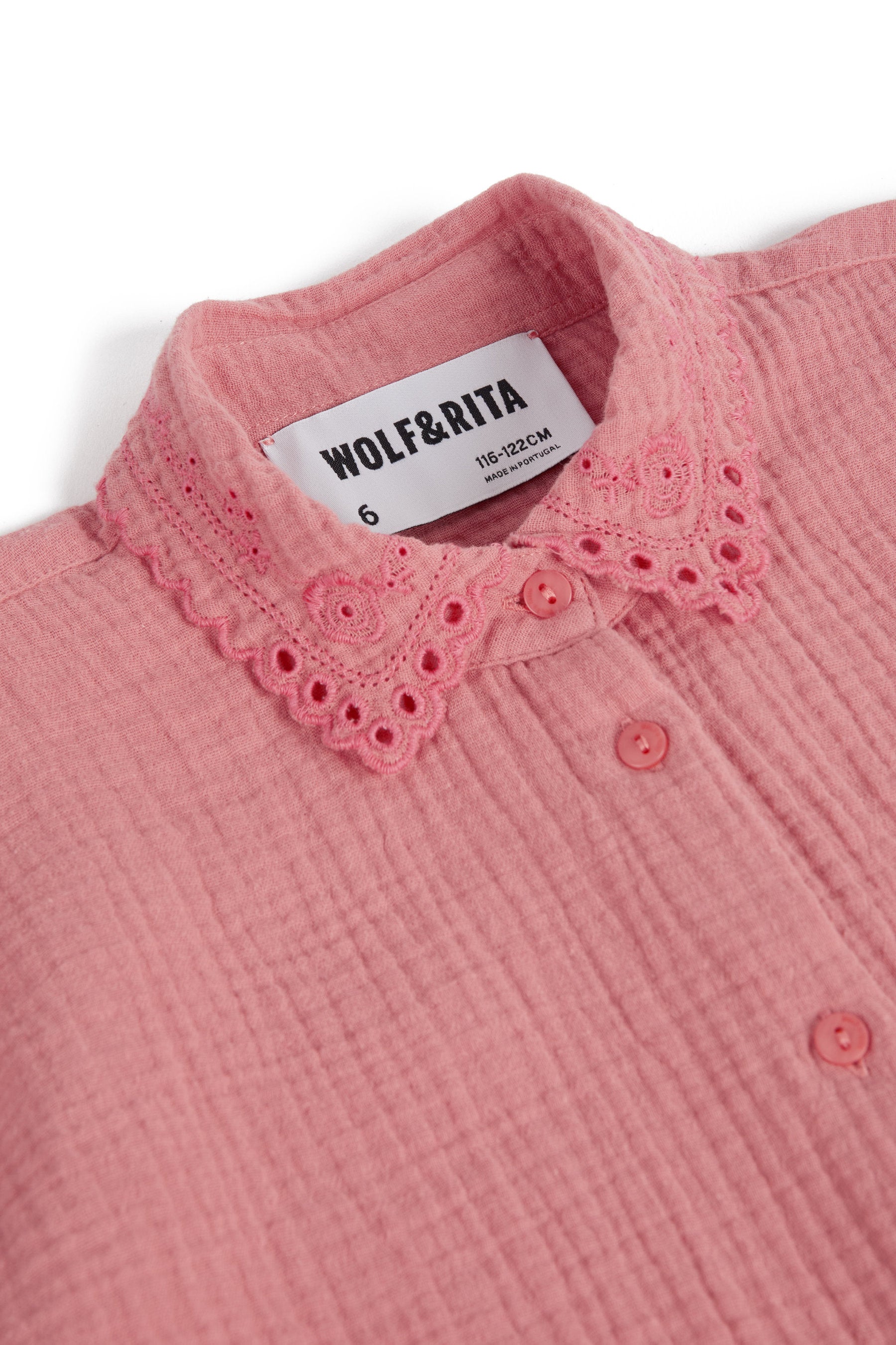 Short sleeved button-up blouse with contrasted embroidered collar and longer back