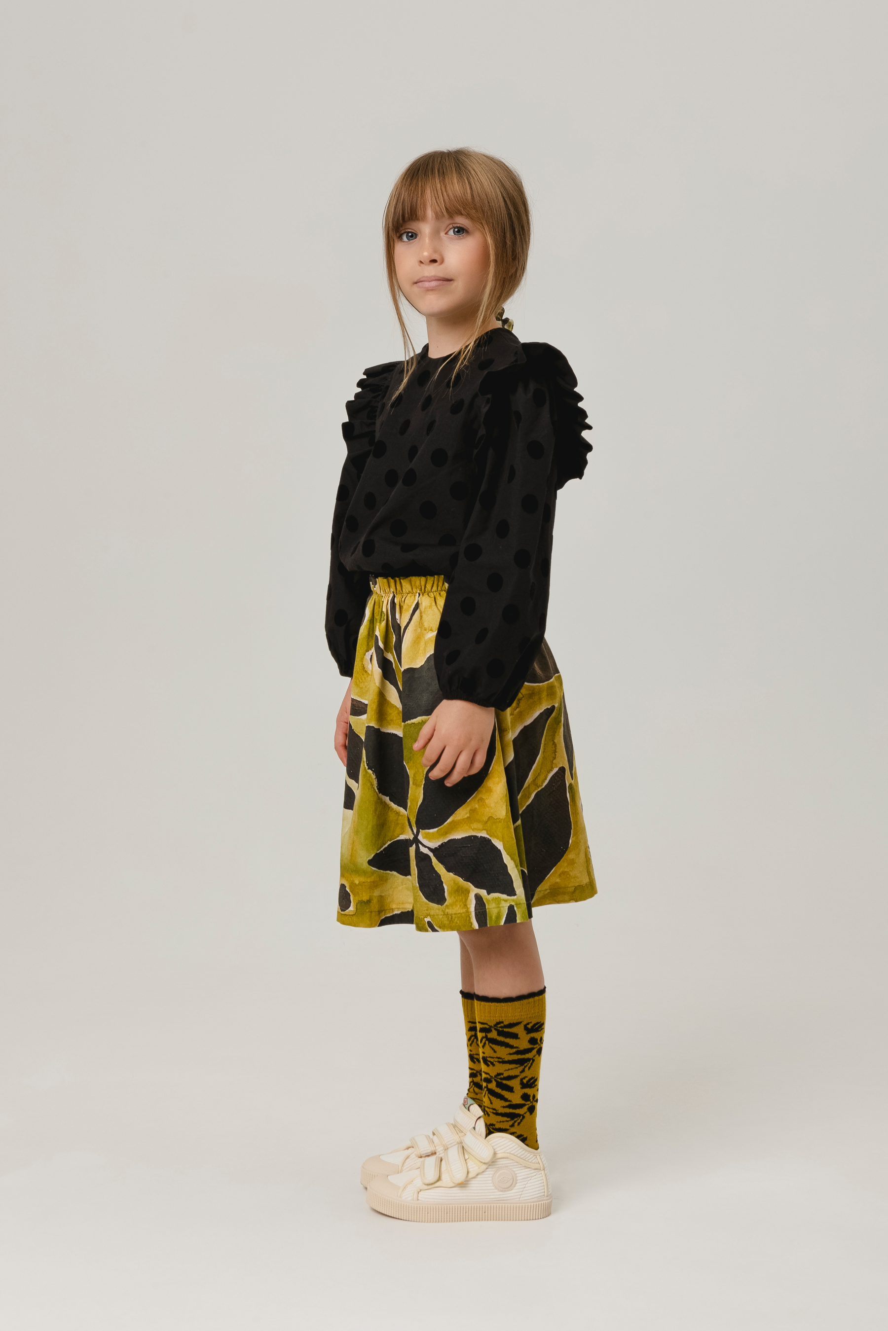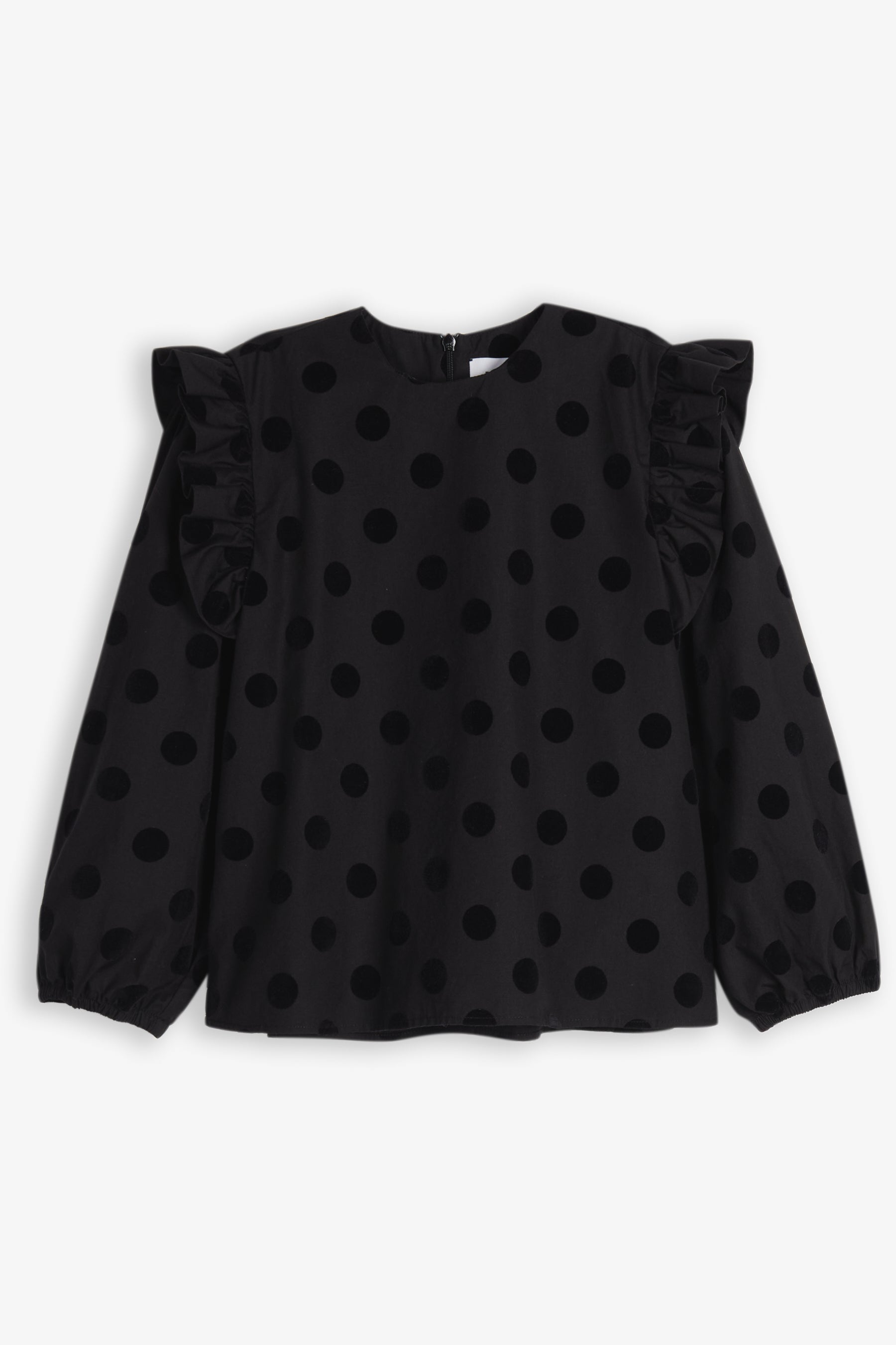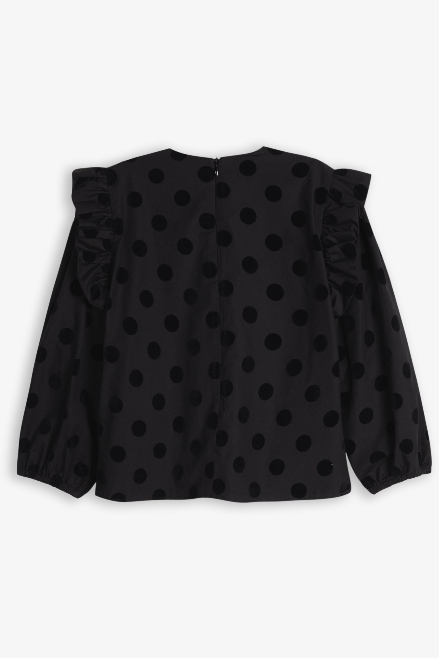 Long sleeved blouse, zip closure (back), frill on shoulders, and elastic cuffs