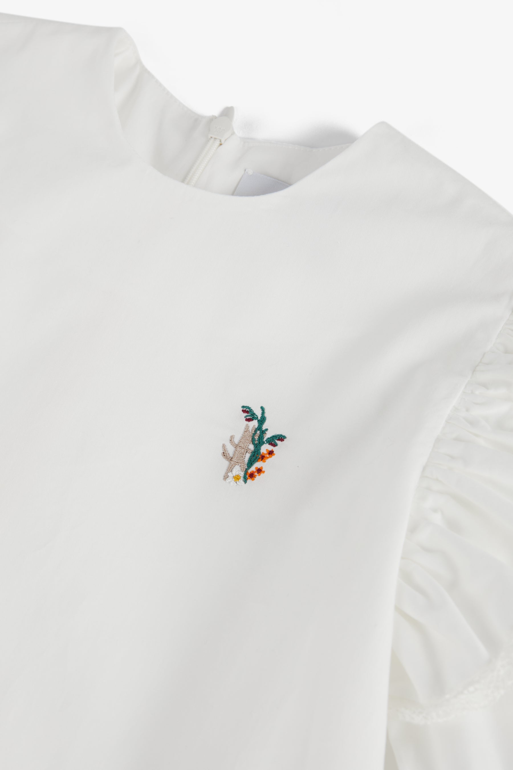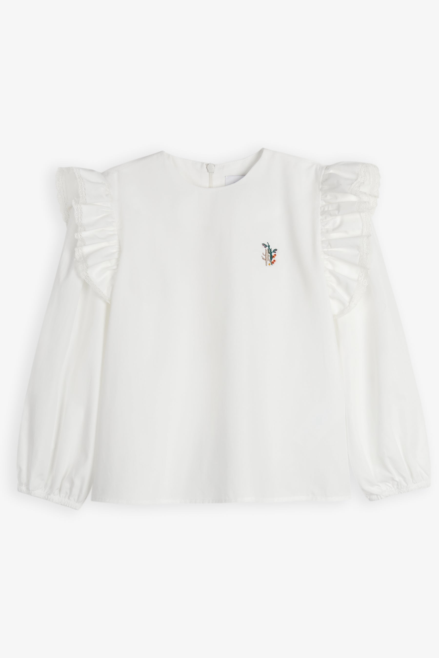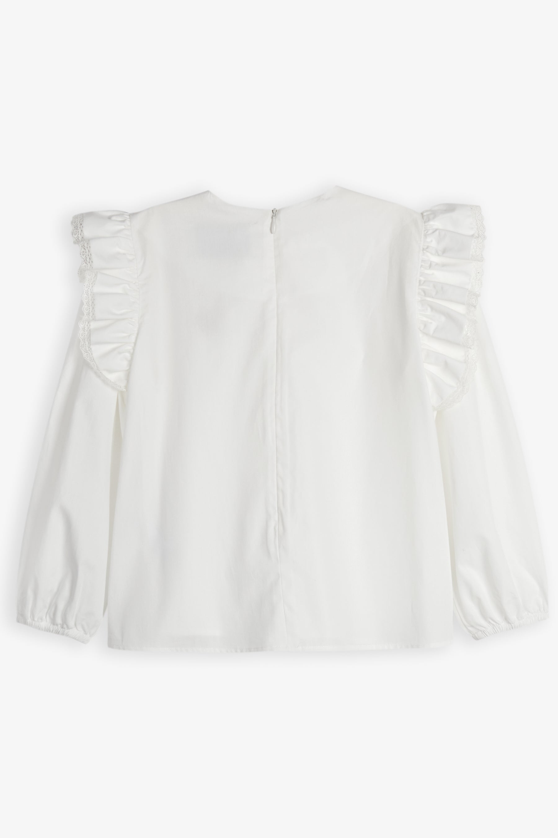 Long sleeved blouse, zip closure (back), laced frill on shoulders, elastic cuffs, and small embroidery