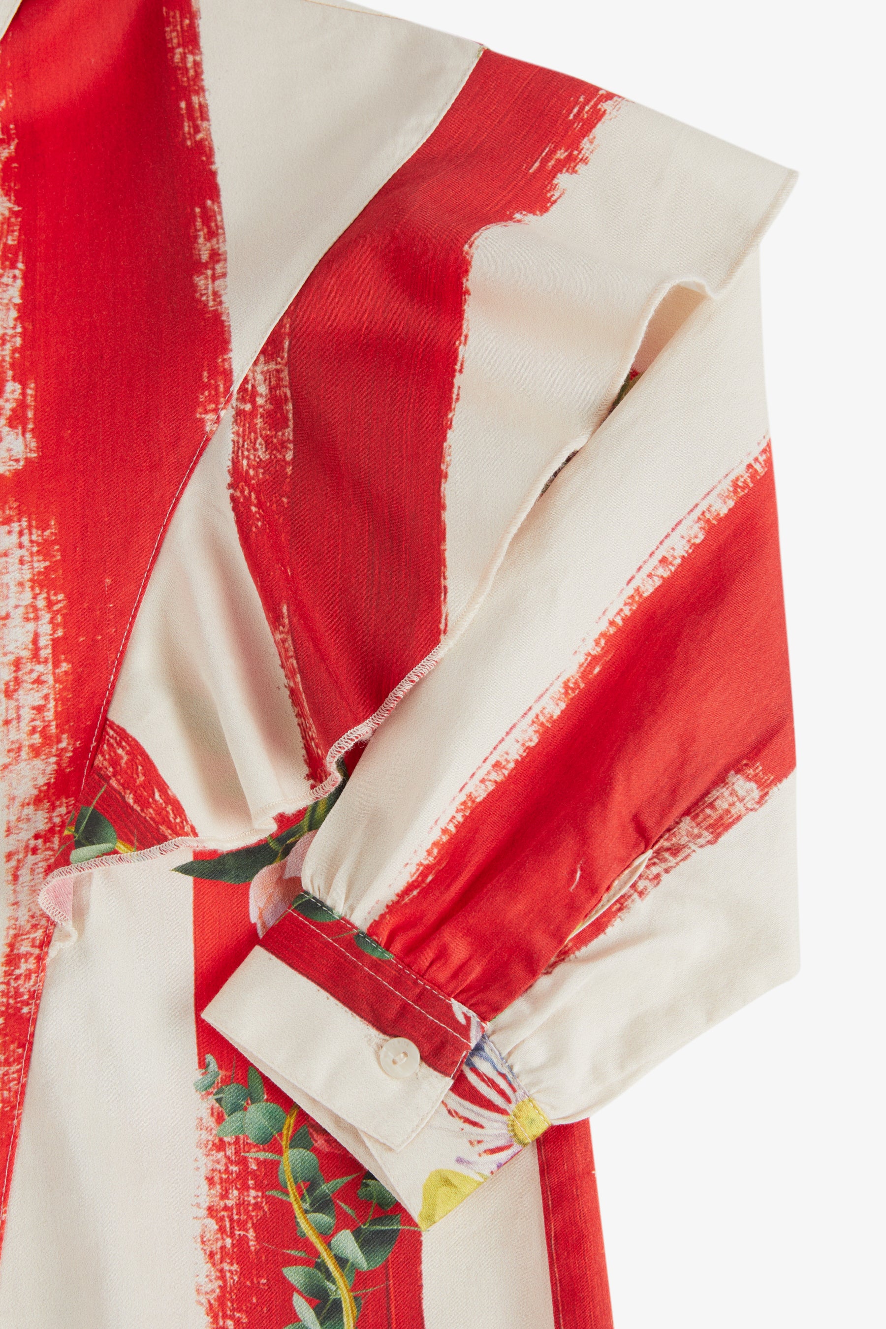 Long sleeved blouse, front buttons, shirt collar, square cuff with buttons, and frill detail