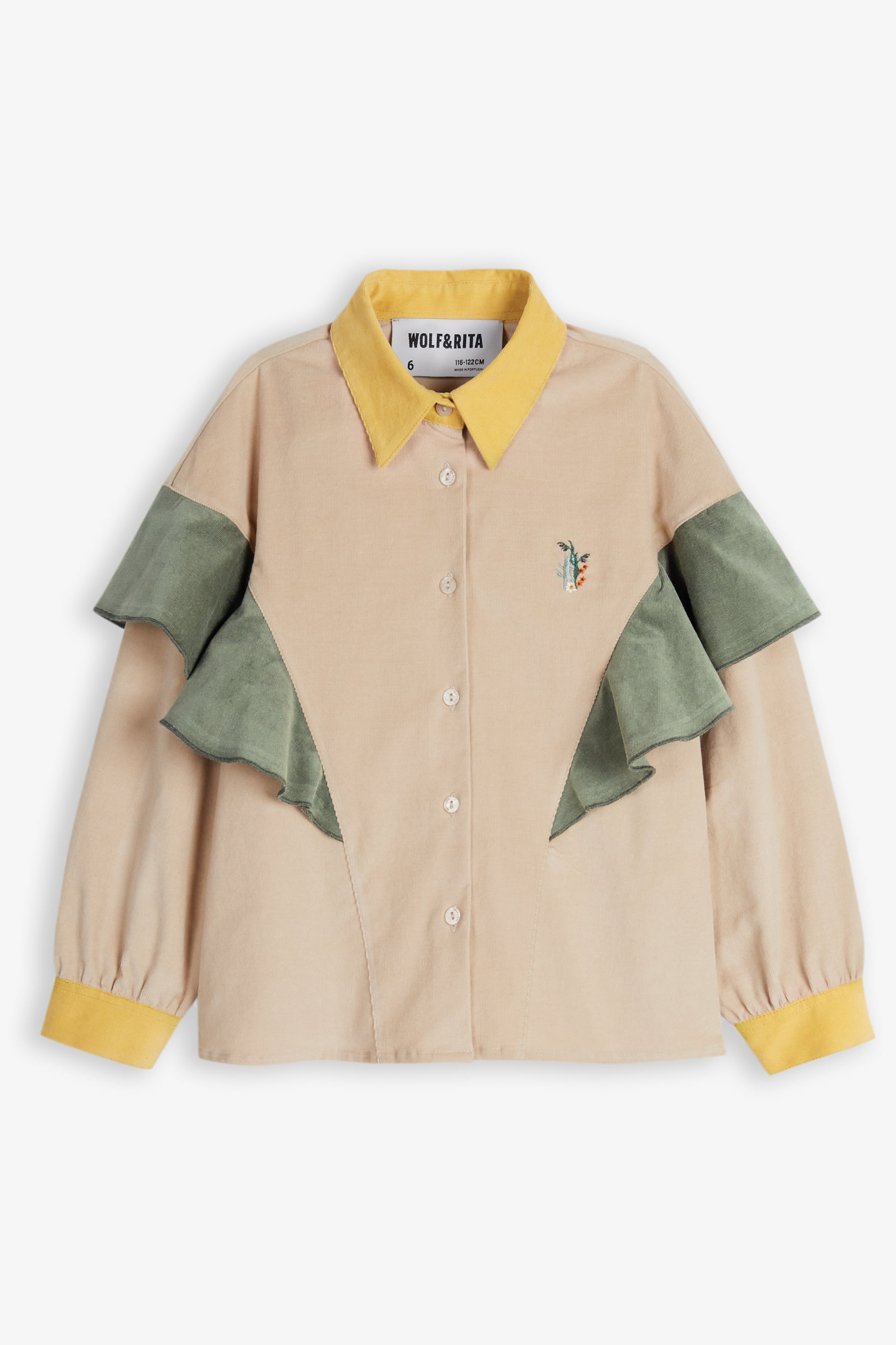 Long sleeved blouse, front buttons, contrasted shirt collar, square contrasted cuff with buttons, contrasted frill detail, and small mascot embroidery