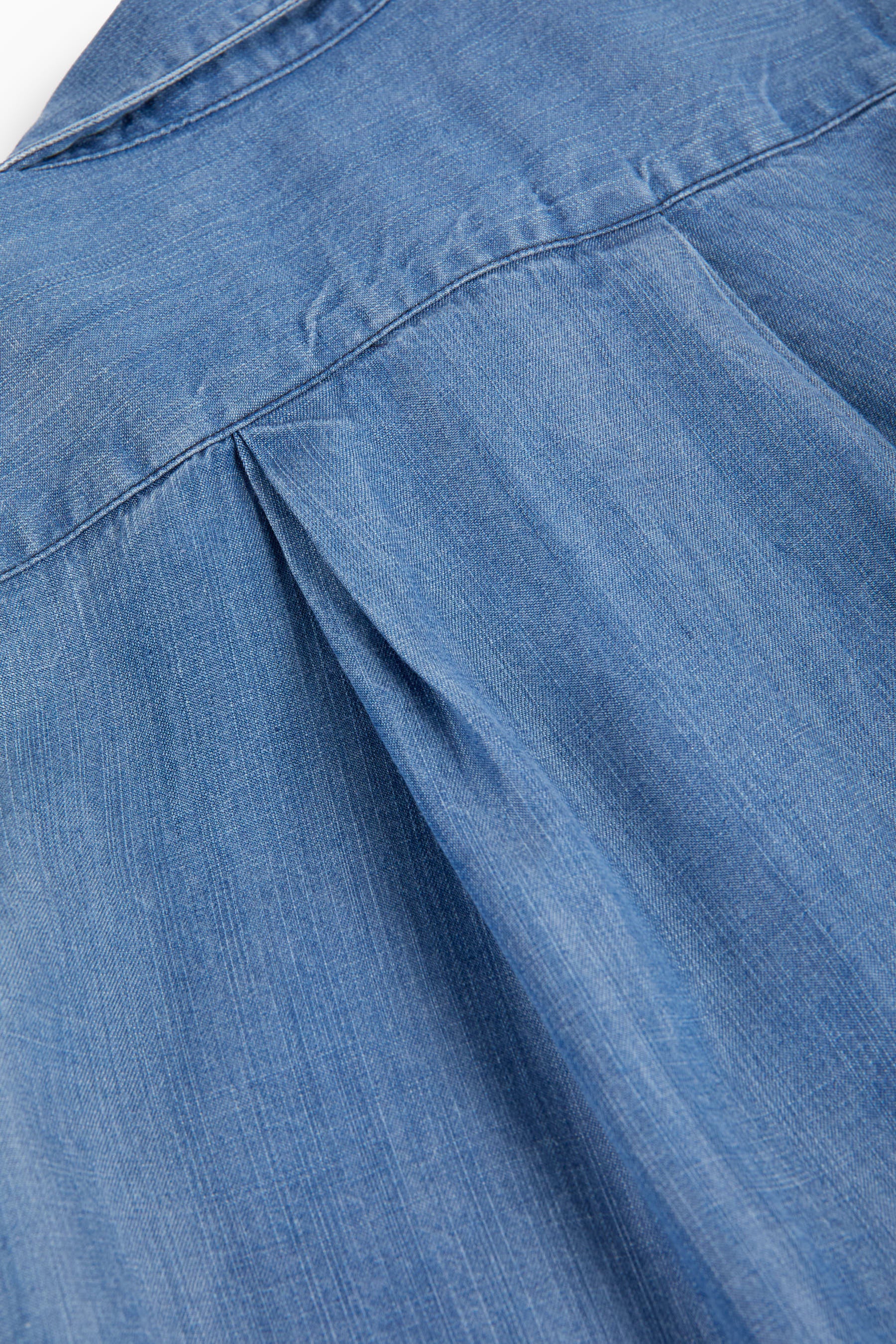 Short sleeved A-line blouse, pointed embroidered collar, two pleats in the back and front buttons