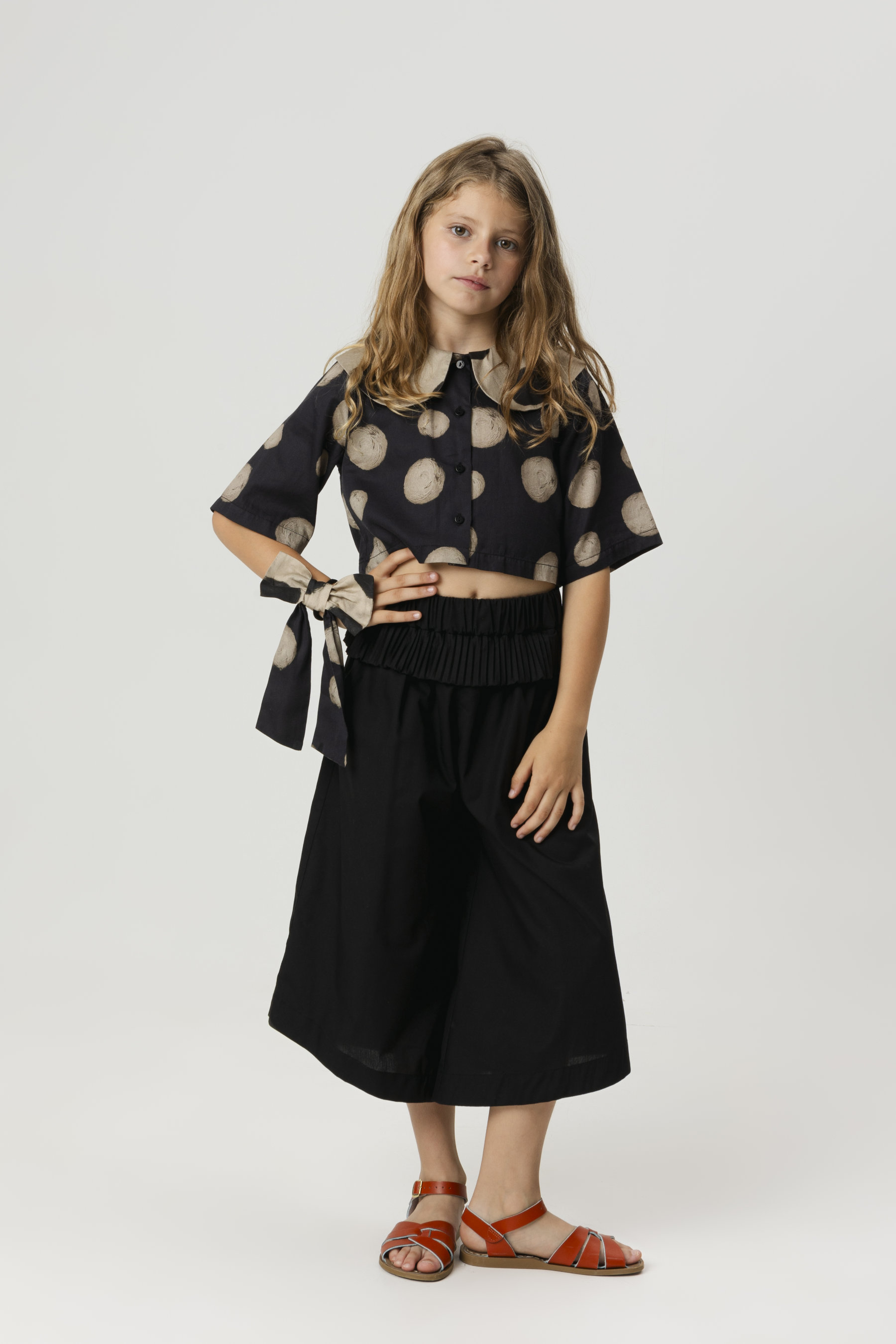 Cropped blouse with short sleeves, contrasted round collar, back pleat, and front buttons