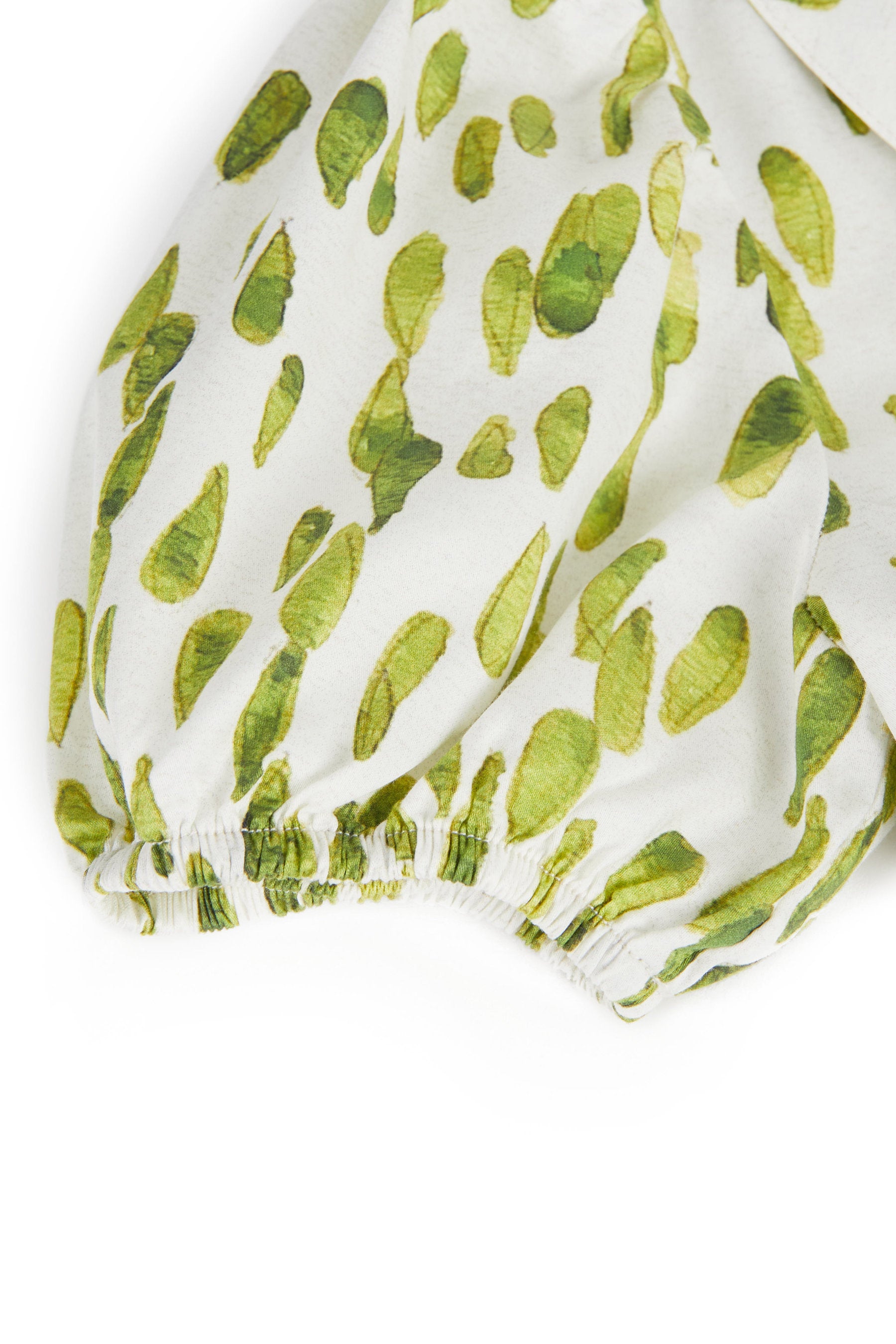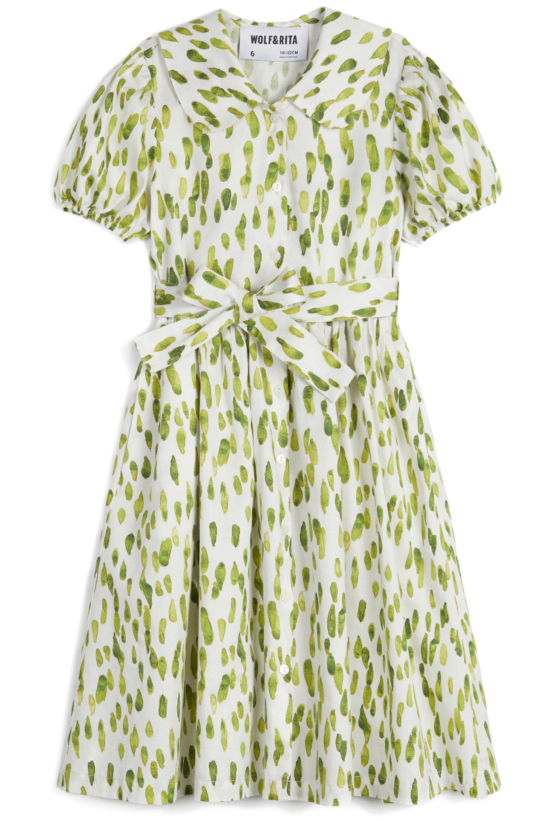 Shirt dress with puff sleeves, Peter Pan collar, front buttons, belt and inner side pockets. 100% CO