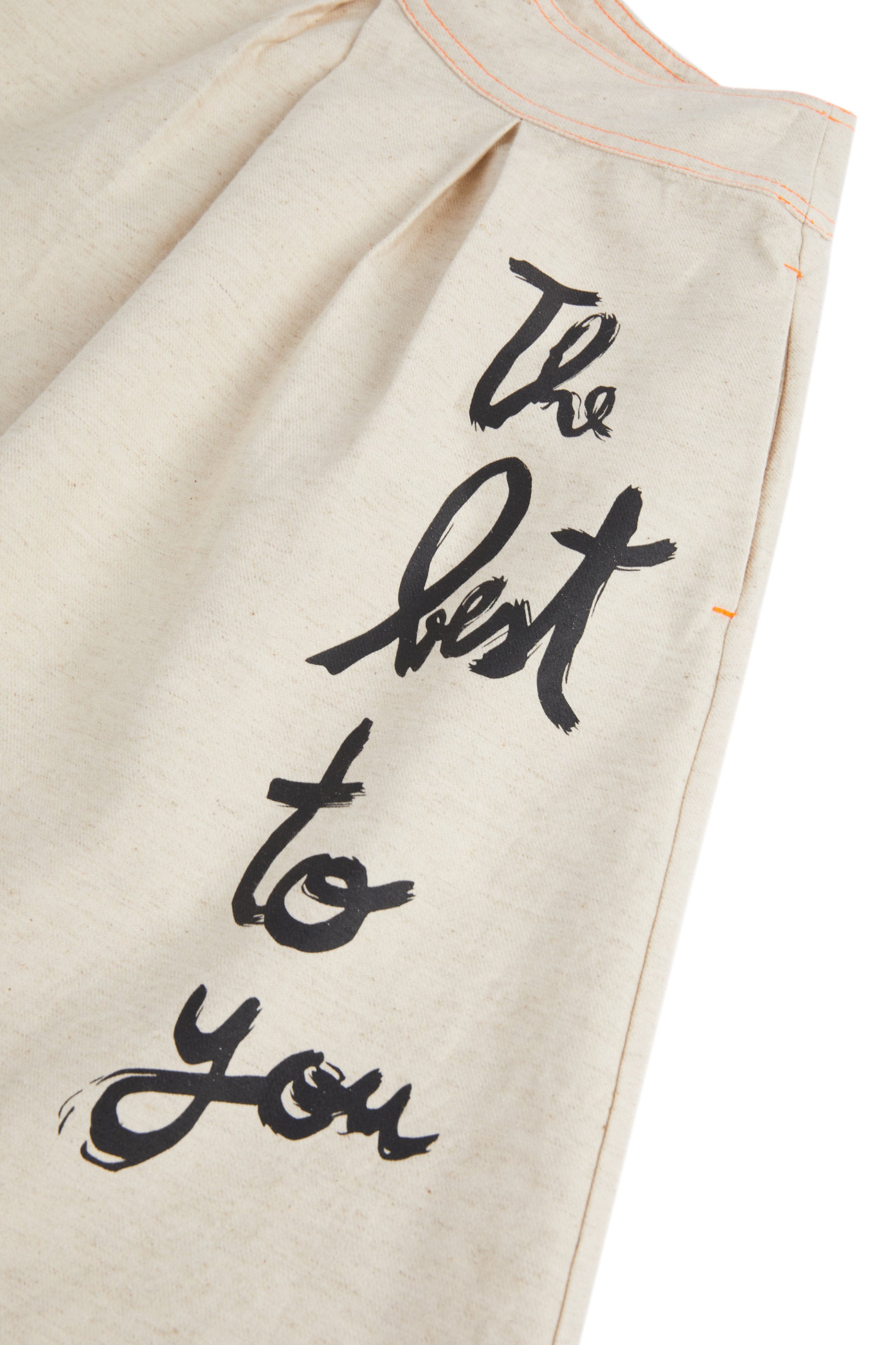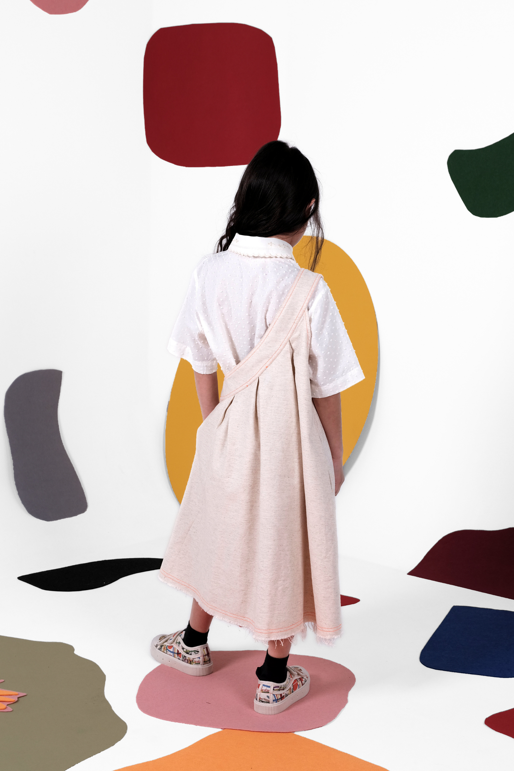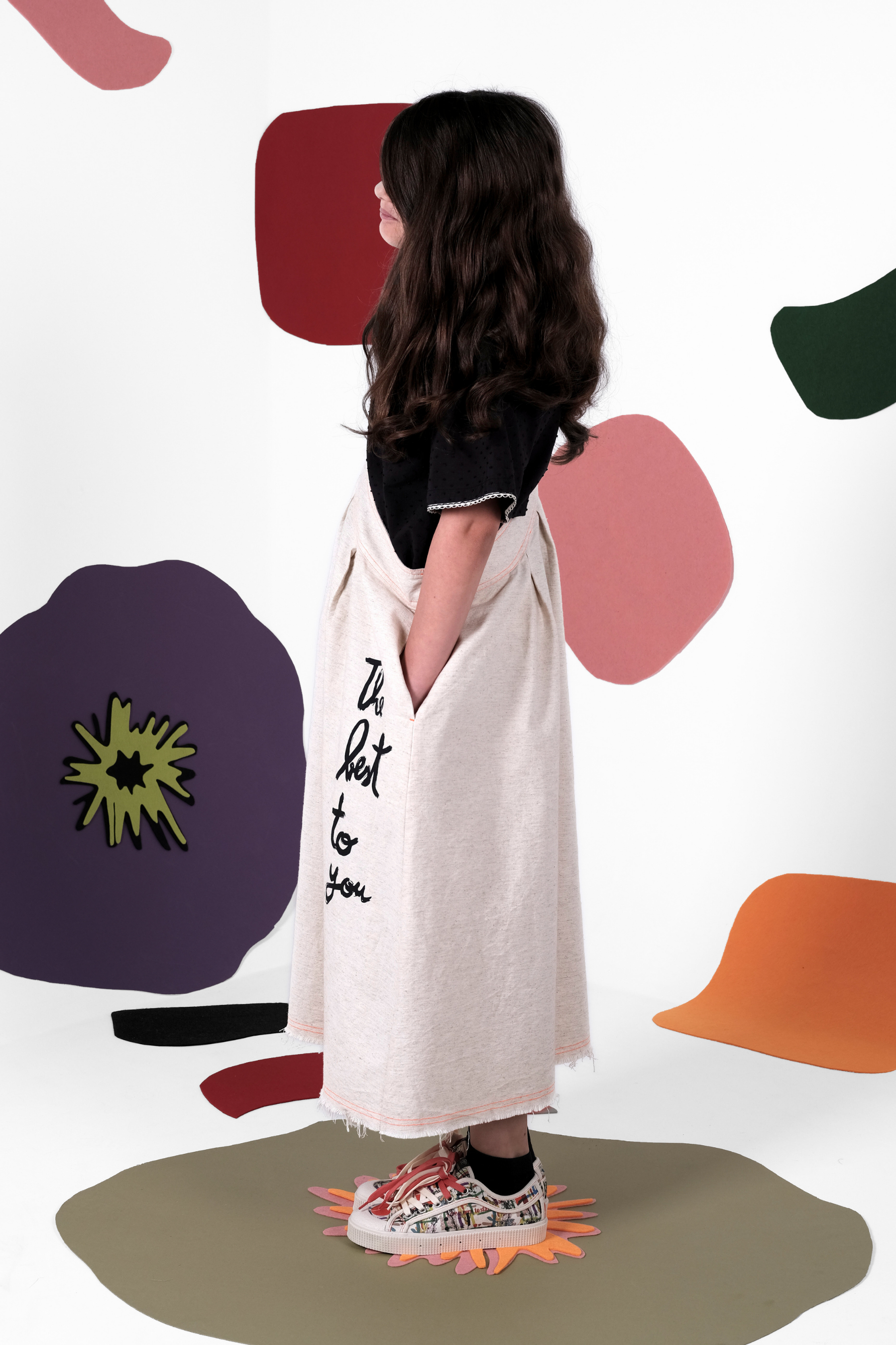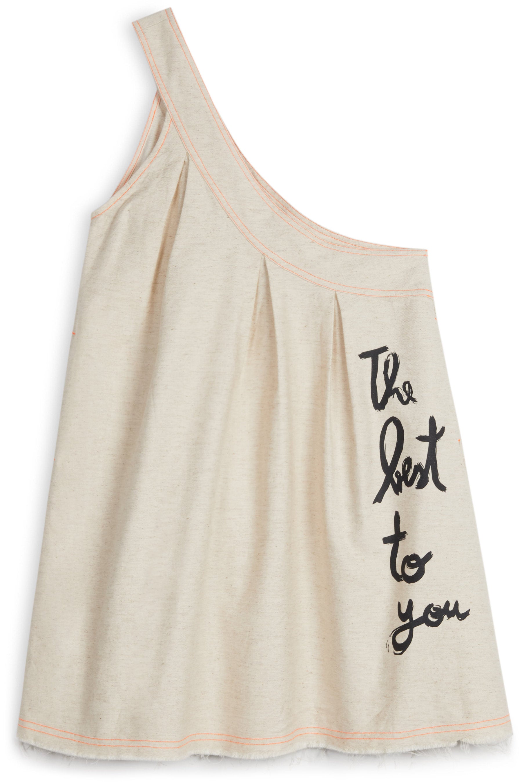 A-line skirt, asymmetric (over one shoulder), with print, contrasted stitches, raw hem and inner side pockets
