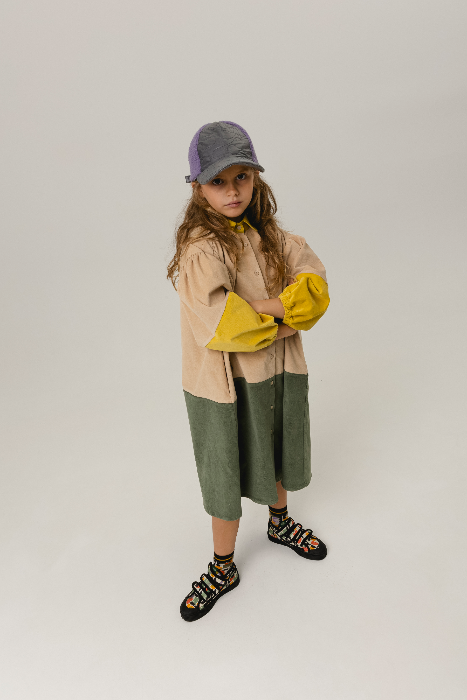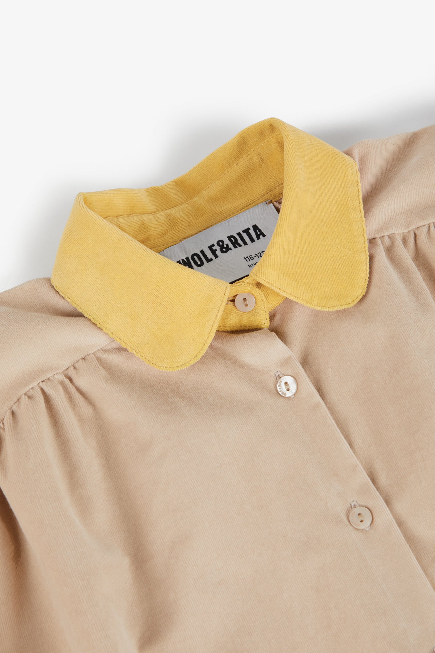 Long sleeved trapeze dress, oversized, gathered detail on shoulders, front buttons, seam pockets, contrasted round collar, elastic cuffs, and contrasted details