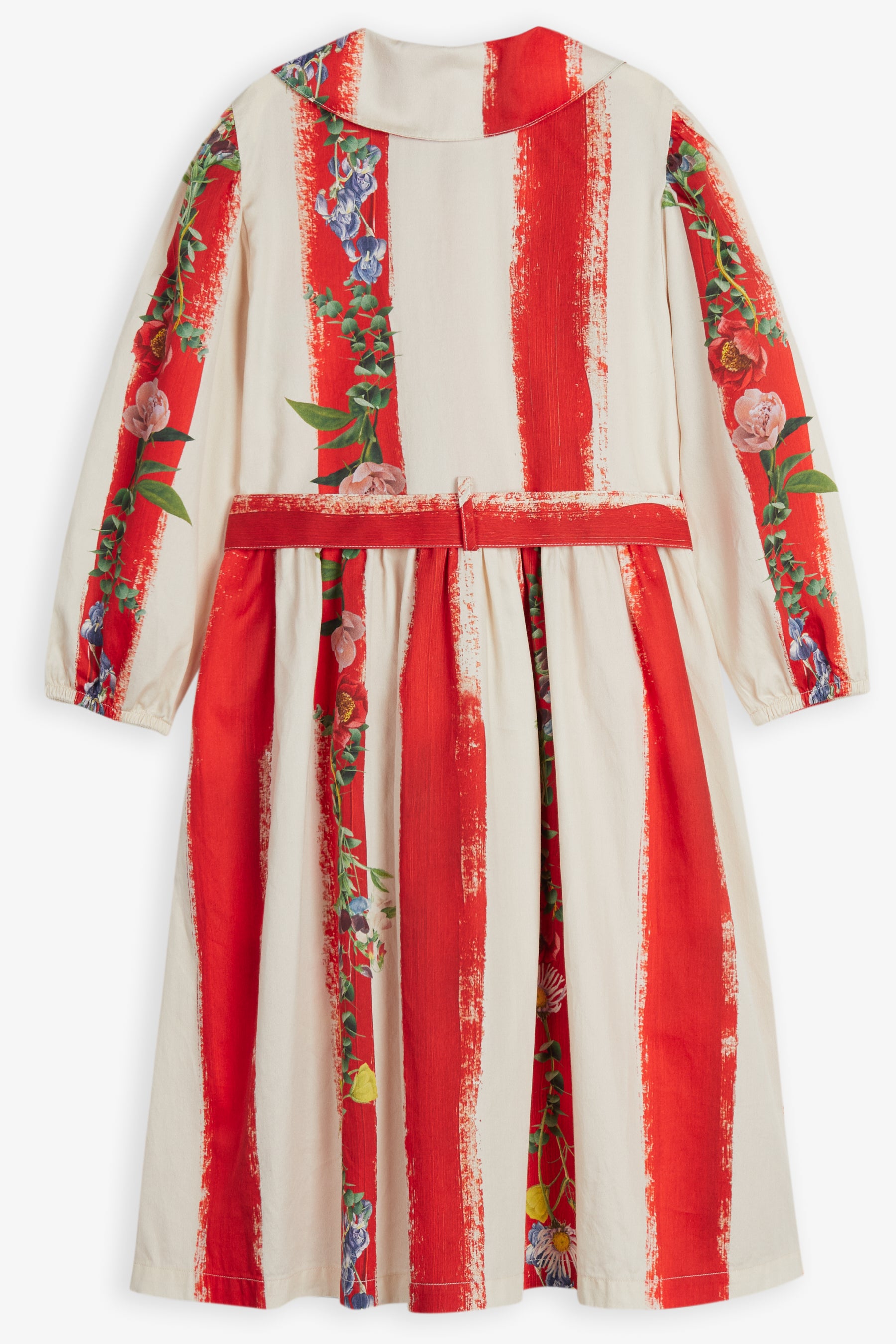 Long sleeved shirt dress, front buttons, round collar, seam pockets, belt, and elastic cuffs