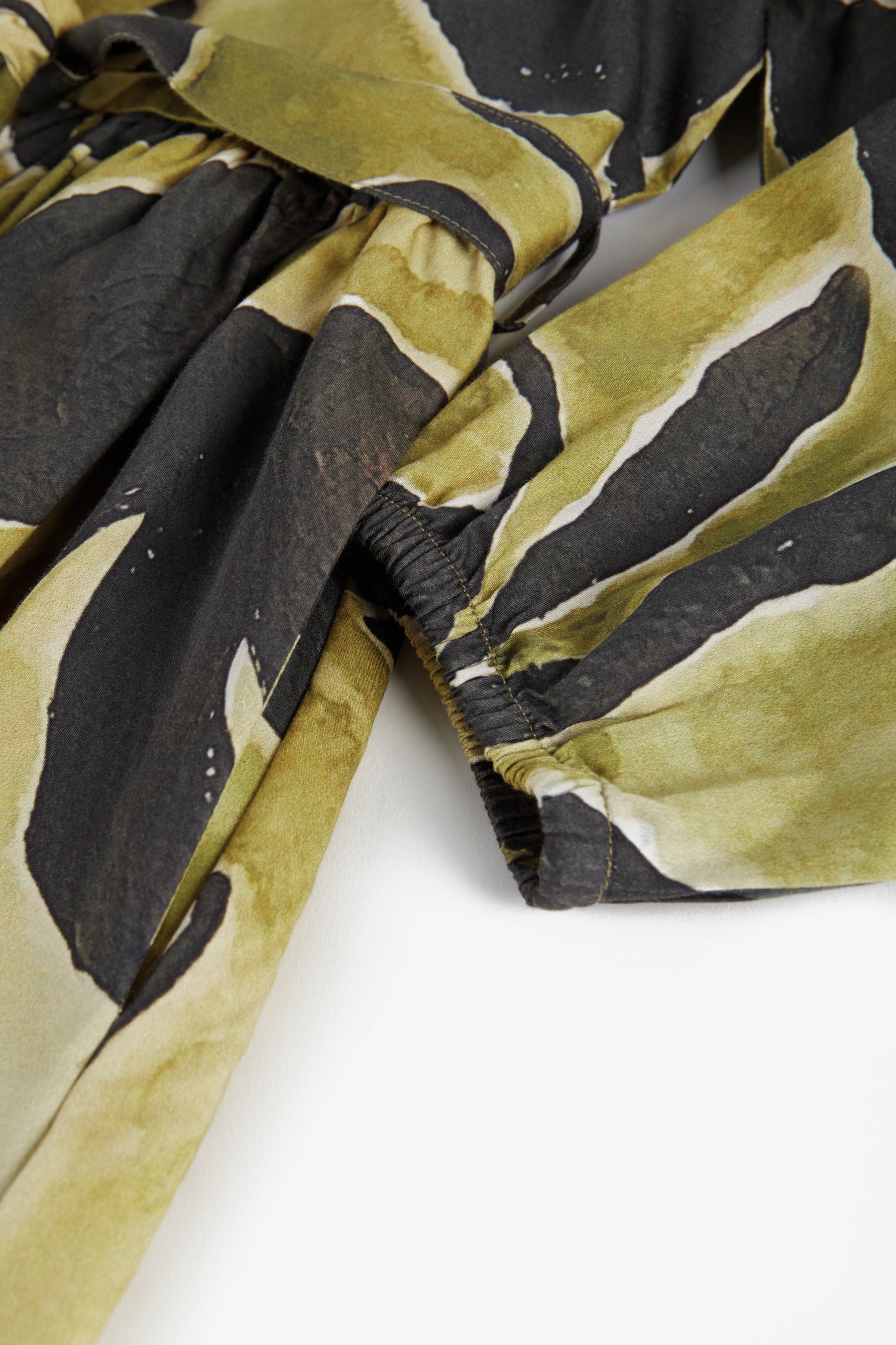 Long sleeved shirt dress, front buttons, round collar, seam pockets, belt, and elastic cuffs