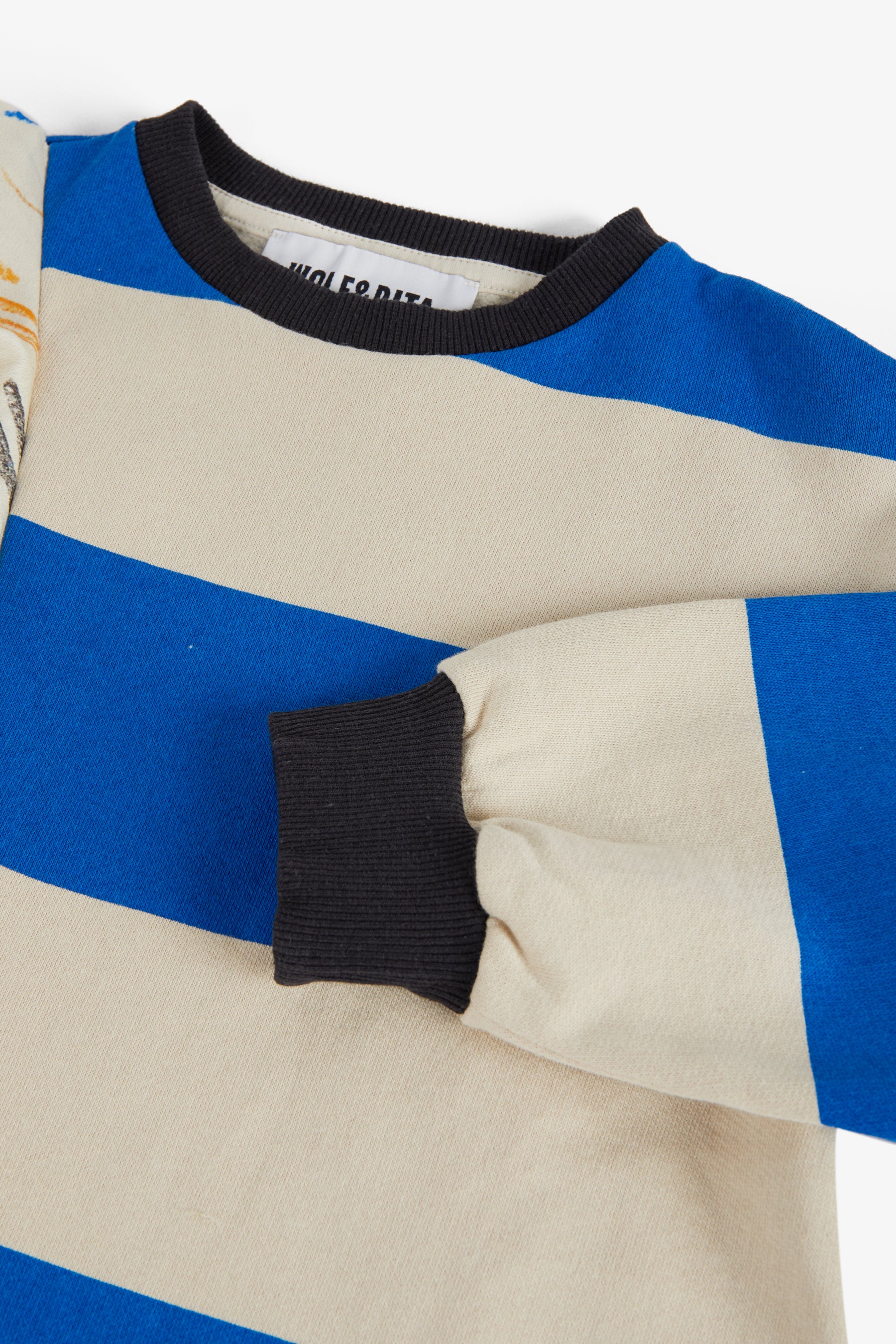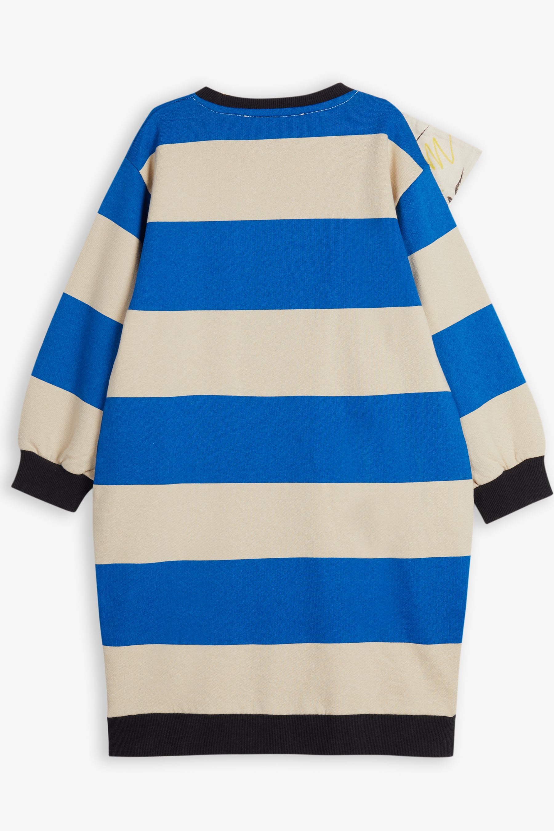 Long sleeved cocoon dress, contrasted cuffs and collar, contrasted frill from shoulder