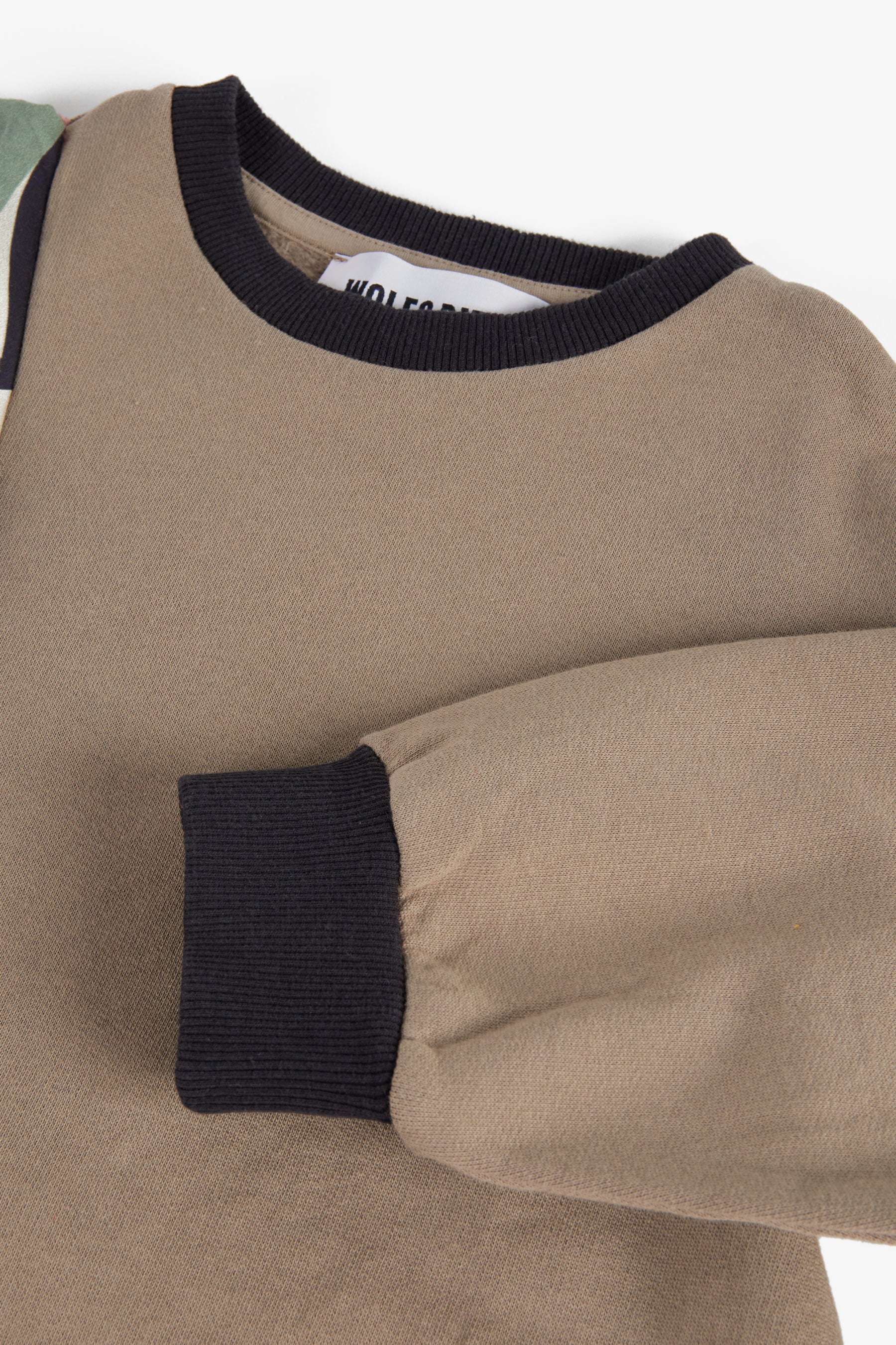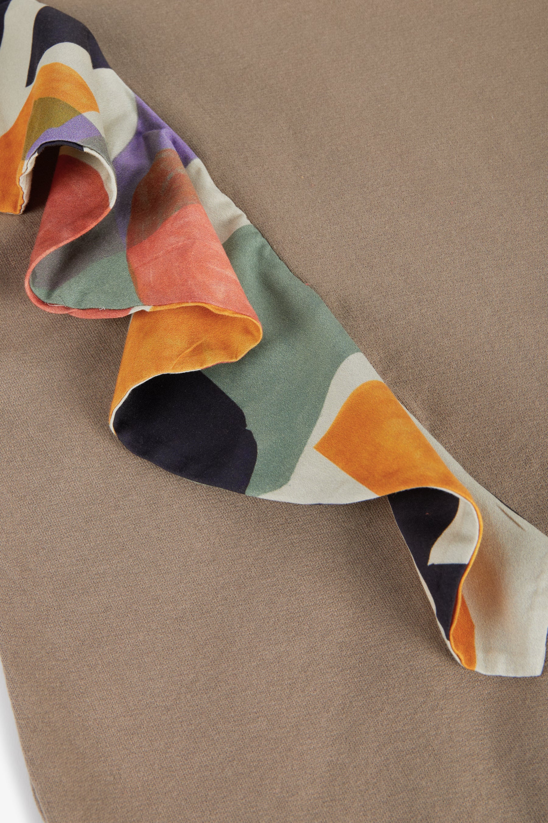 Long sleeved cocoon dress, contrasted cuffs and collar, contrasted frill from shoulder