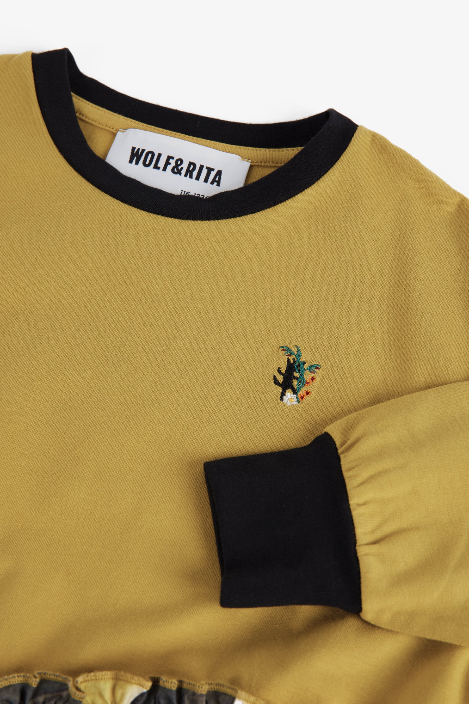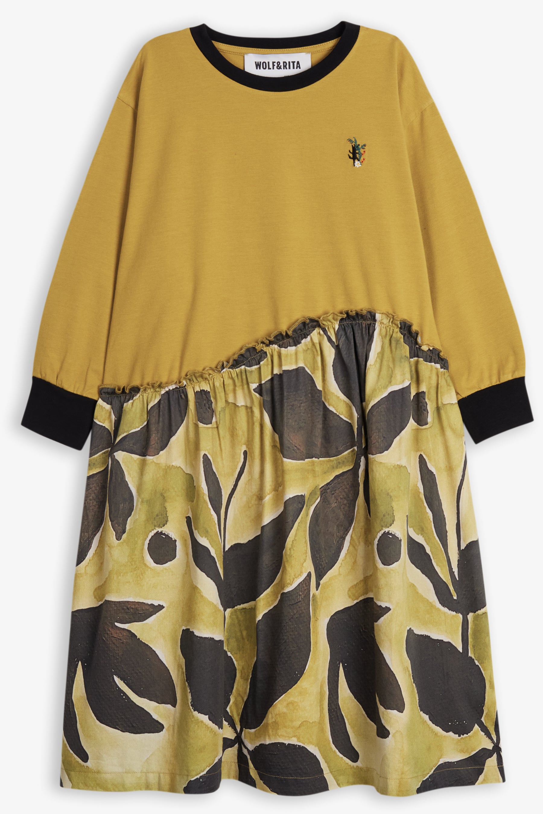 Panelled dress, gathered skirt, asymmetric waistline, contrasted cuffs and collar, small embroidery