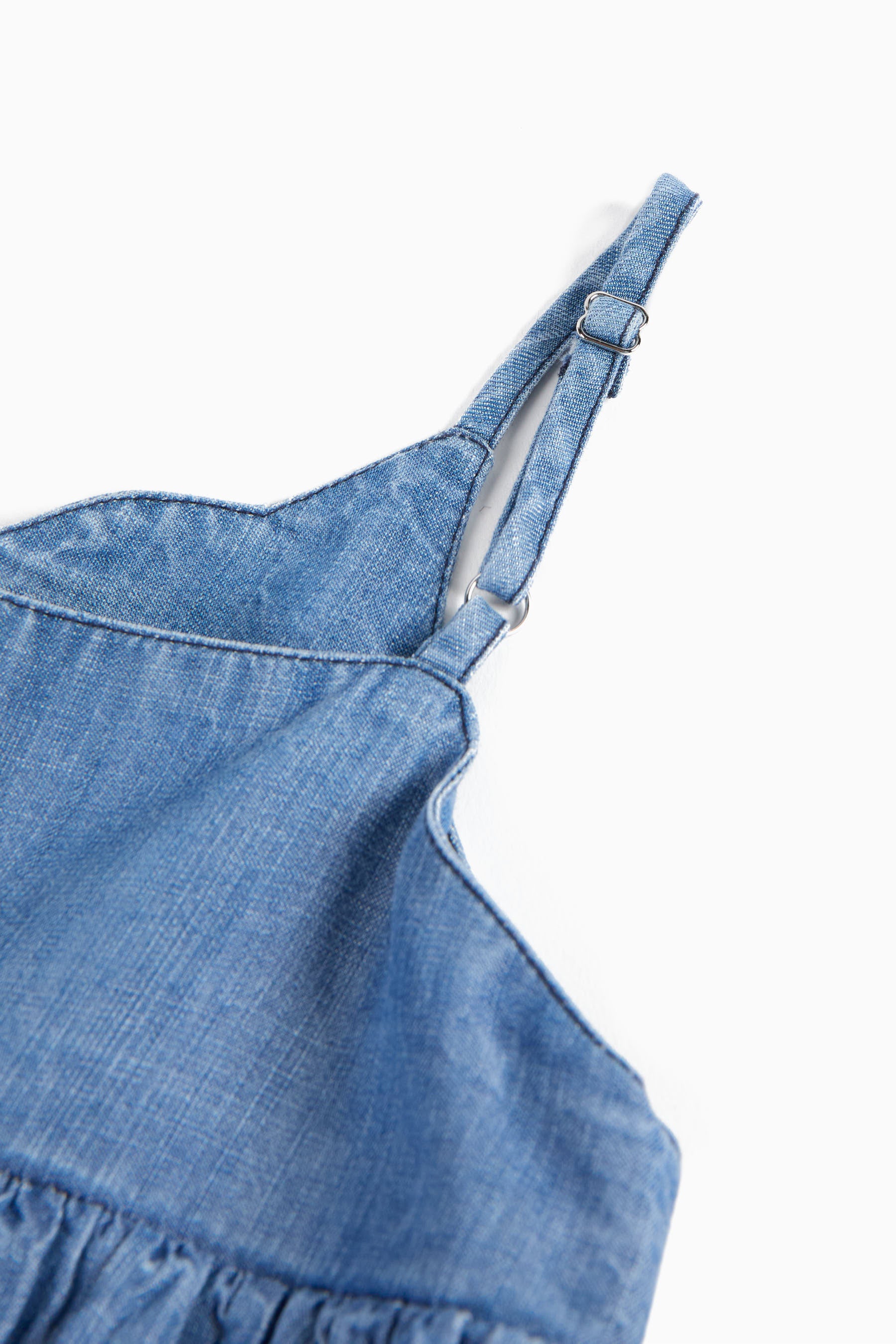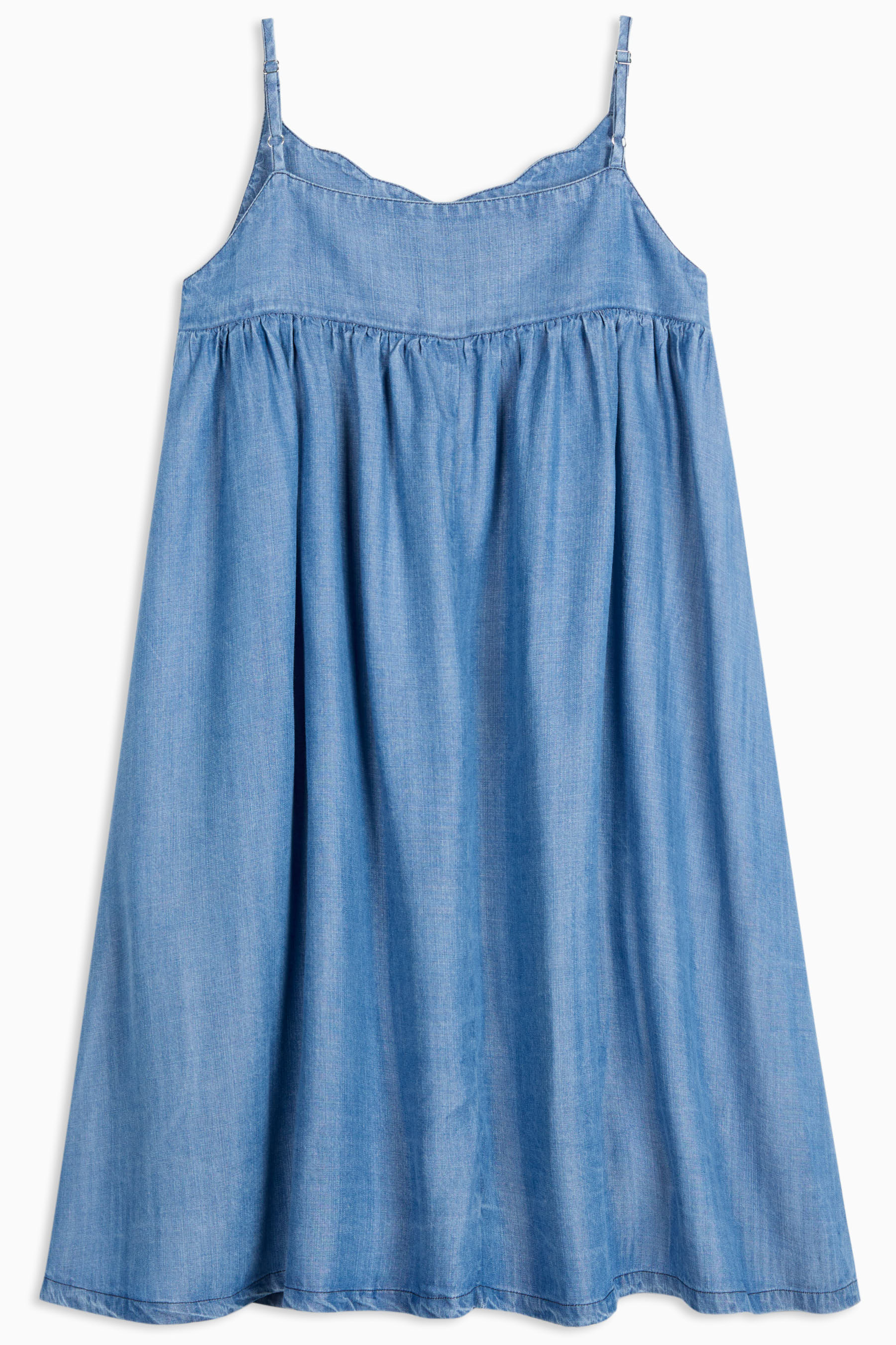 Sundress with thin adjustable straps, scalloped neckline, seam pockets, and embroidery