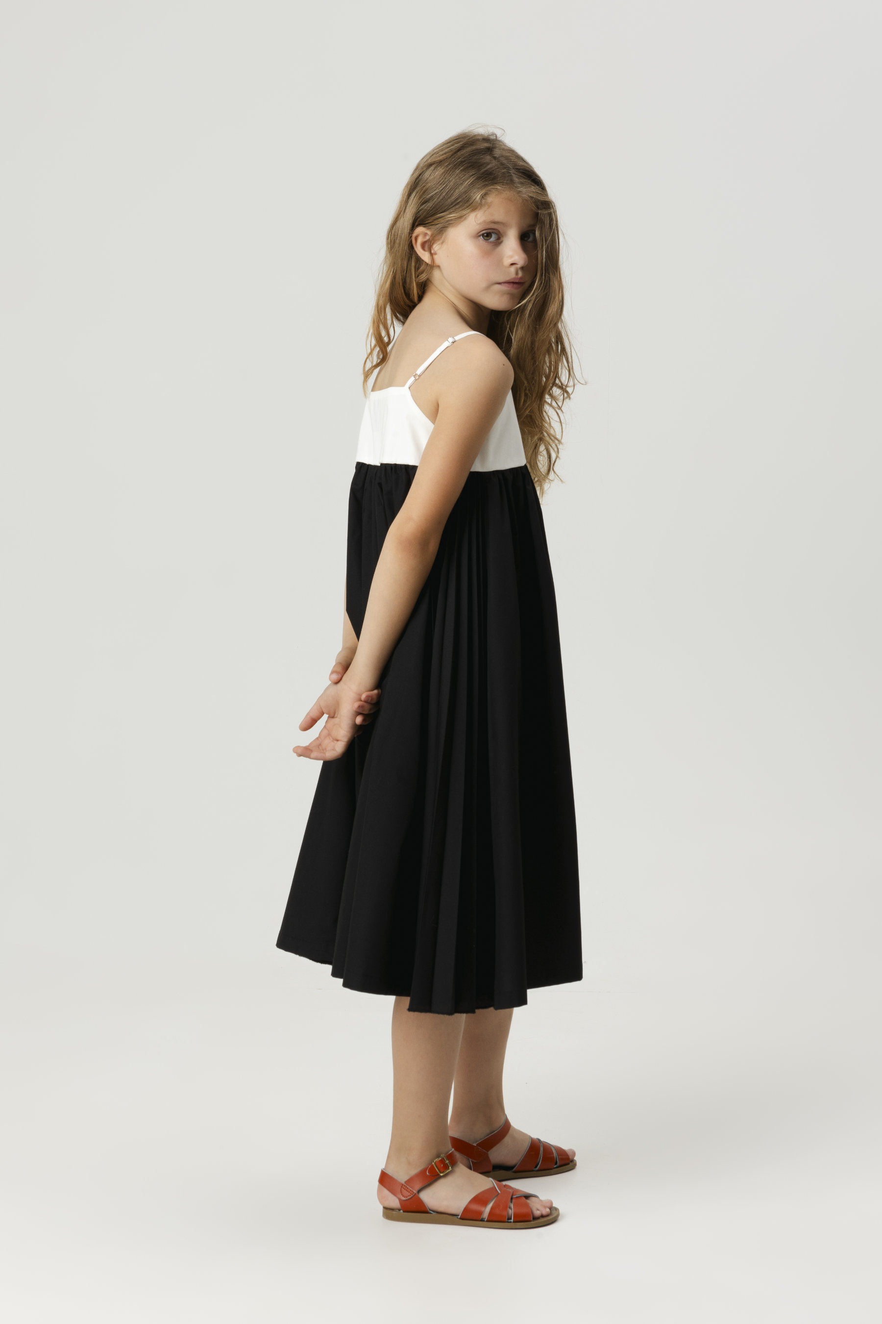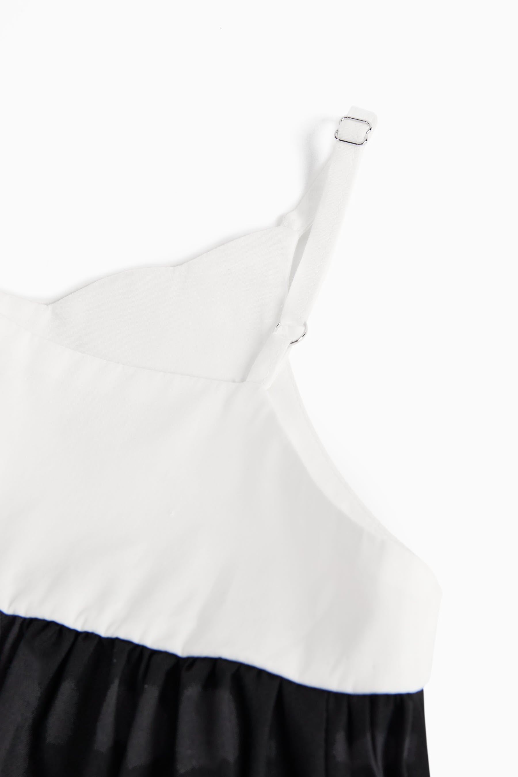 Sundress with pleated fabric panel on both sides, thin adjustable straps and contrasted top with scalloped neckline