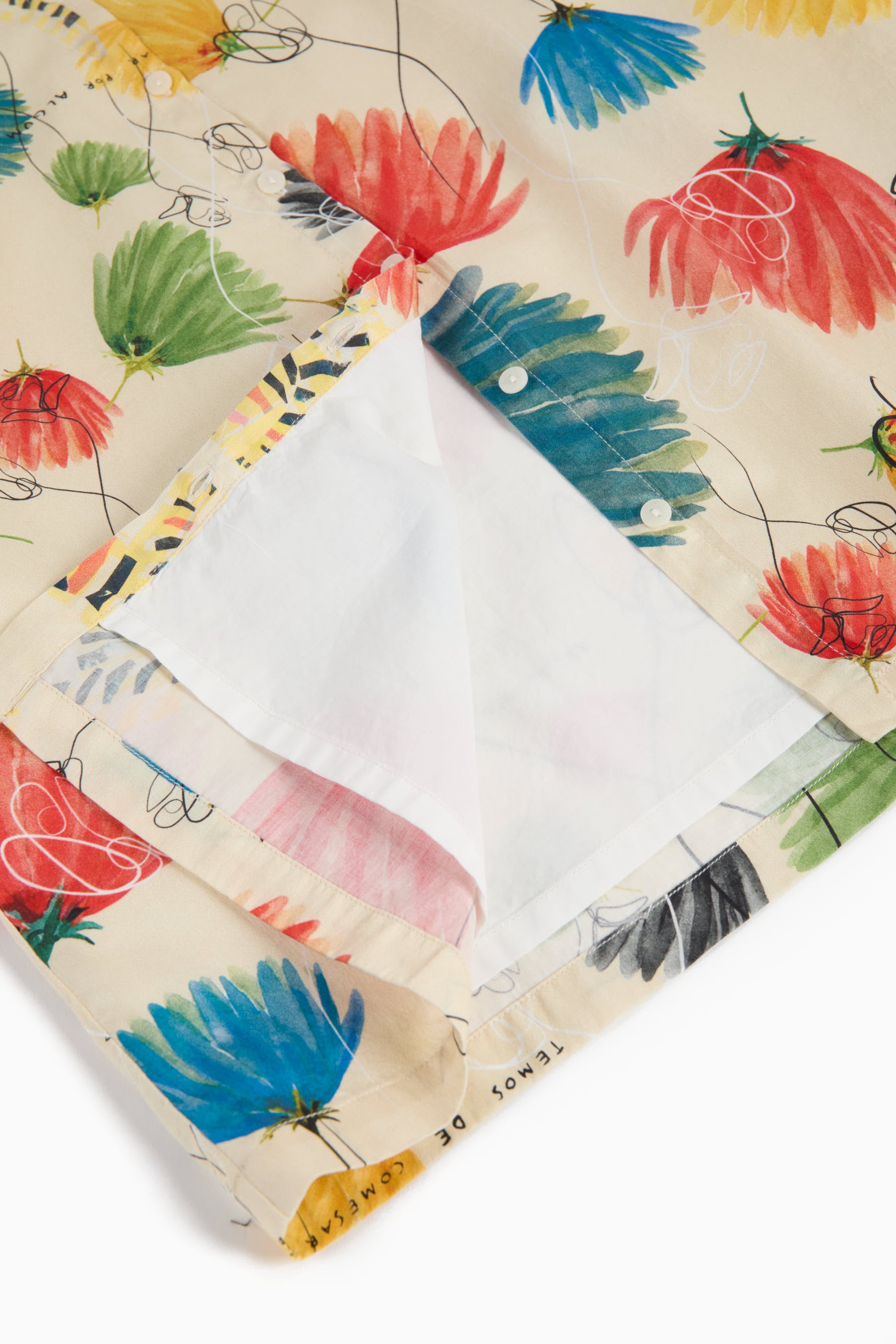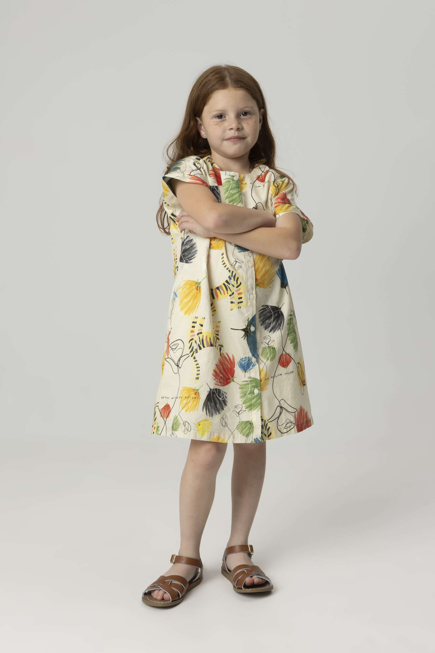 Short sleeved below-the-knee dress, boxy oversized fit, with seam pockets and front buttons