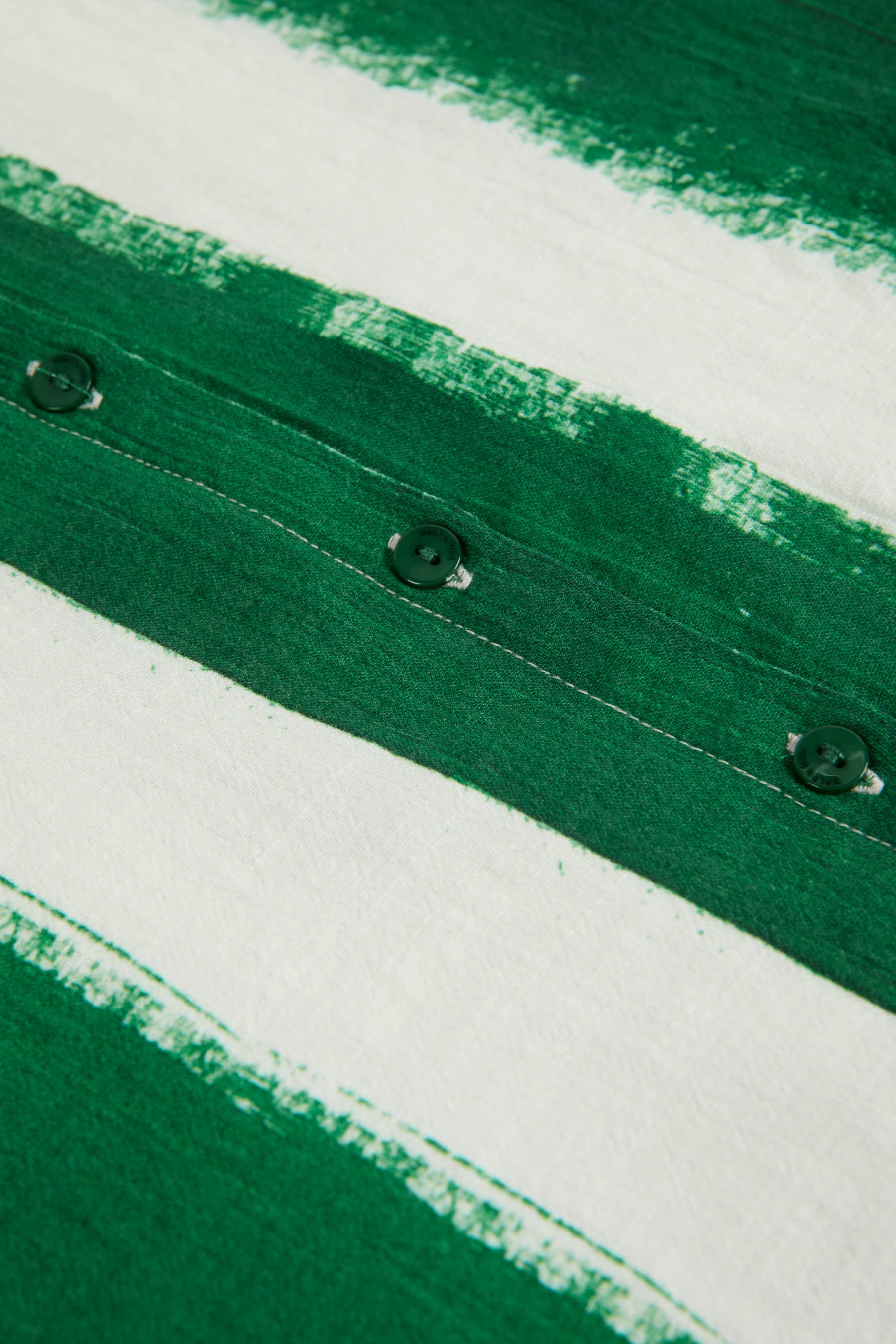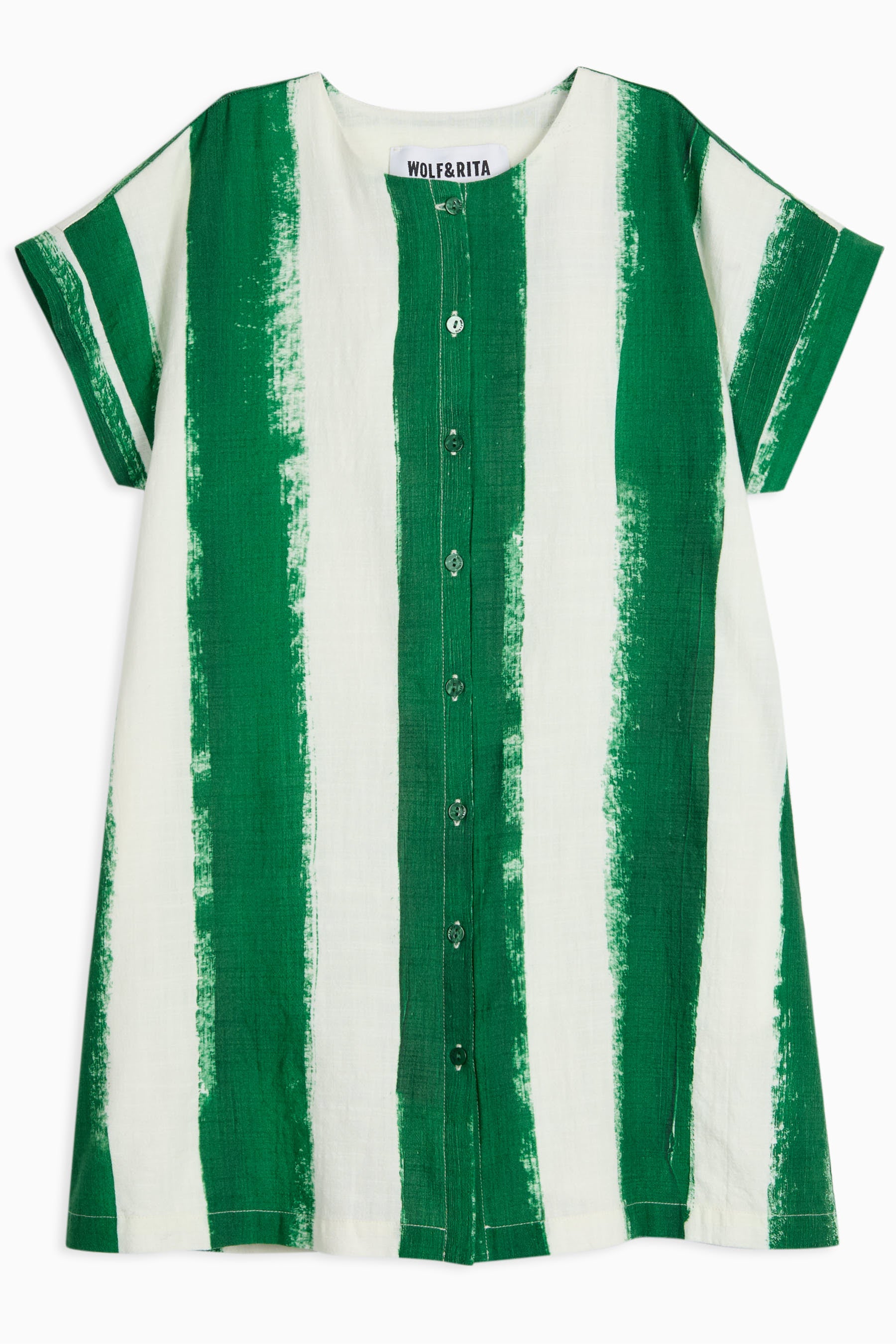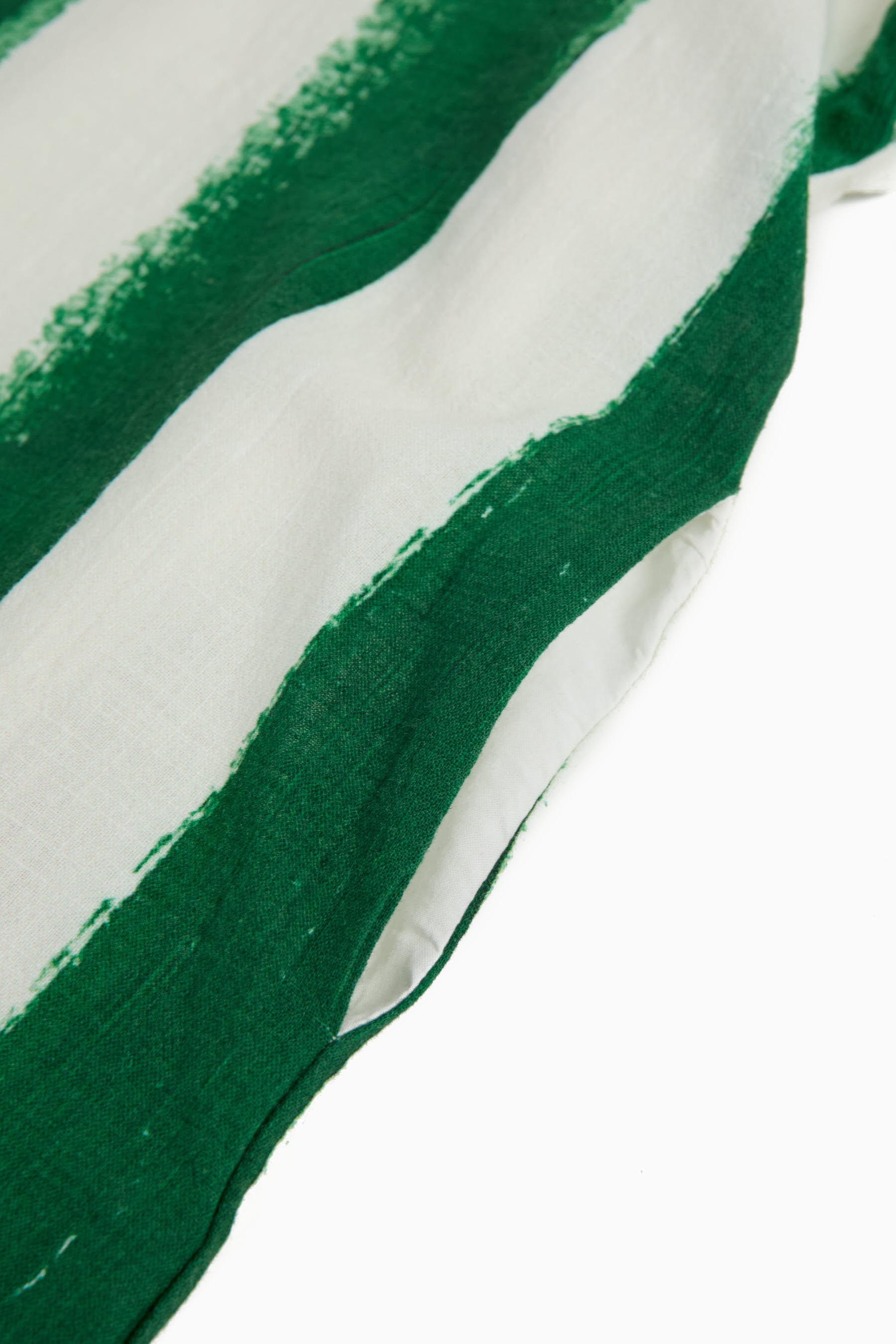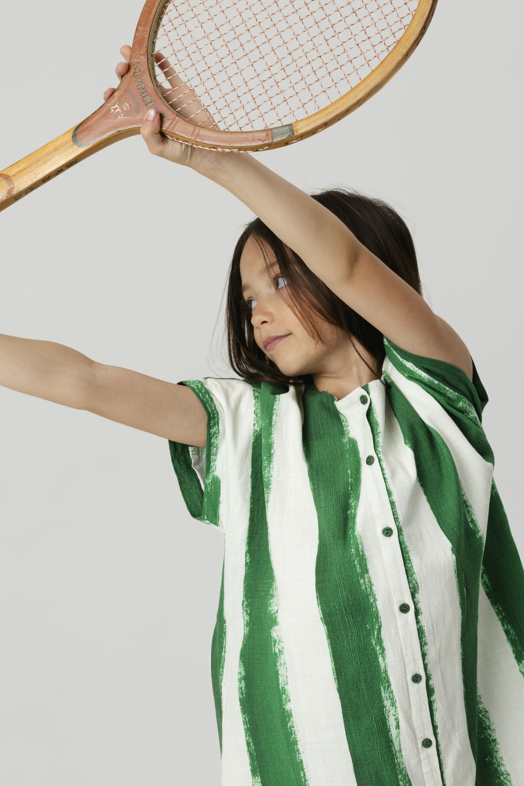 Short sleeved below-the-knee dress, boxy oversized fit, with seam pockets and front buttons