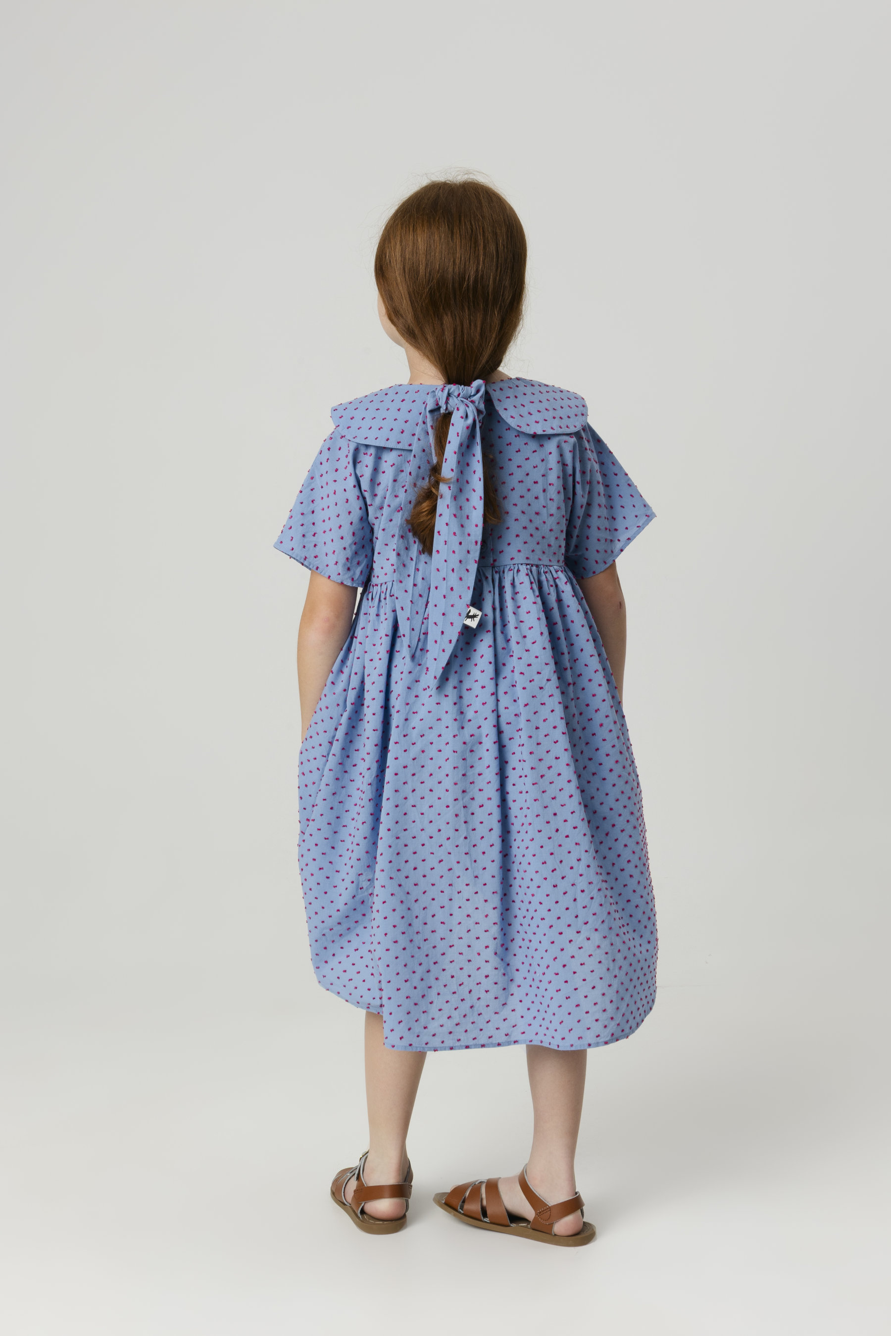 Dress with wide short sleeves, oversized pointed collar, gathered skirt with longer back, and back buttons