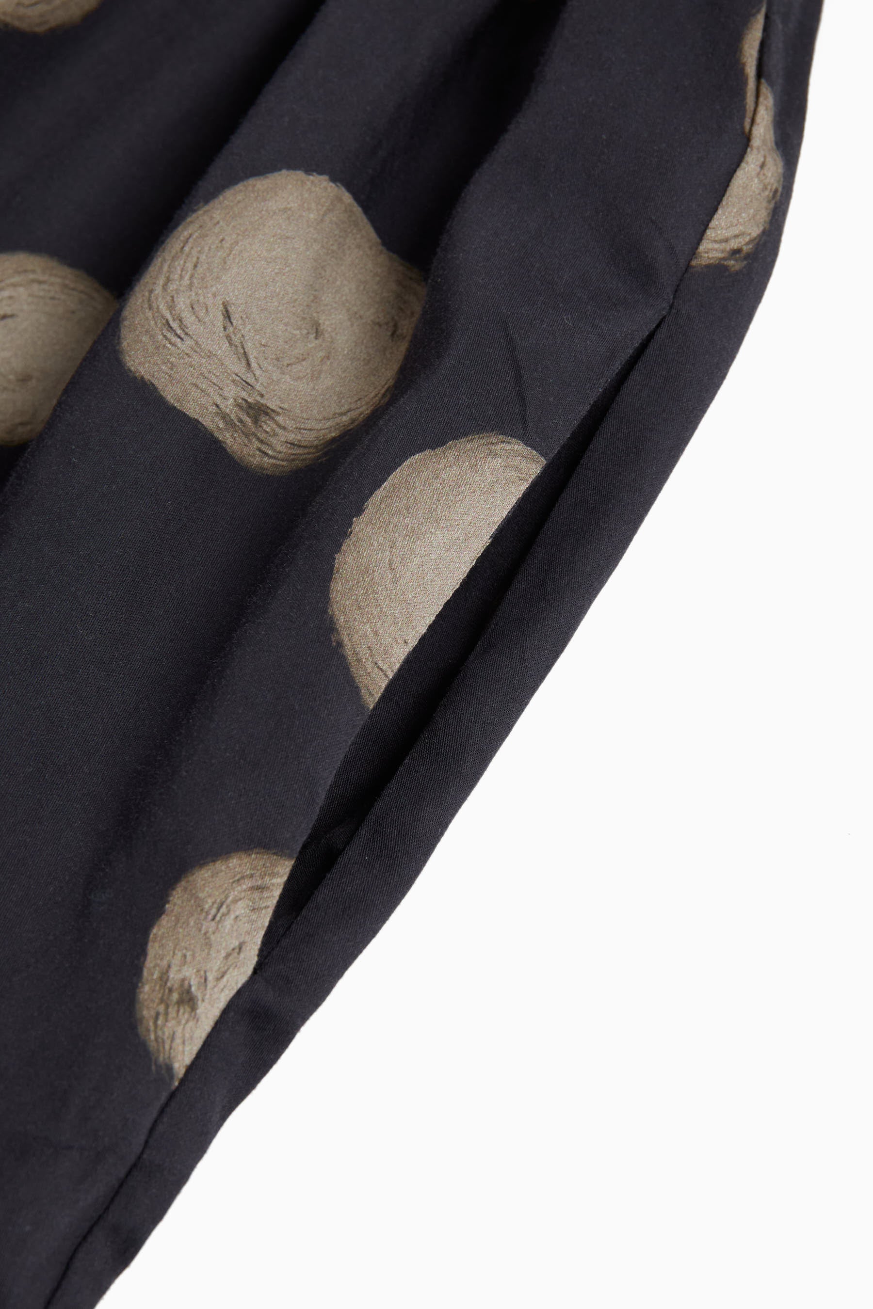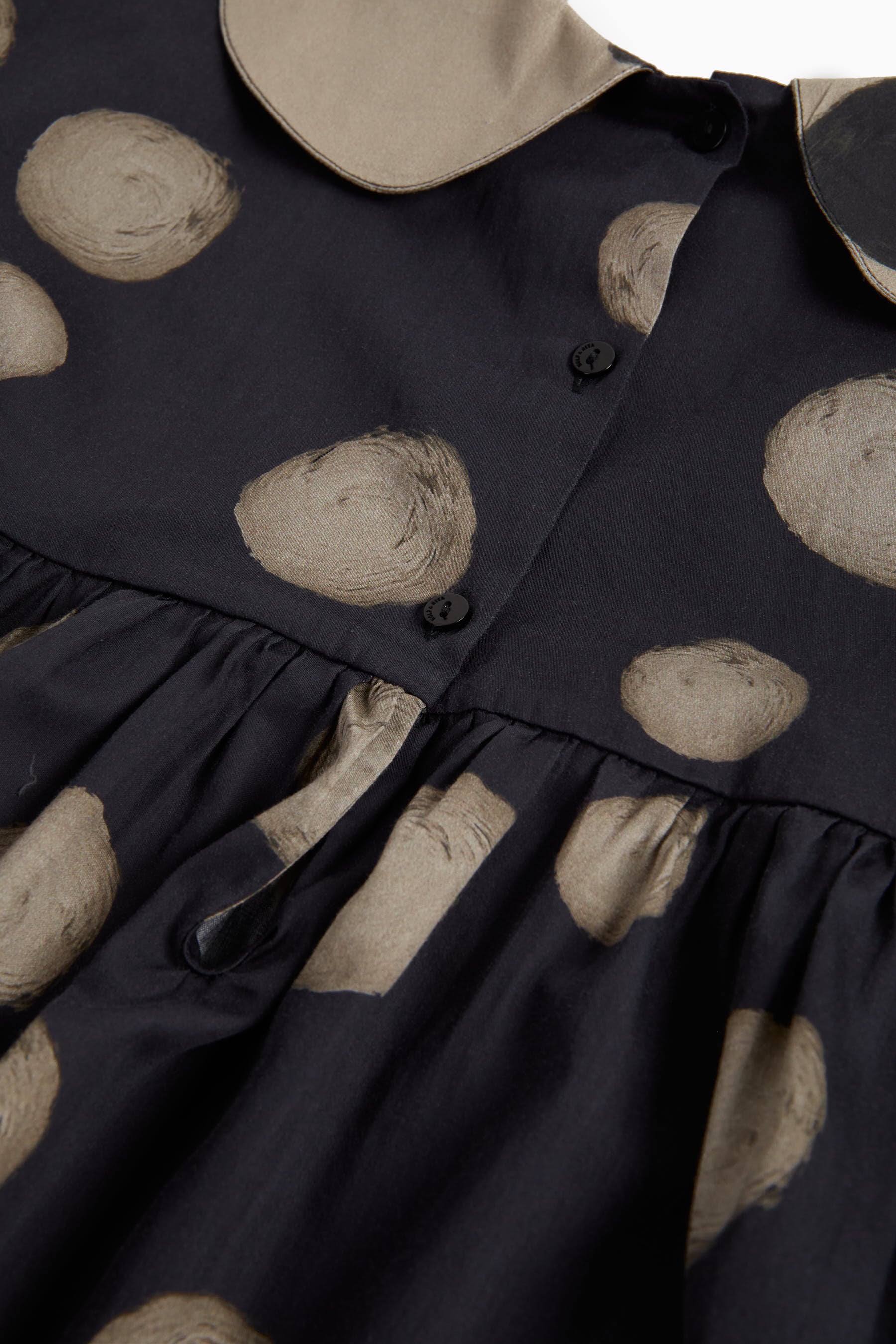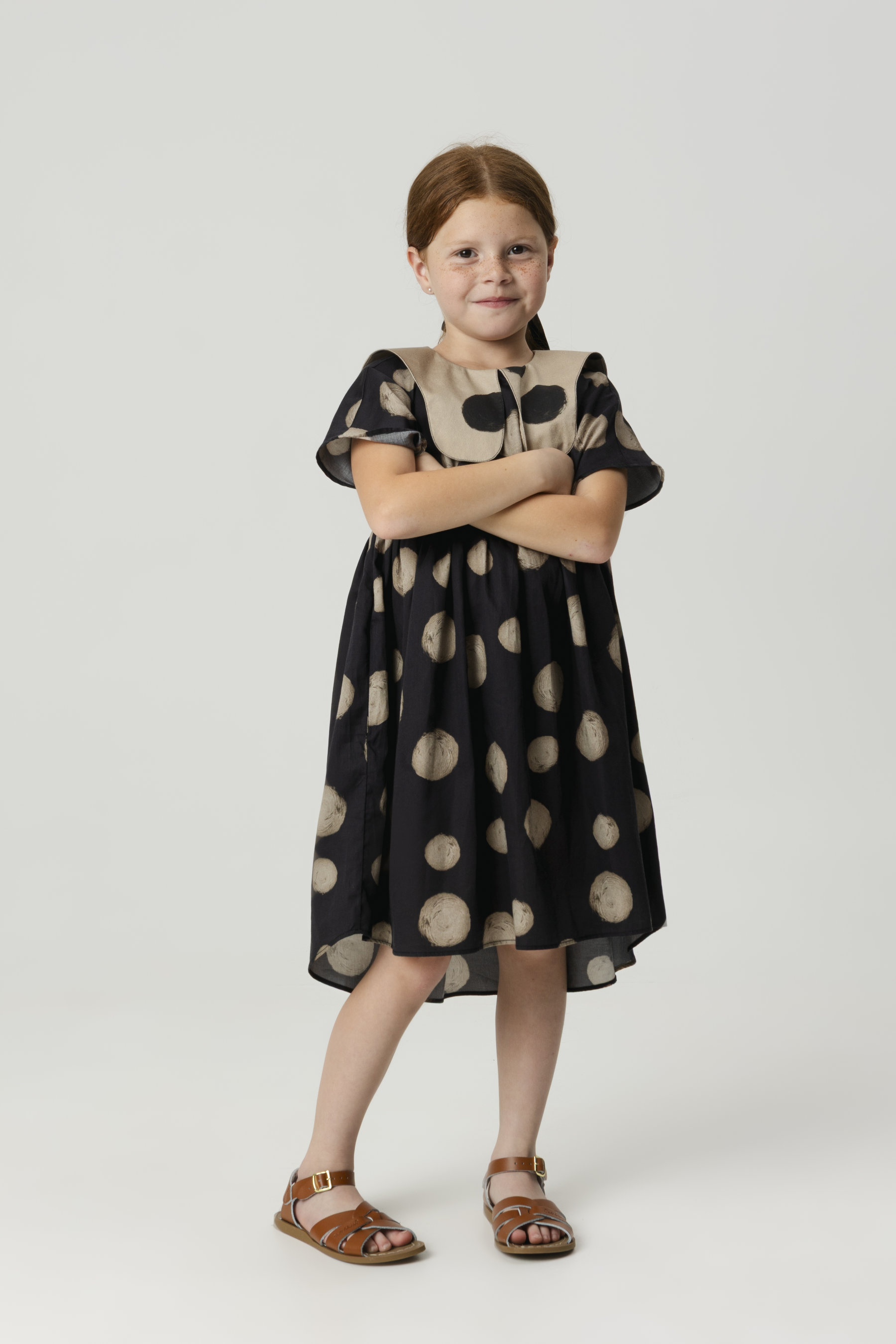 Dress with wide short sleeves, contrasted and oversized pointed collar, gathered skirt with longer back, and back buttons
