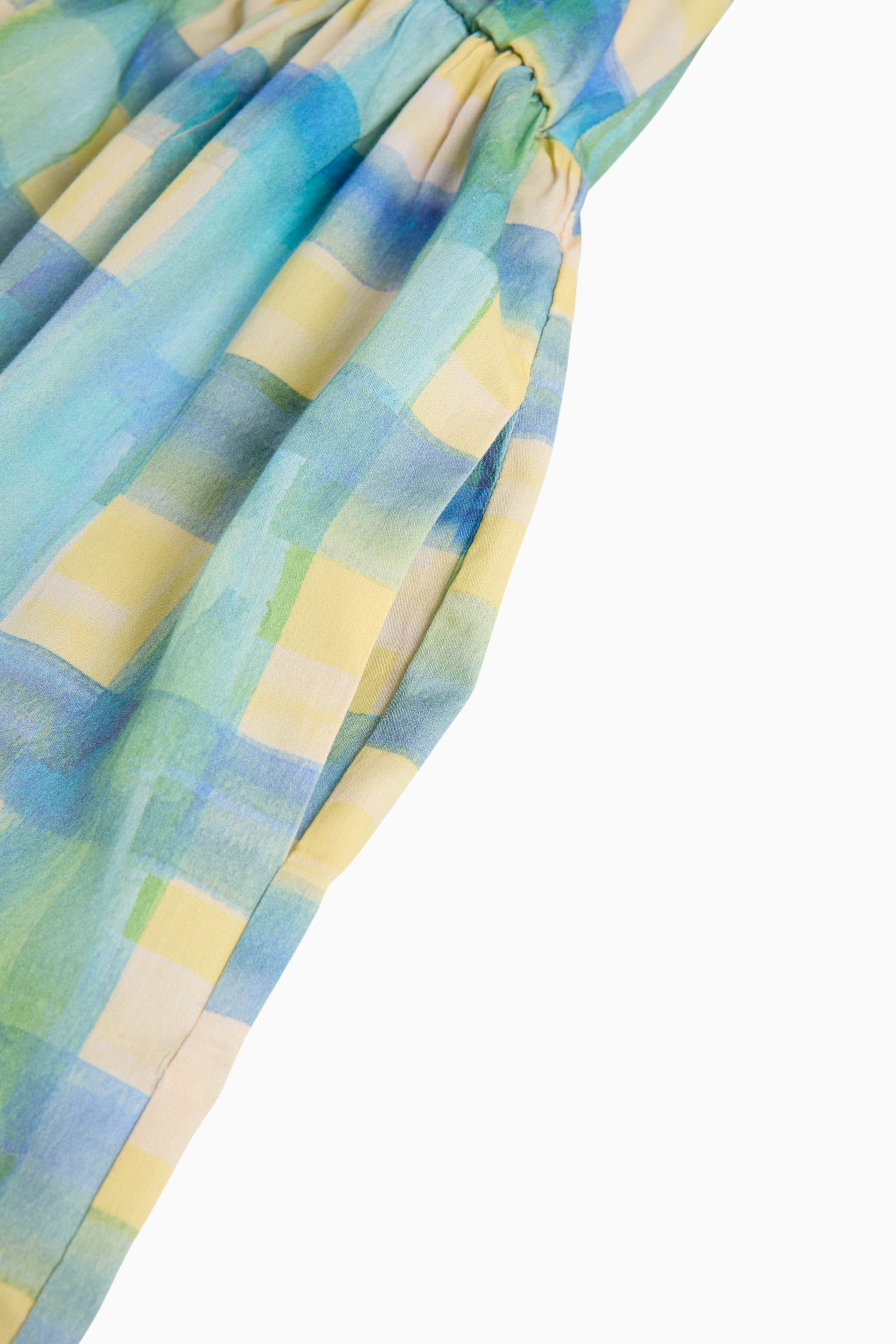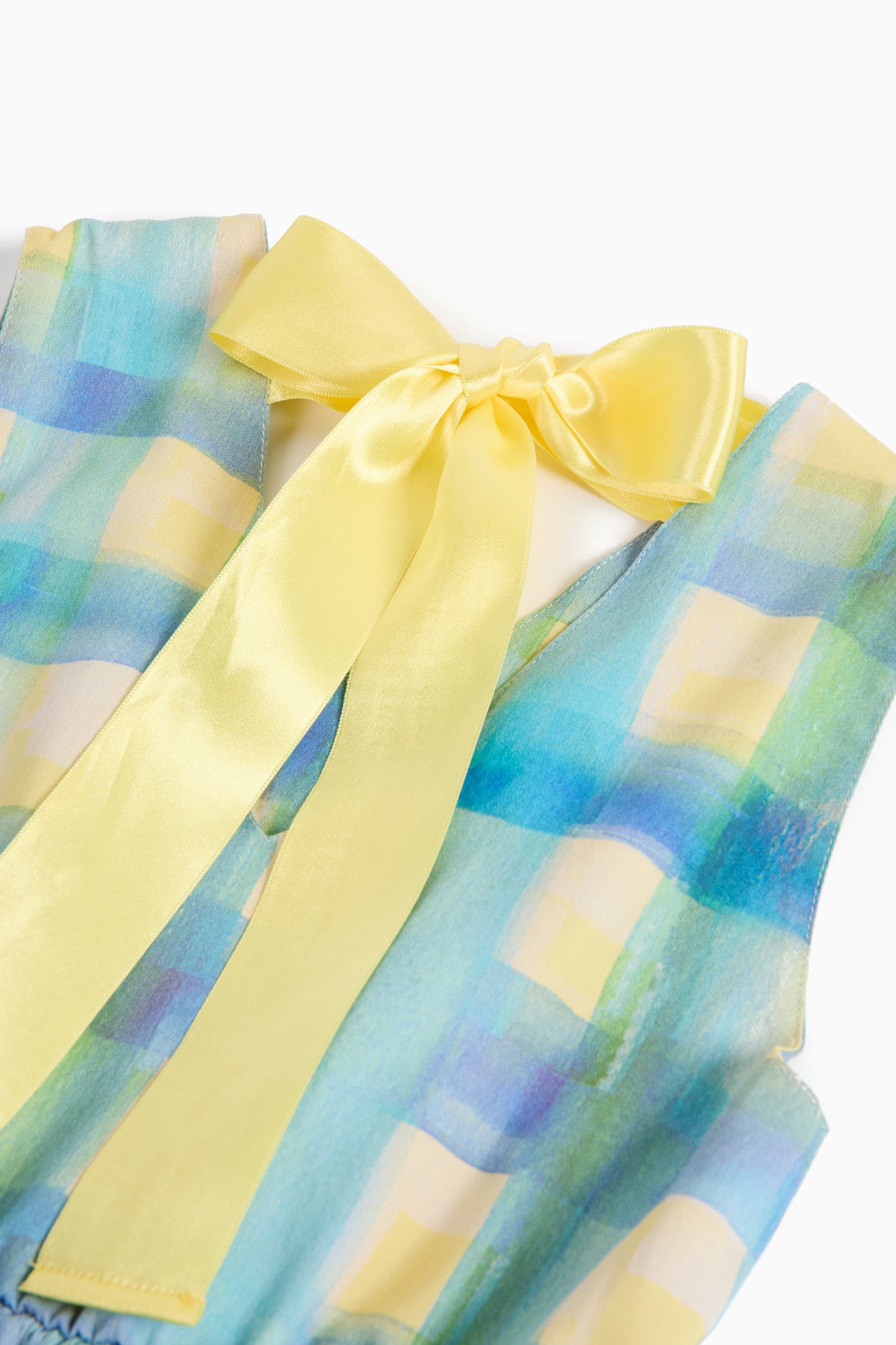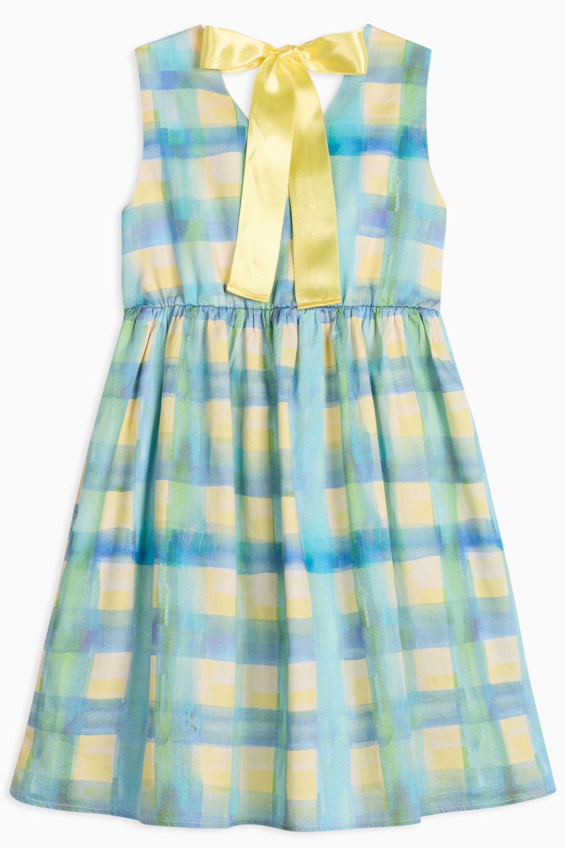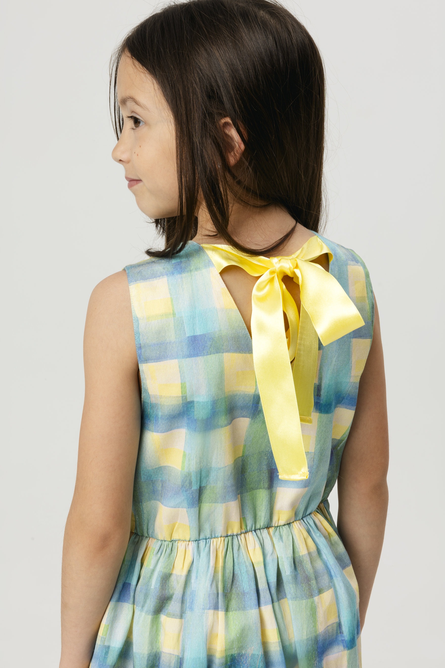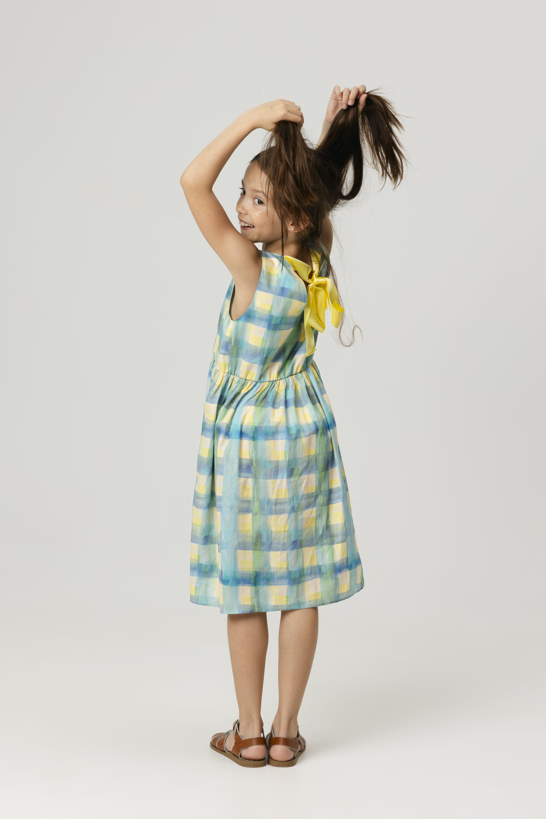 Sleeveless, below-the-knee flared dress, with seam pockets and ribbon tie back