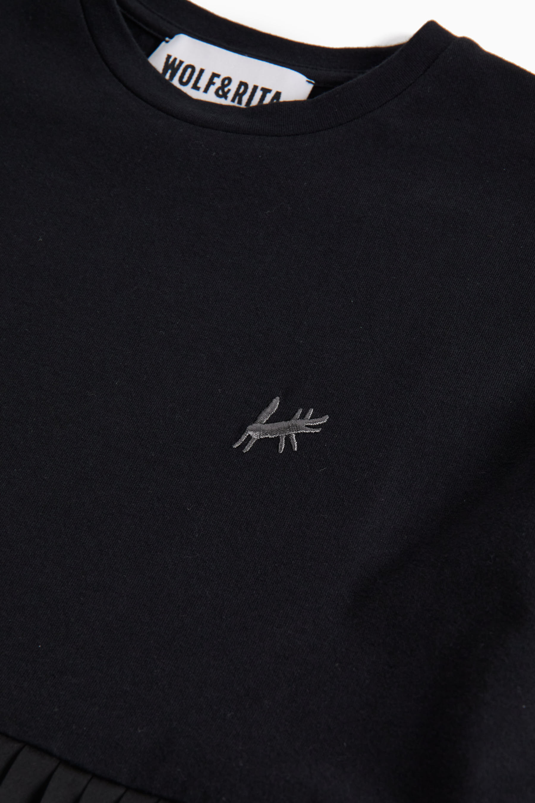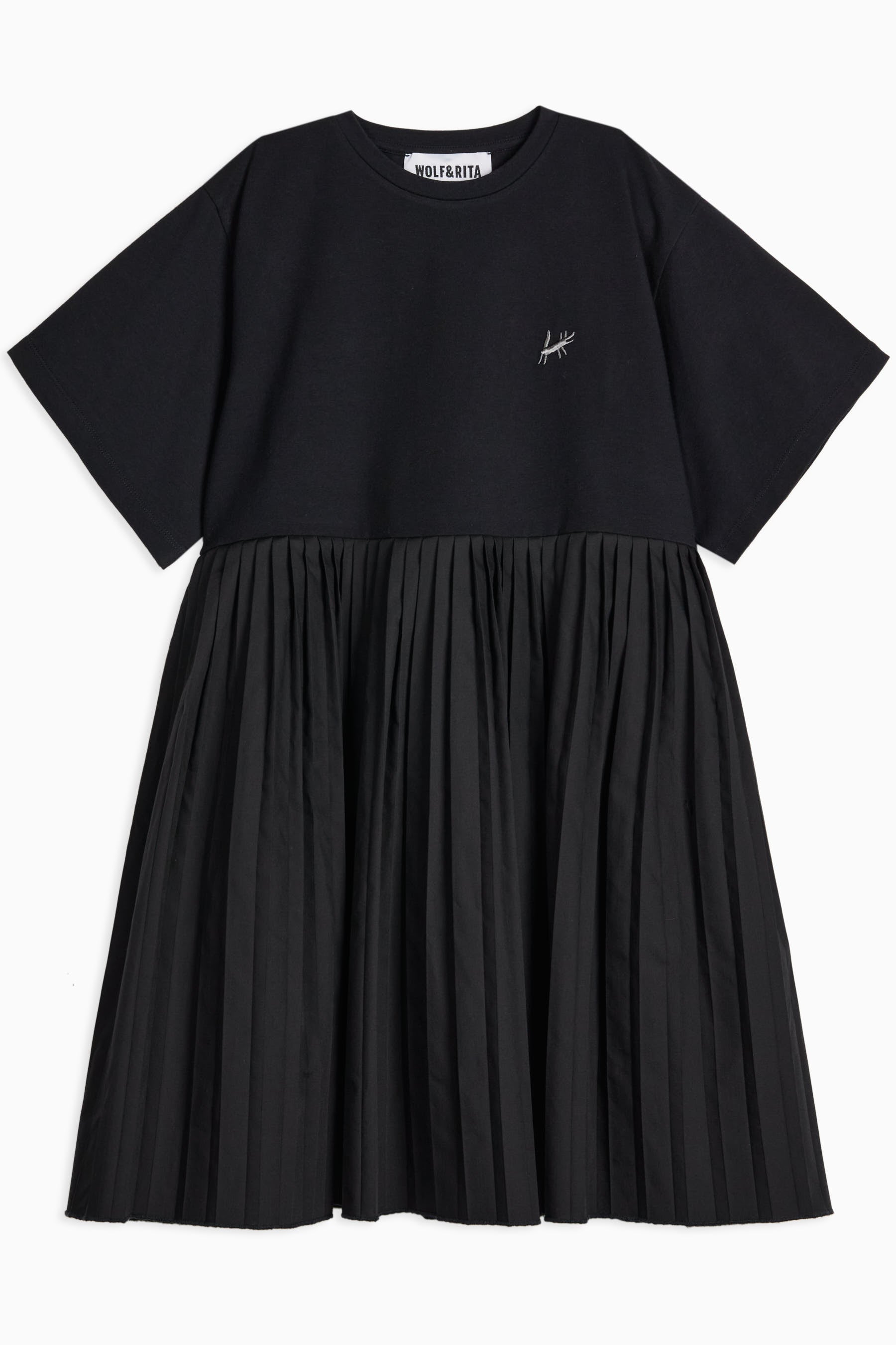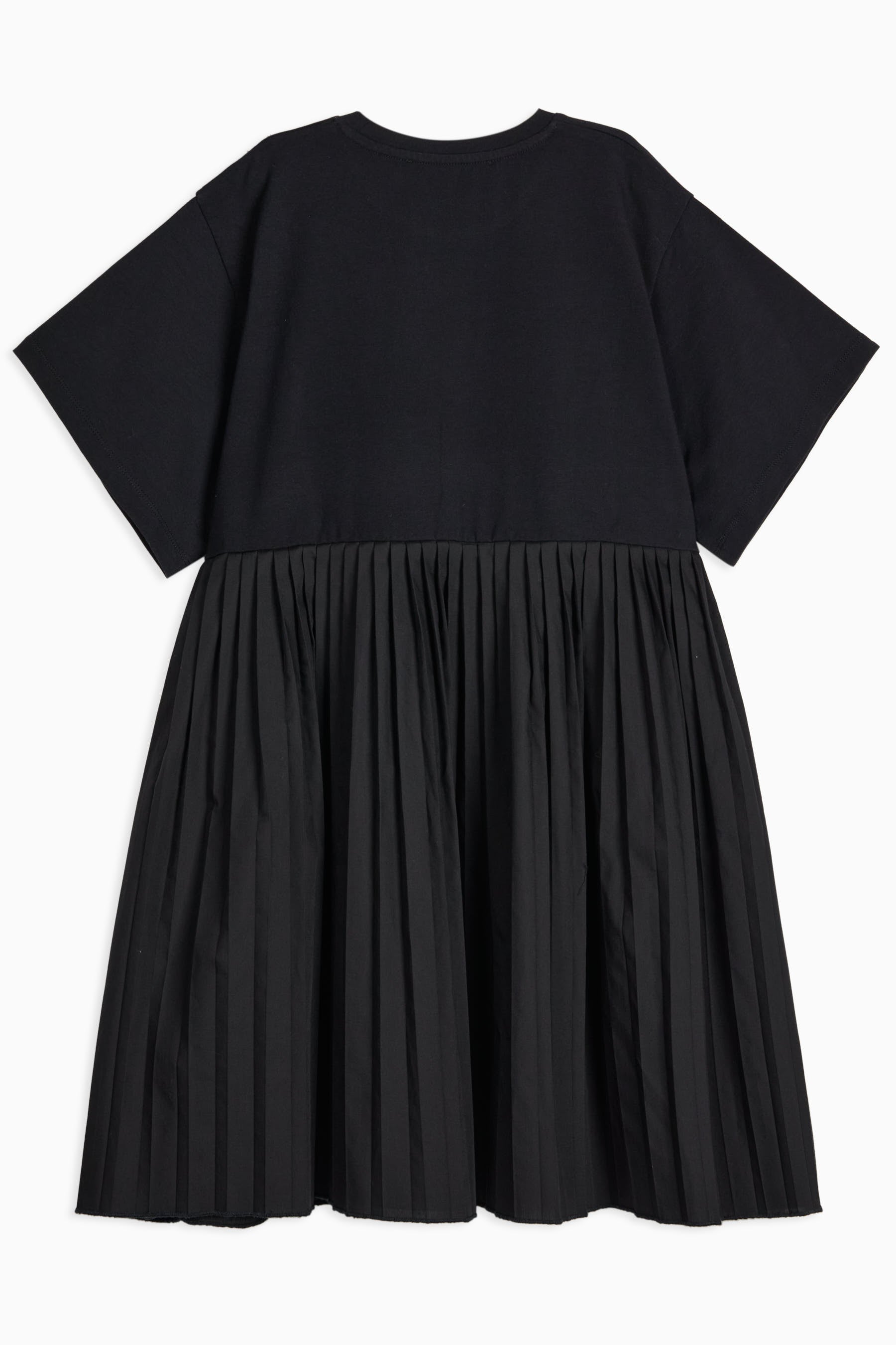 T-shirt dress with contrasted skirt in pleated fabric and small embroidered mascot