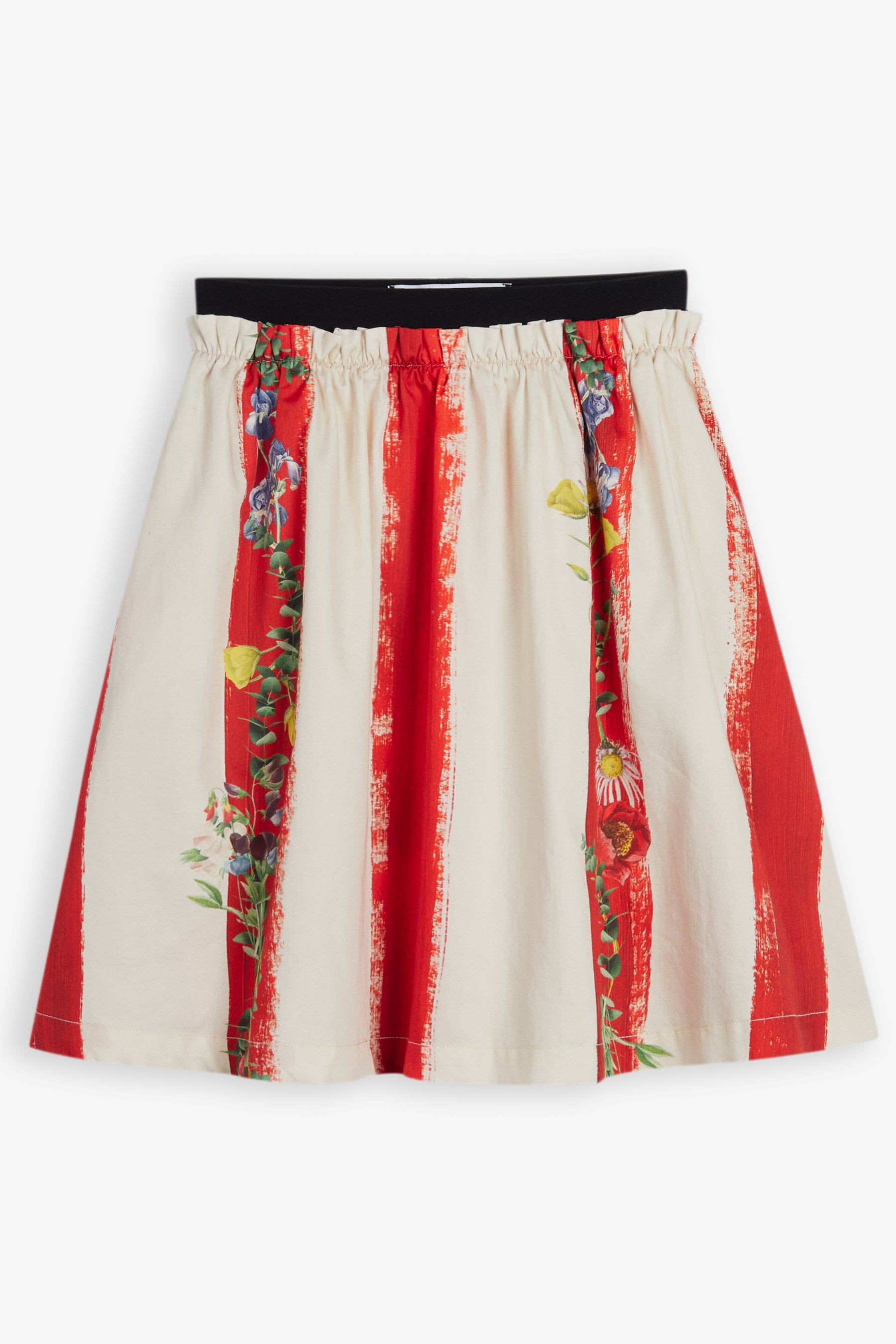 Below the knee flared skirt, gathered detail and contrast elastic waist, seam pockets