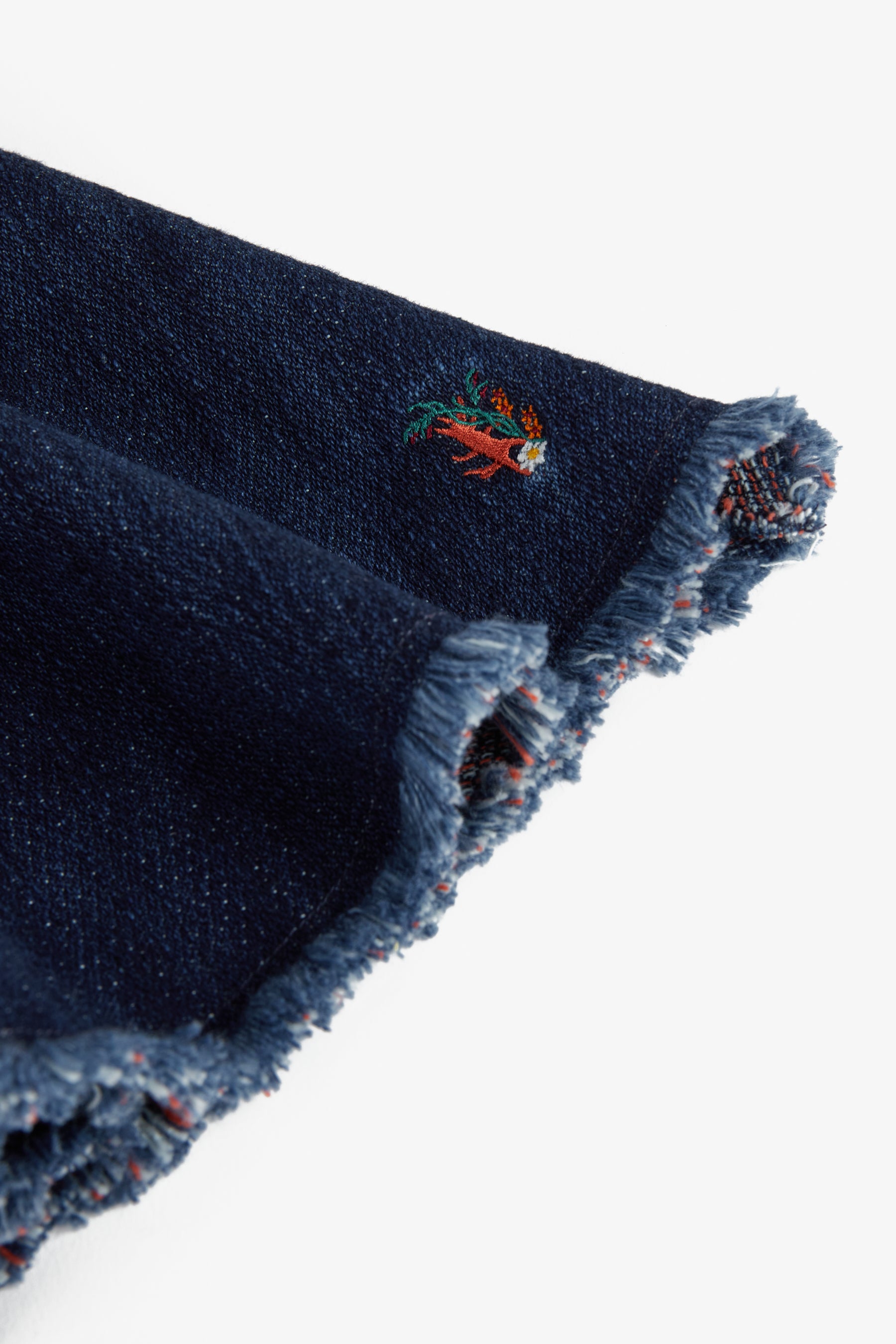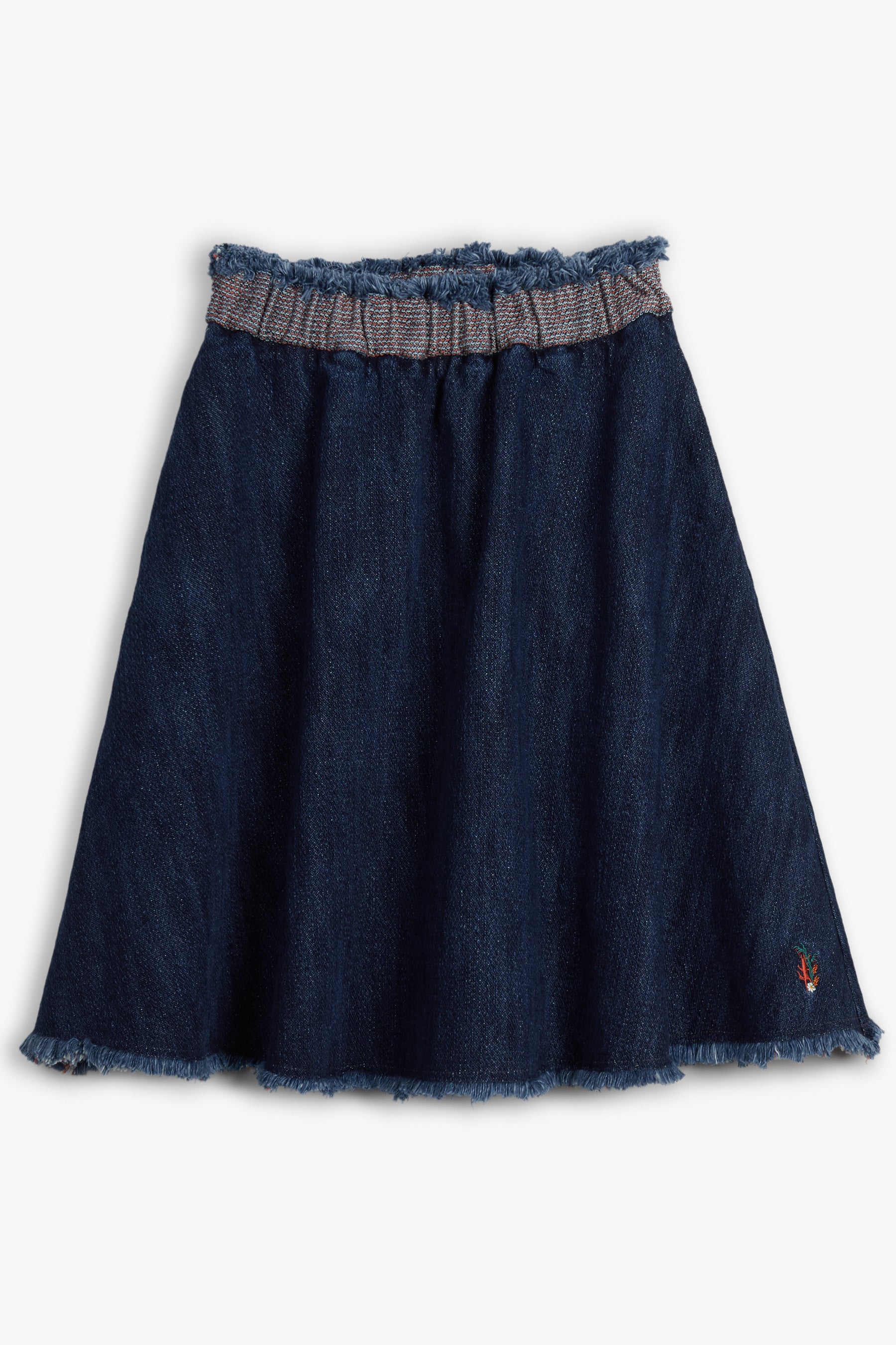 Below the knee flared skirt, raw hem, side pockets, elastic waist, small embroidery