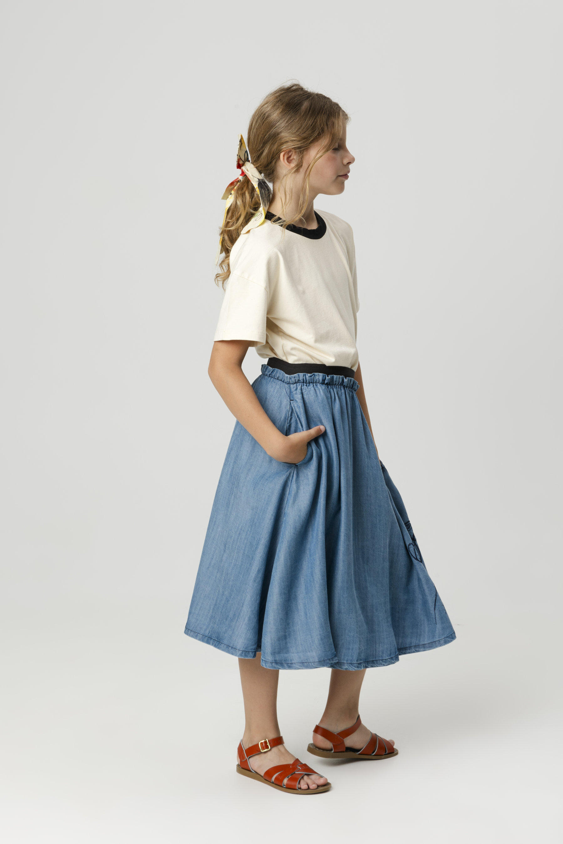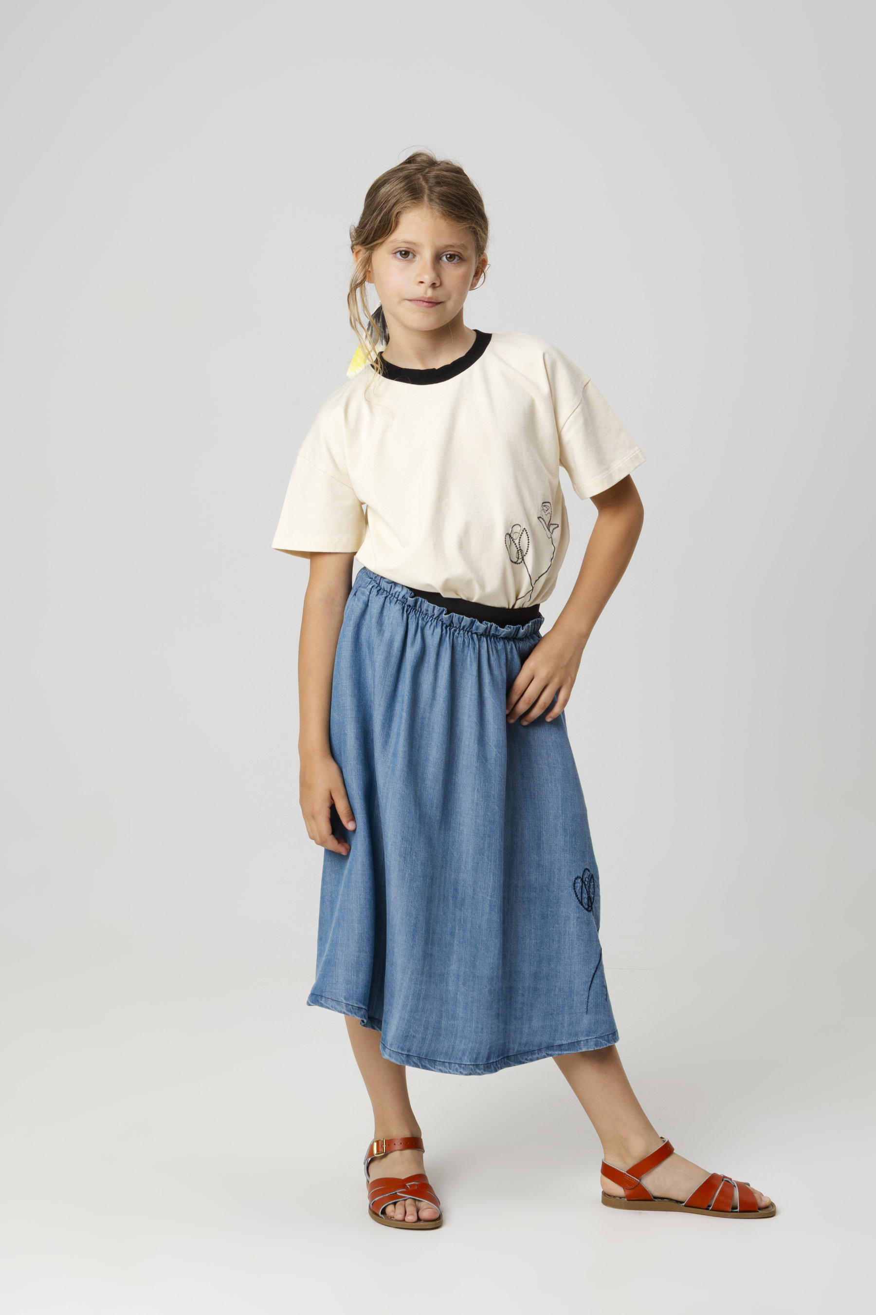 Below the knee flared skirt, gathered detail and contrast elastic waist, seam pockets and embroidery