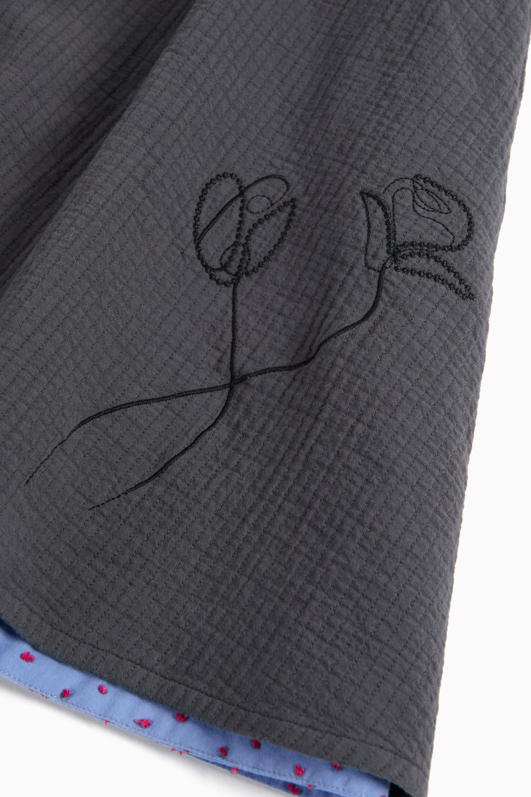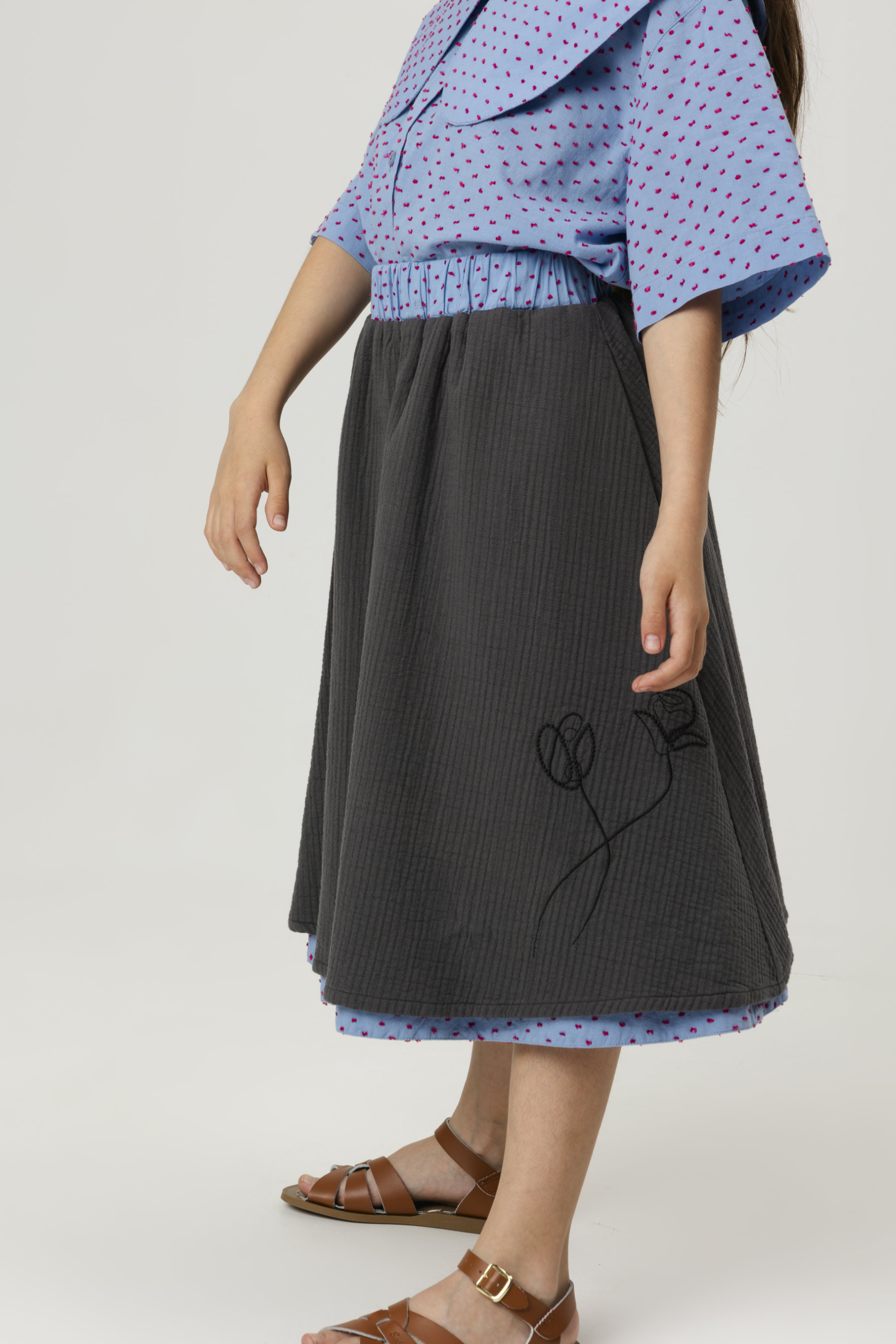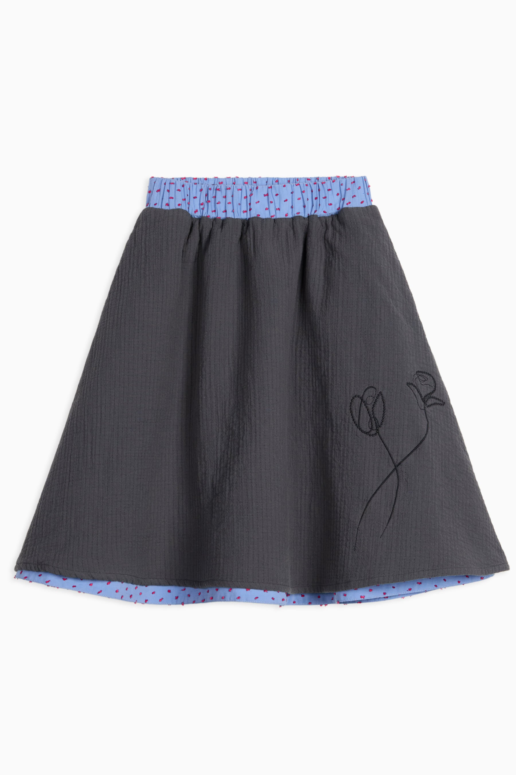Reversible below-the-knee flared skirt, embroidery on one side, seam pockets, elastic waist