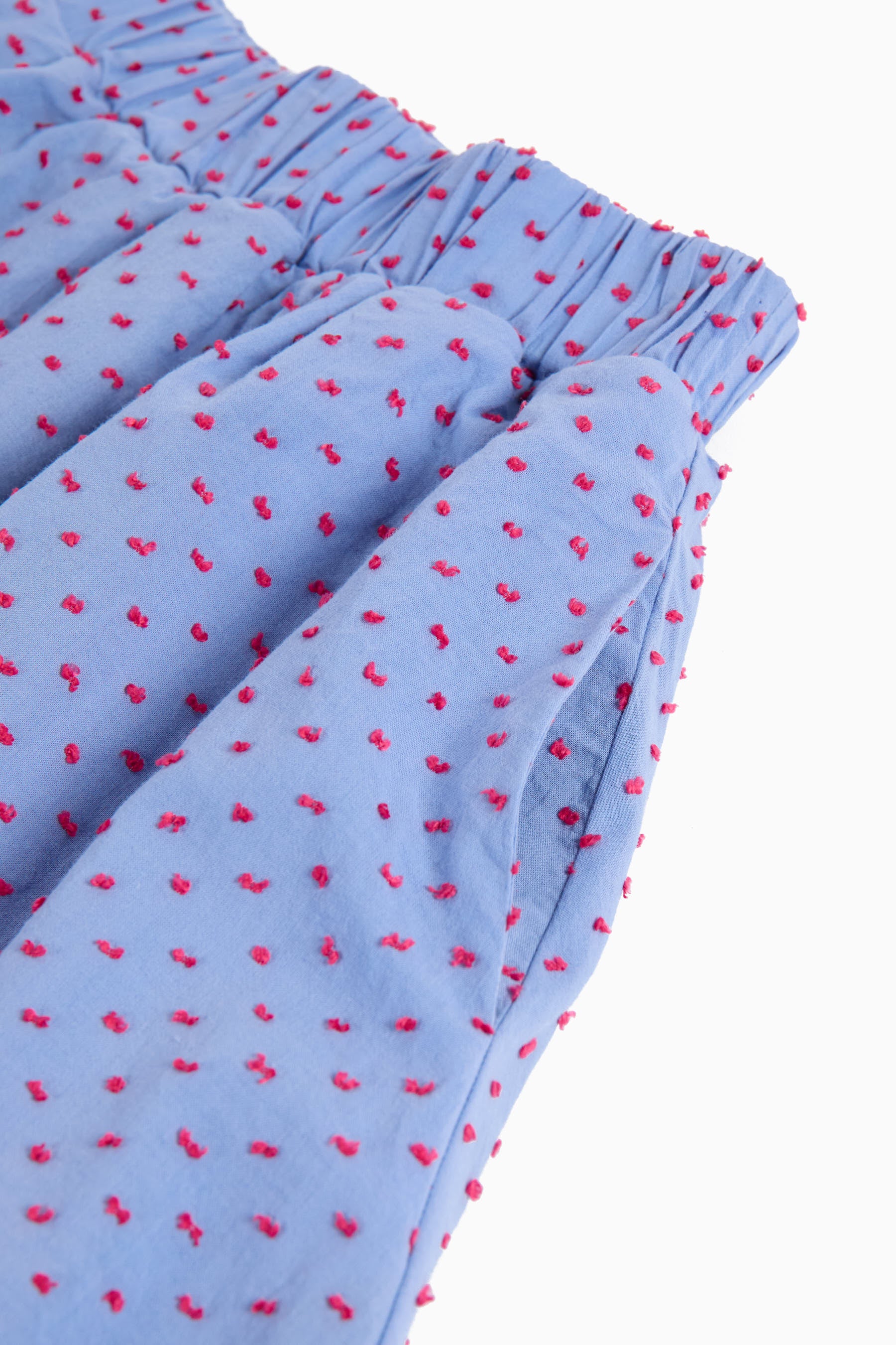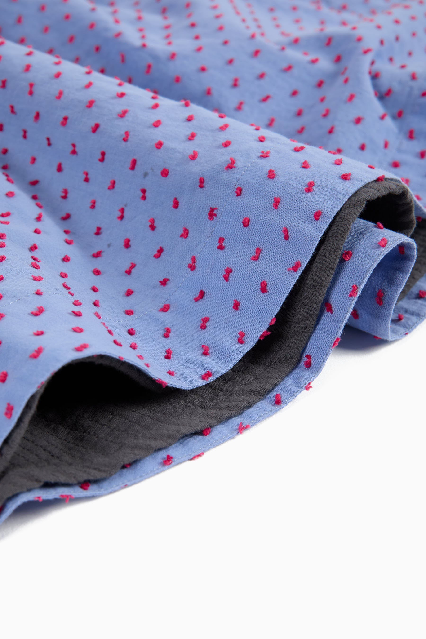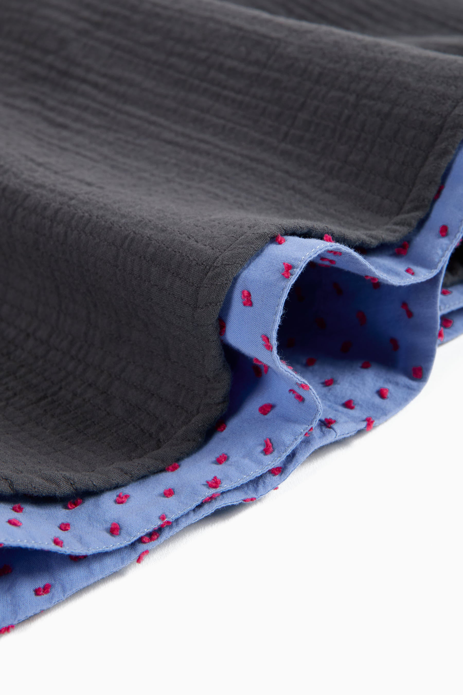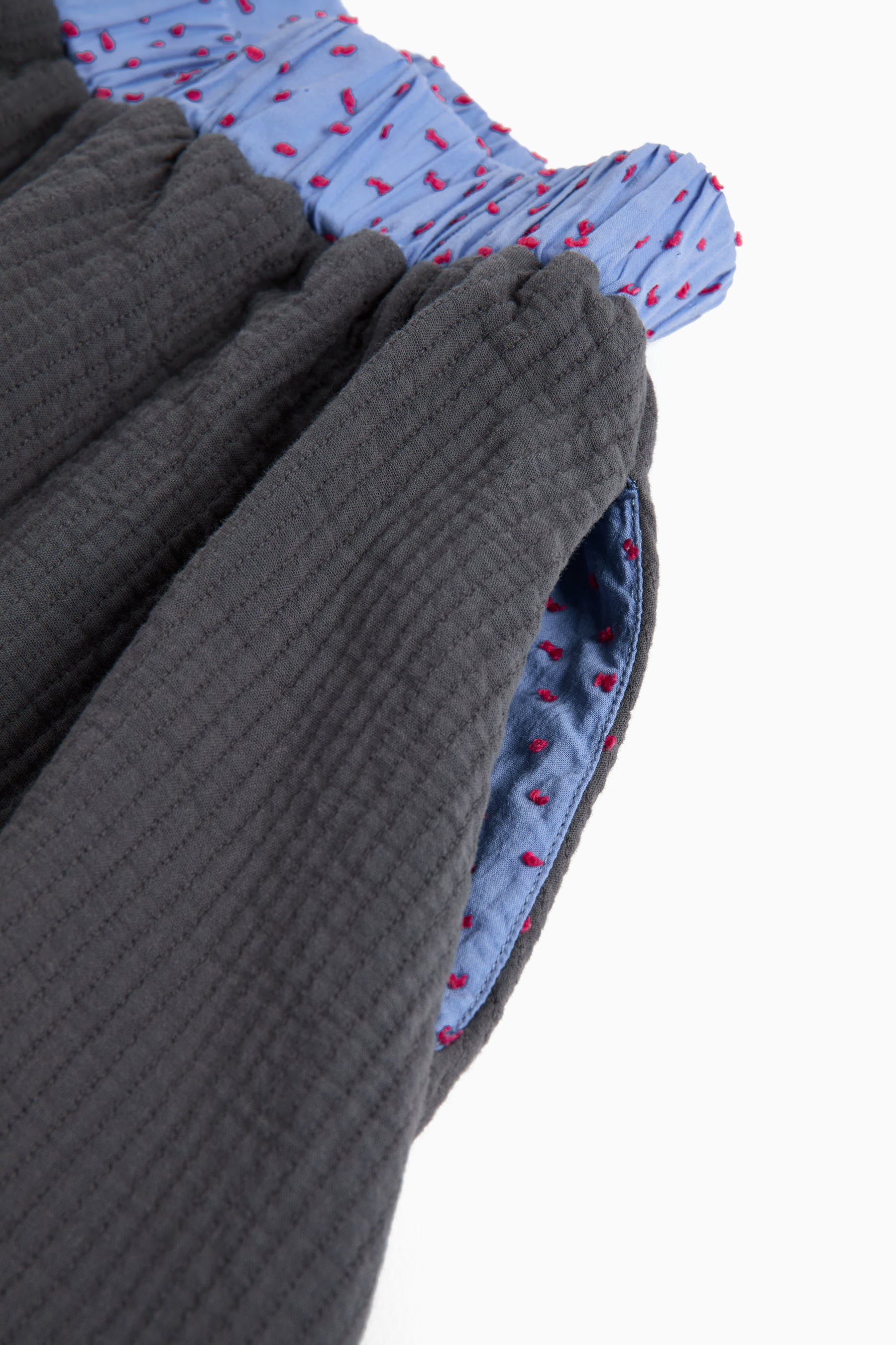 Reversible below-the-knee flared skirt, embroidery on one side, seam pockets, elastic waist