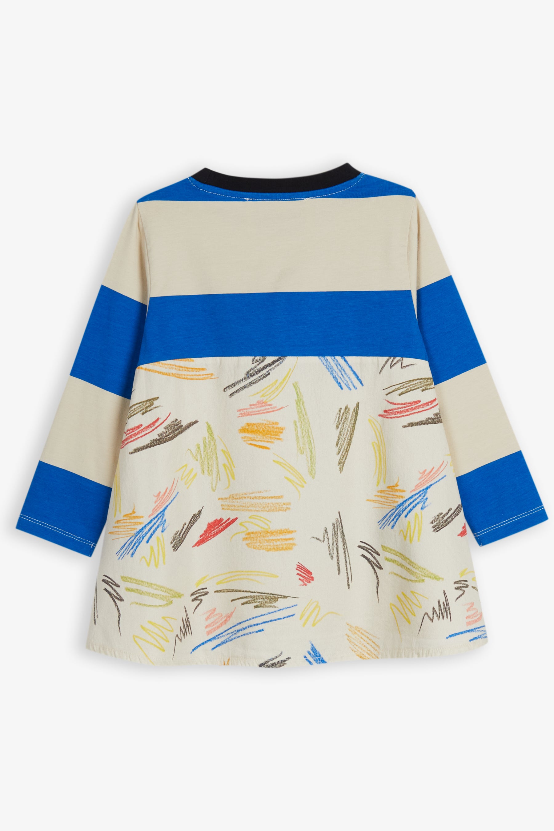 Long sleeved A-line tunic, contrasted and gathered longer back, contrasted collar, small embroidery