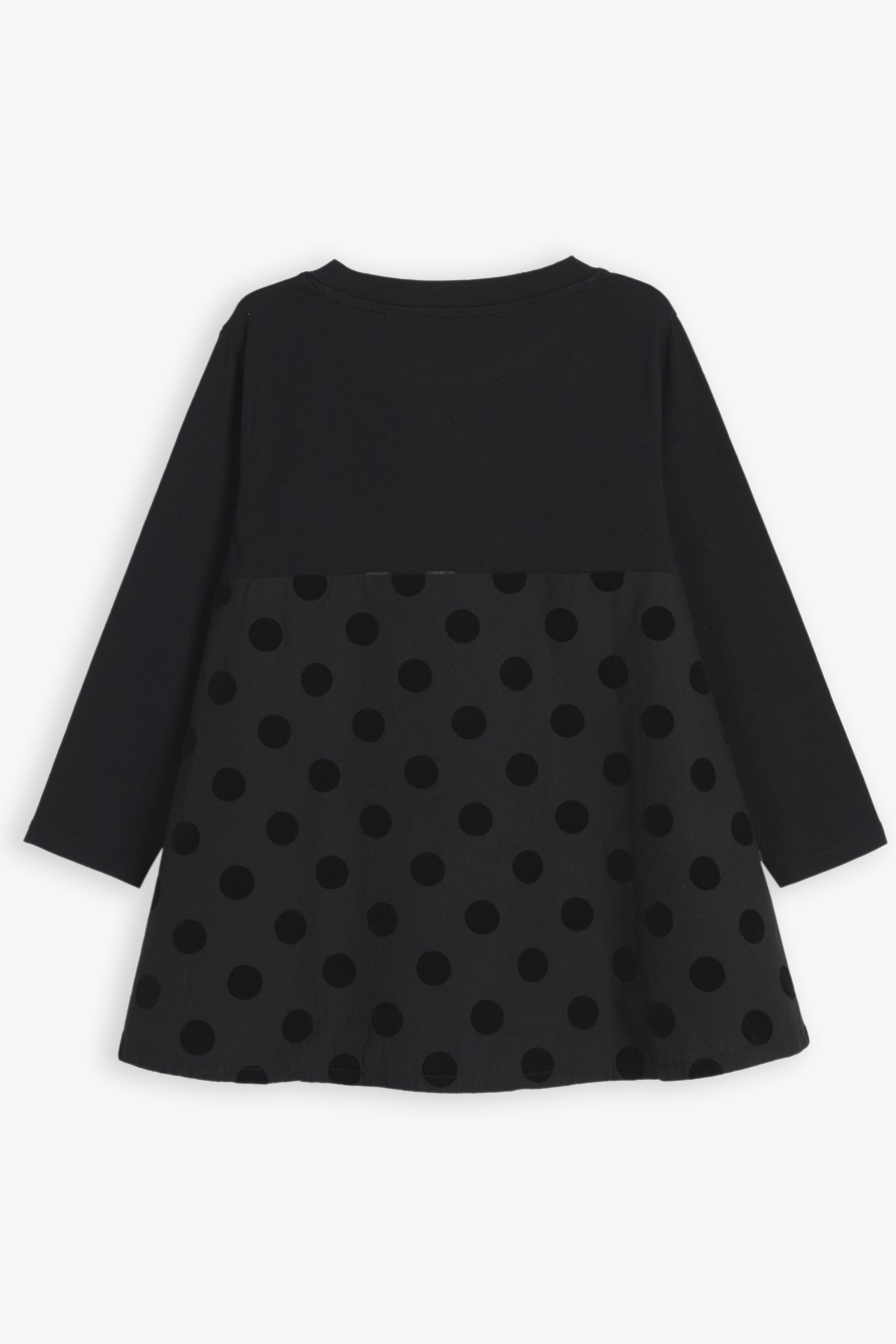Long sleeved A-line tunic, contrasted and gathered longer back, small embroidery