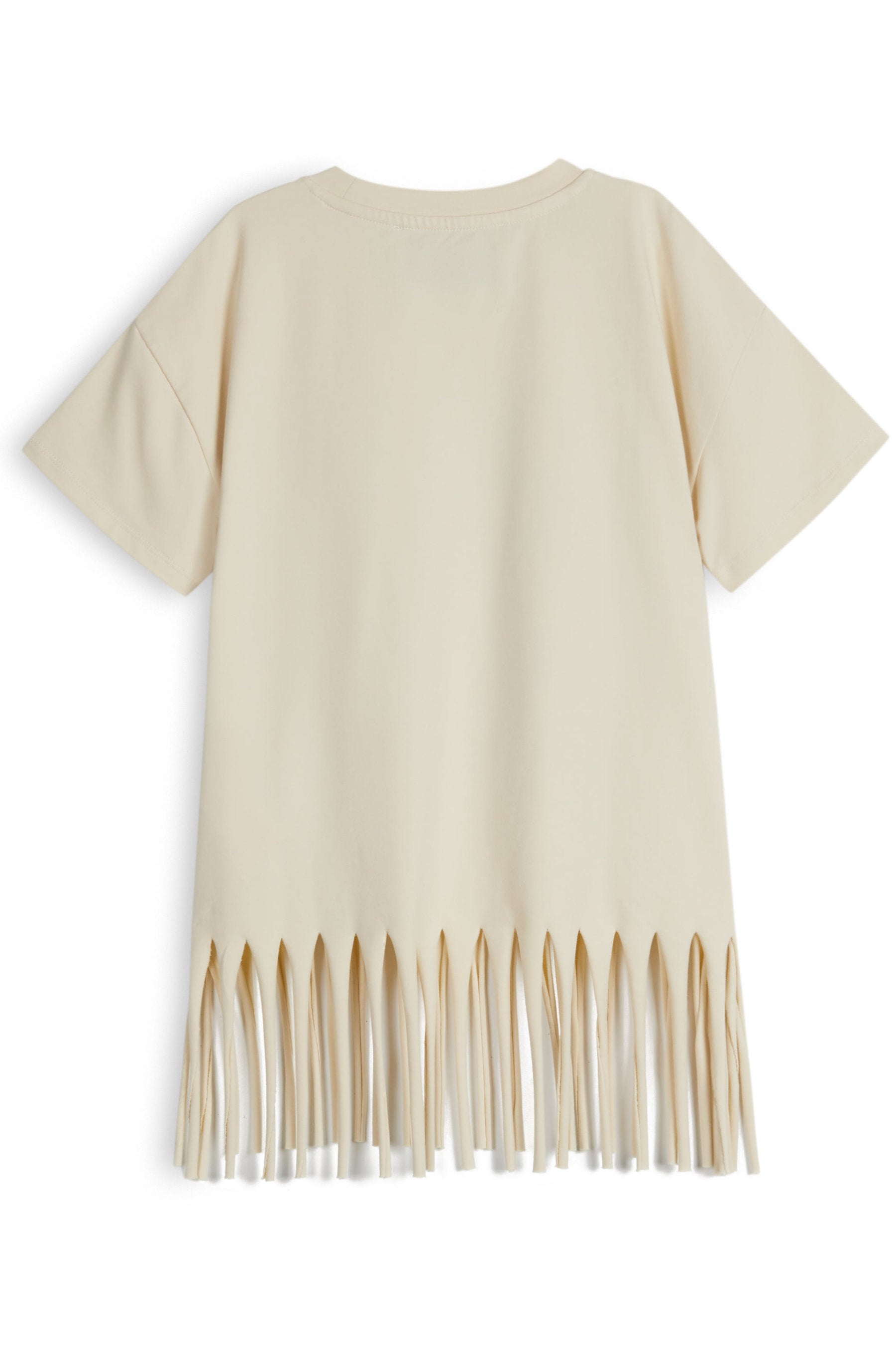 Short sleeved, relaxed fit tunic with print and fringe bottom