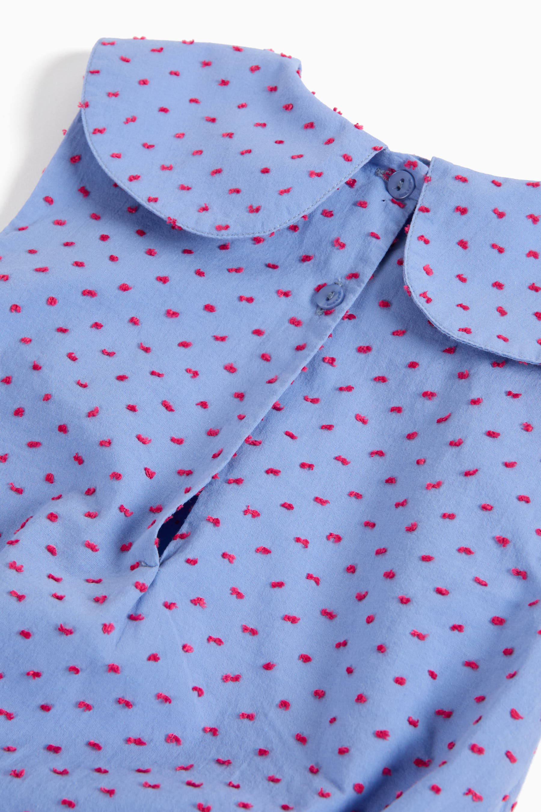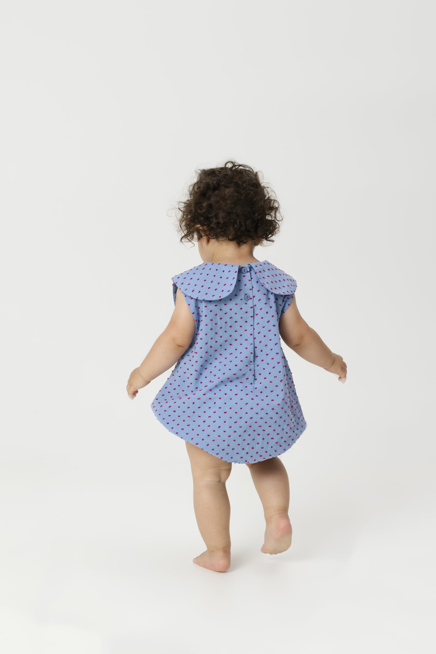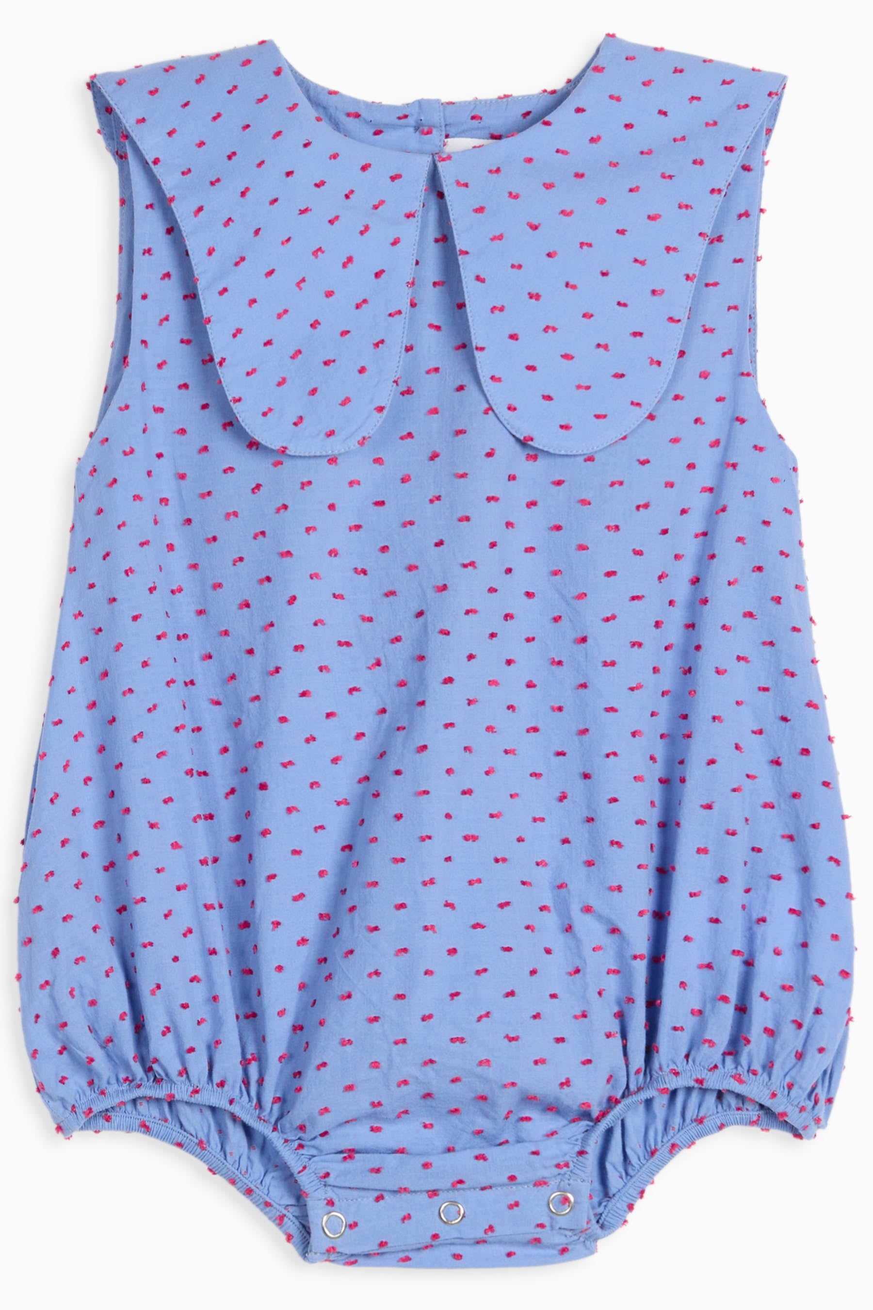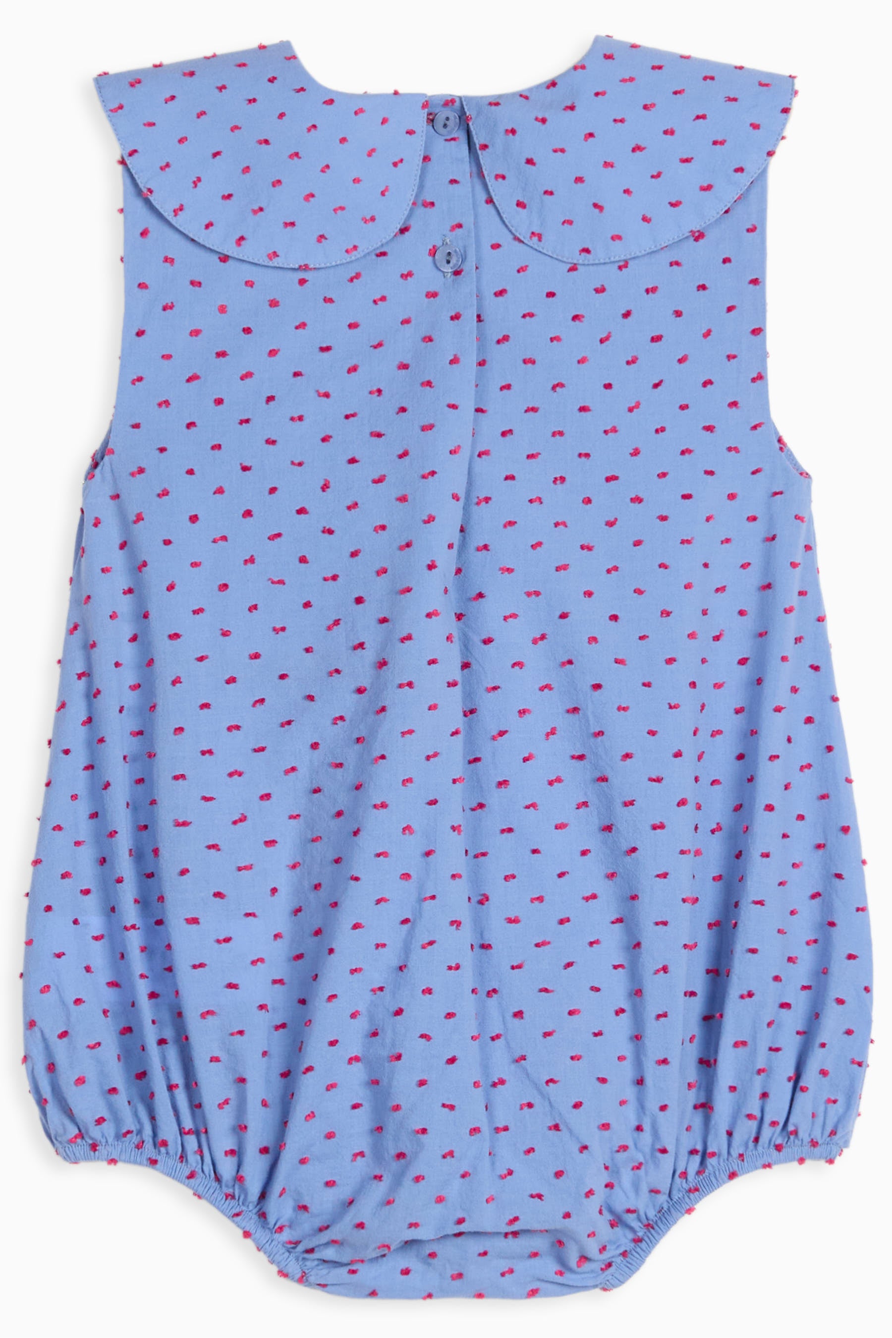 Sleeveless jumpsuit with pointed collar, back buttons and snap buttons between the legs