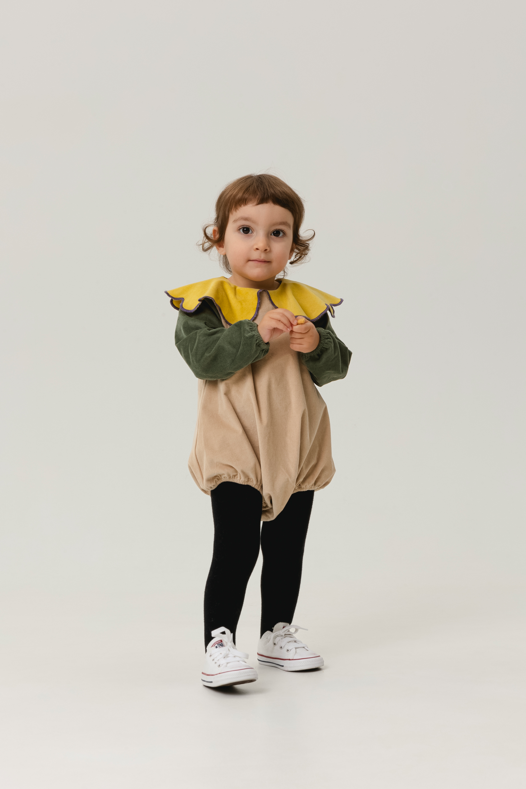 Long sleeved romper with contrasted sleeves, scalloped contrasted collar, back buttons, snap buttons between the legs and elasticated cuffs