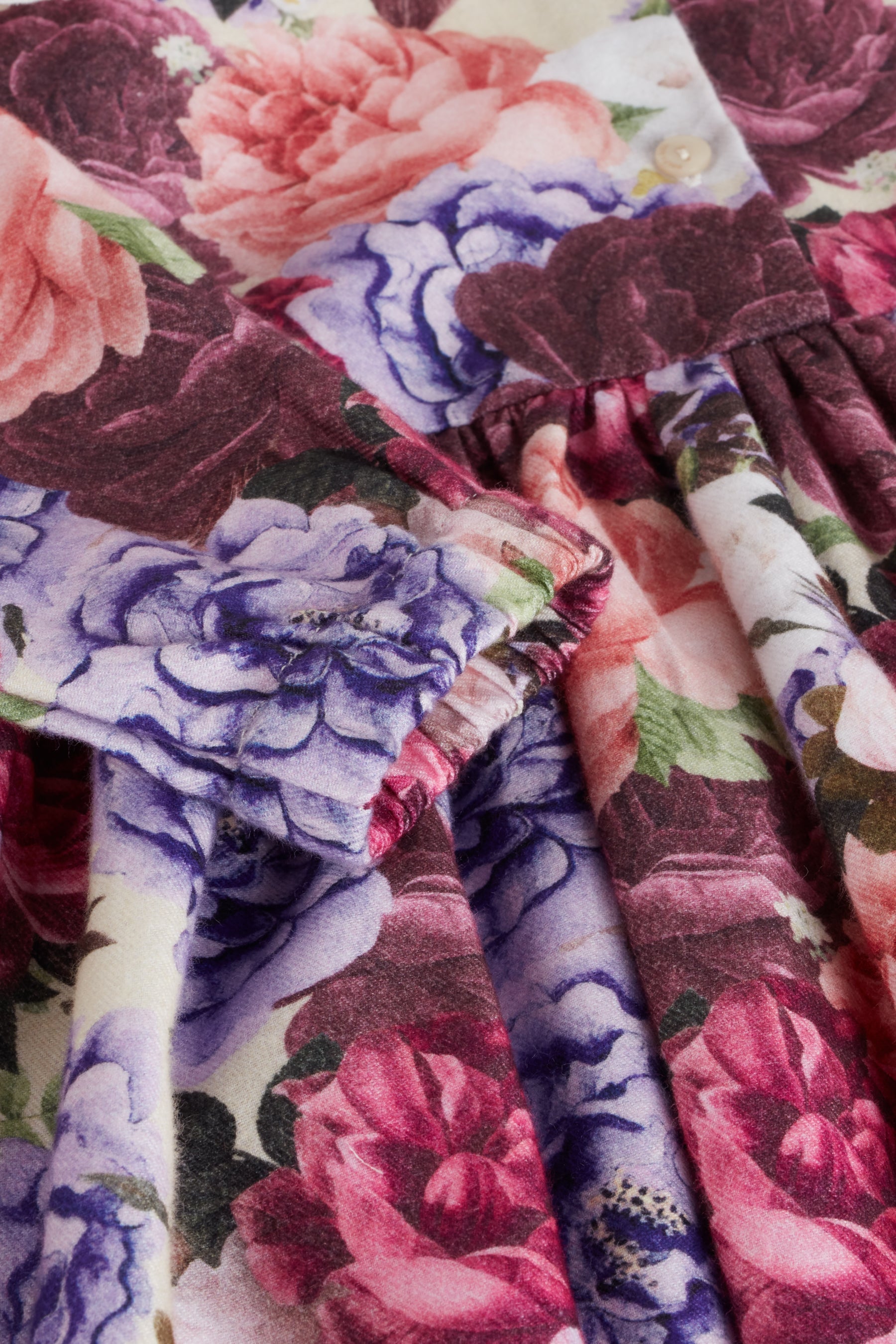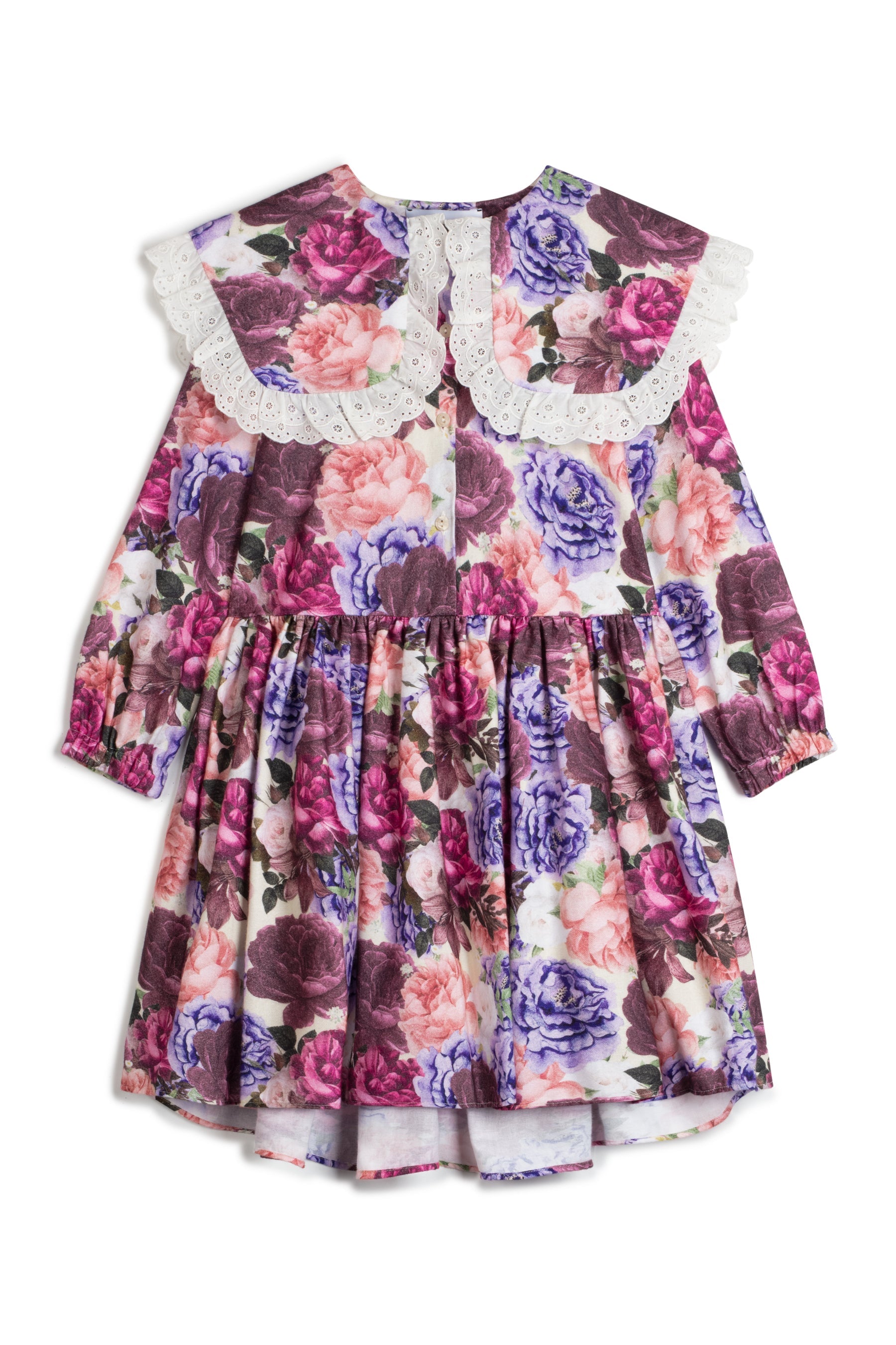 A-line long sleeved flannel dress with gathered skirt, longer in the back, frilled lace detail on the collar, with front buttons and elasticated cuffs
