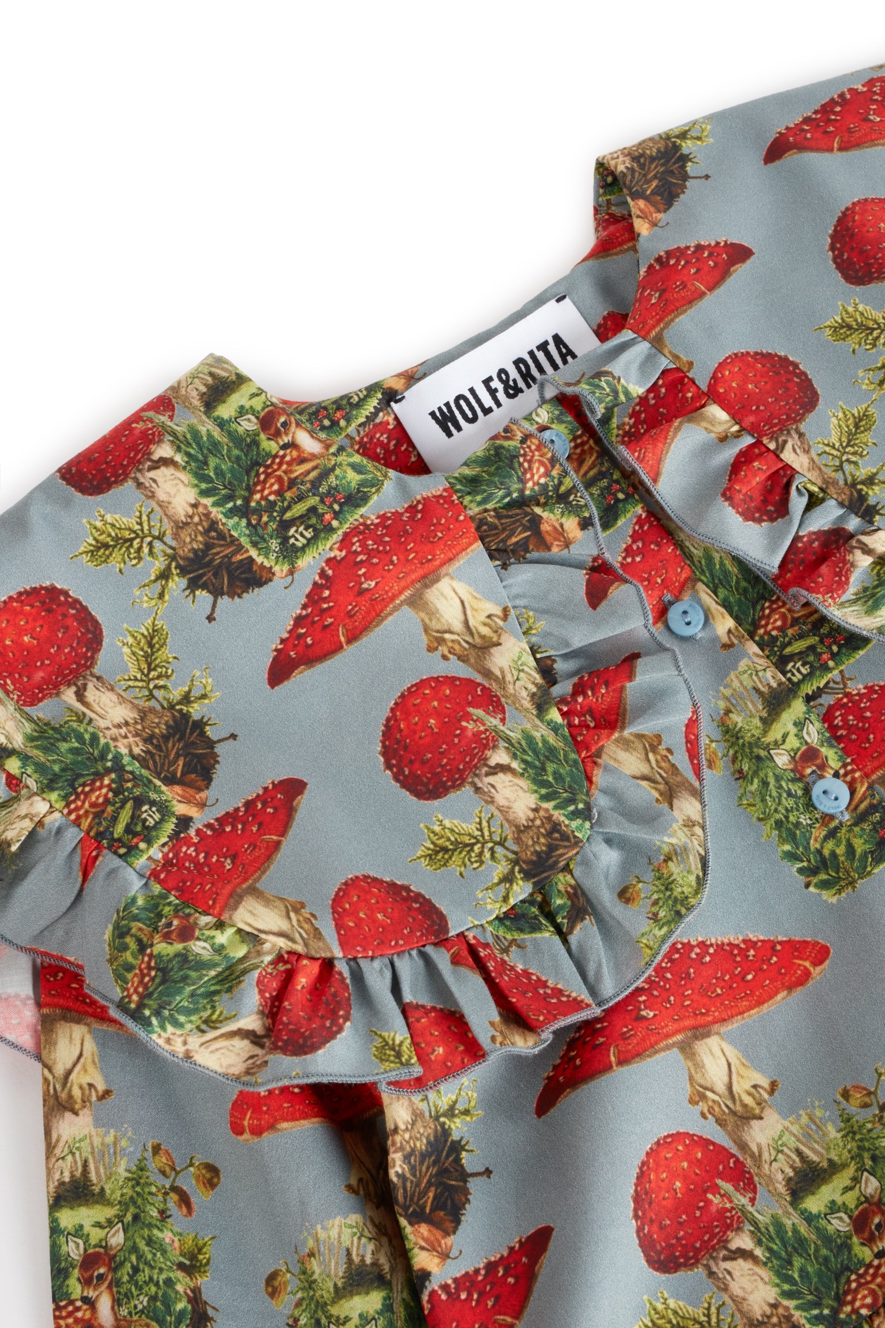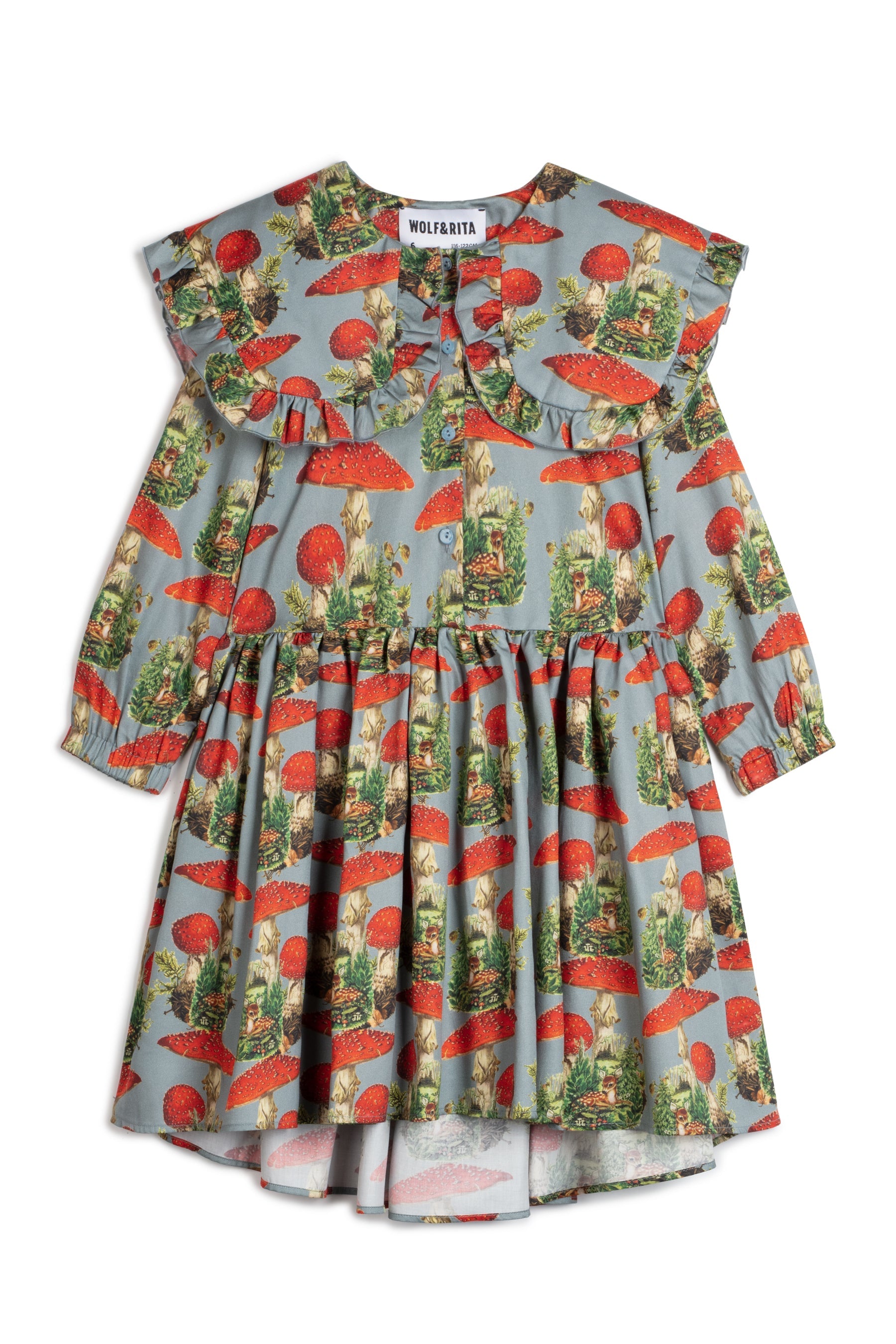 A-line long sleeved dress with gathered skirt, longer in the back, frilled detail on the collar, with front buttons and elasticated cuffs