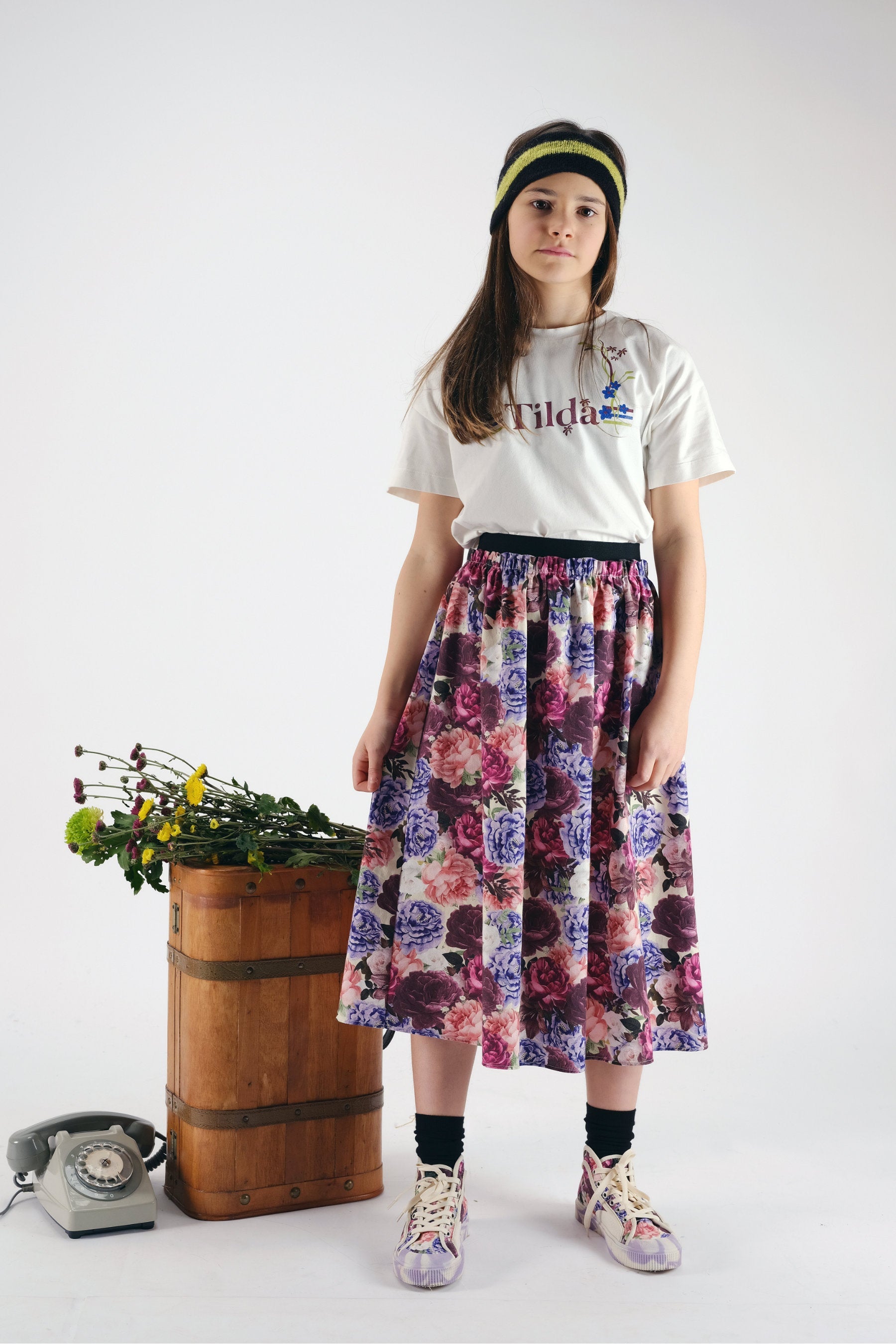 Mid length flannel skirt with contrasted elastic on waist