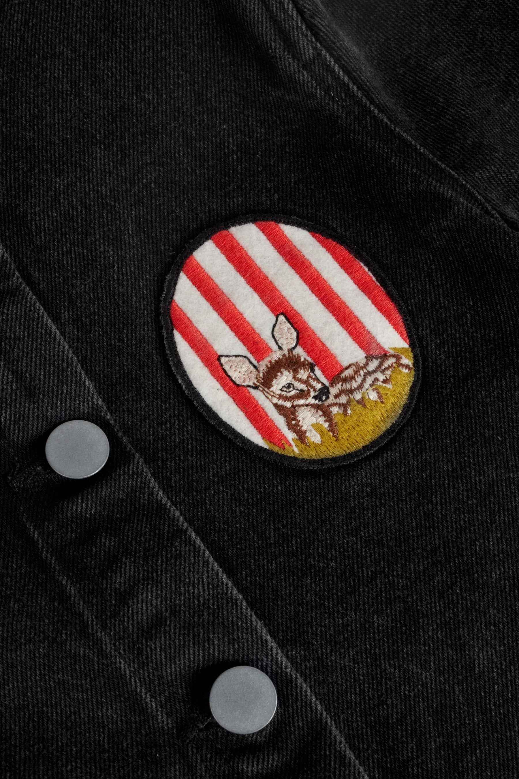 Stone washed denim jacket with frilled bottom, raw hems, side pocket, patch and front buttons