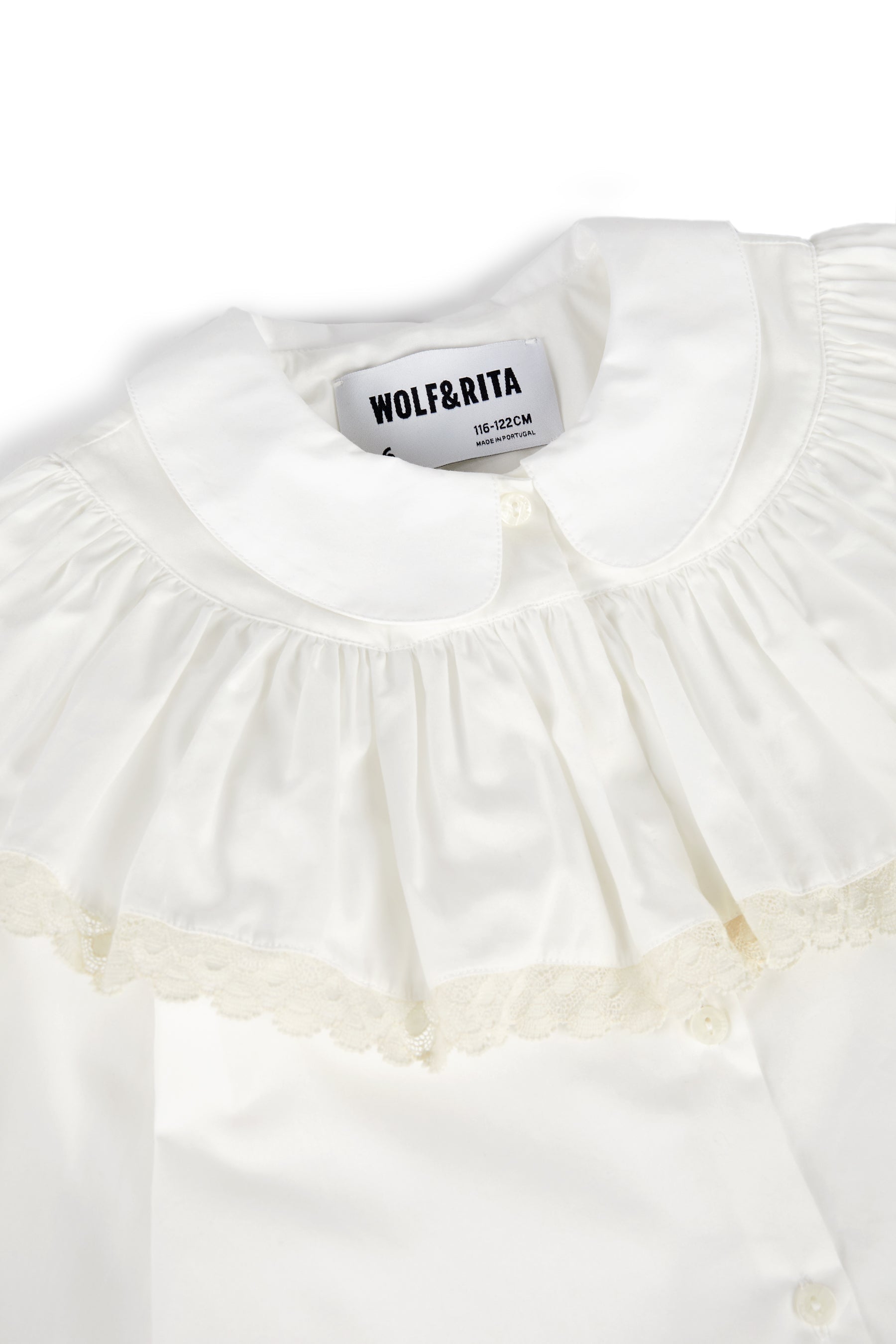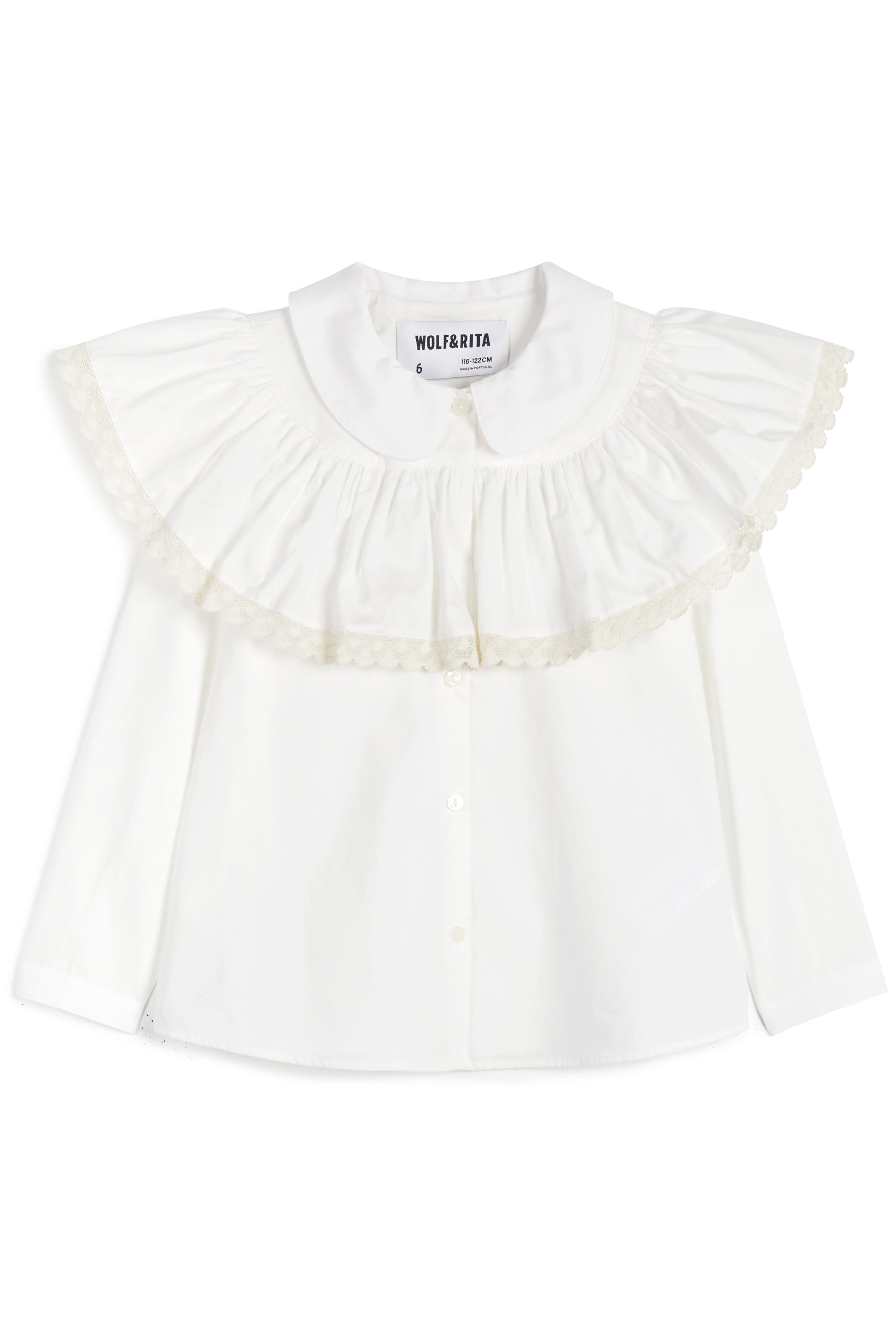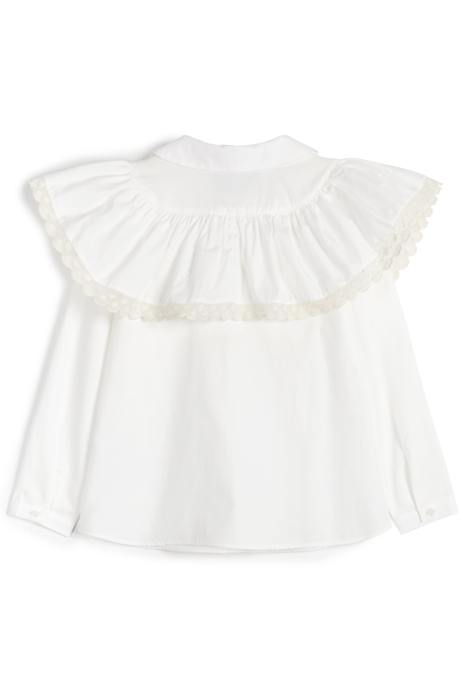 Long sleeved prairie blouse with front buttons, elasticated cuffs, round collar, ruffled lace details and cuff buttons