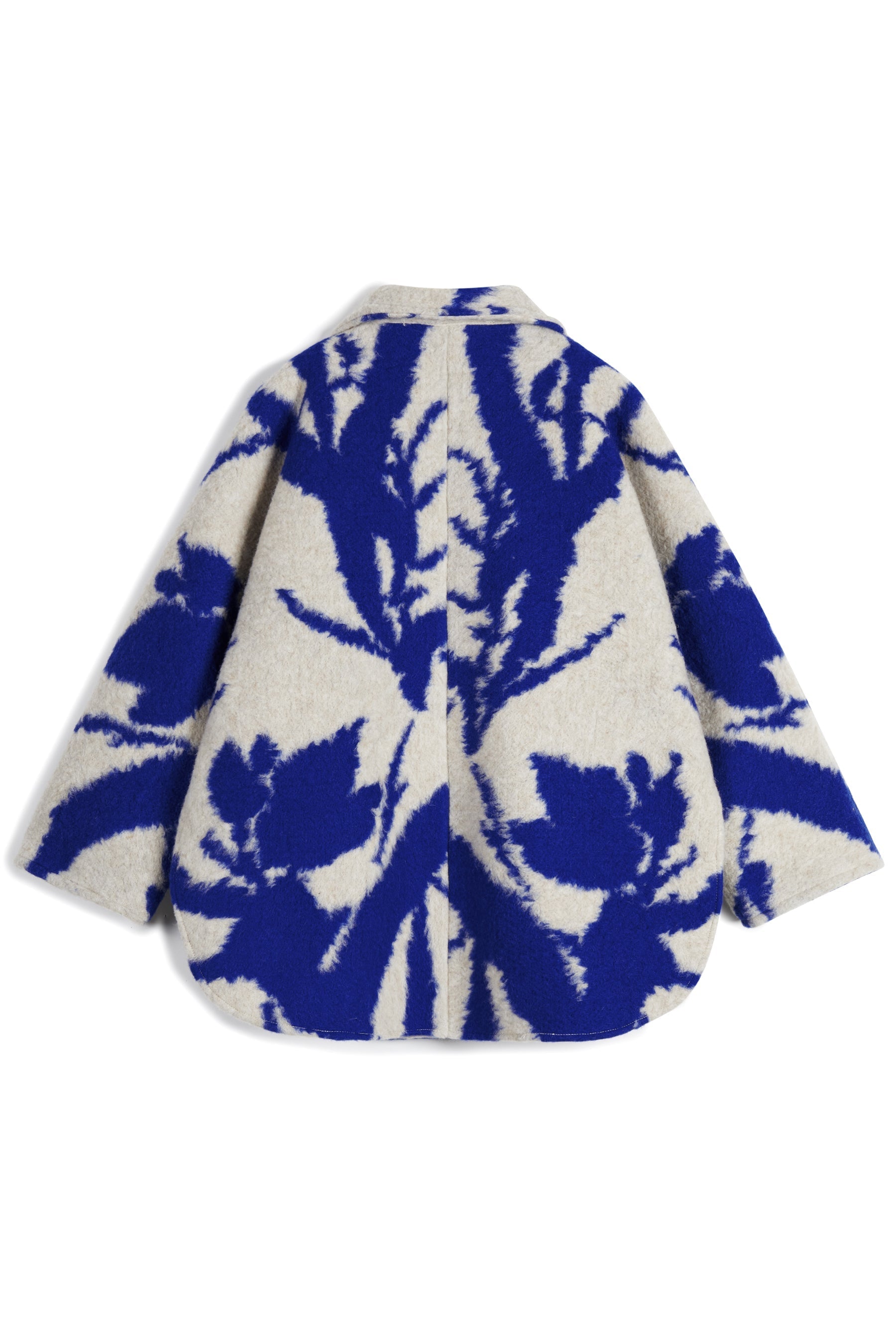 Button-up oversized coat with baseball hem and side welt pockets, regular shirt collar, dolman sleeves, and tab cuffs