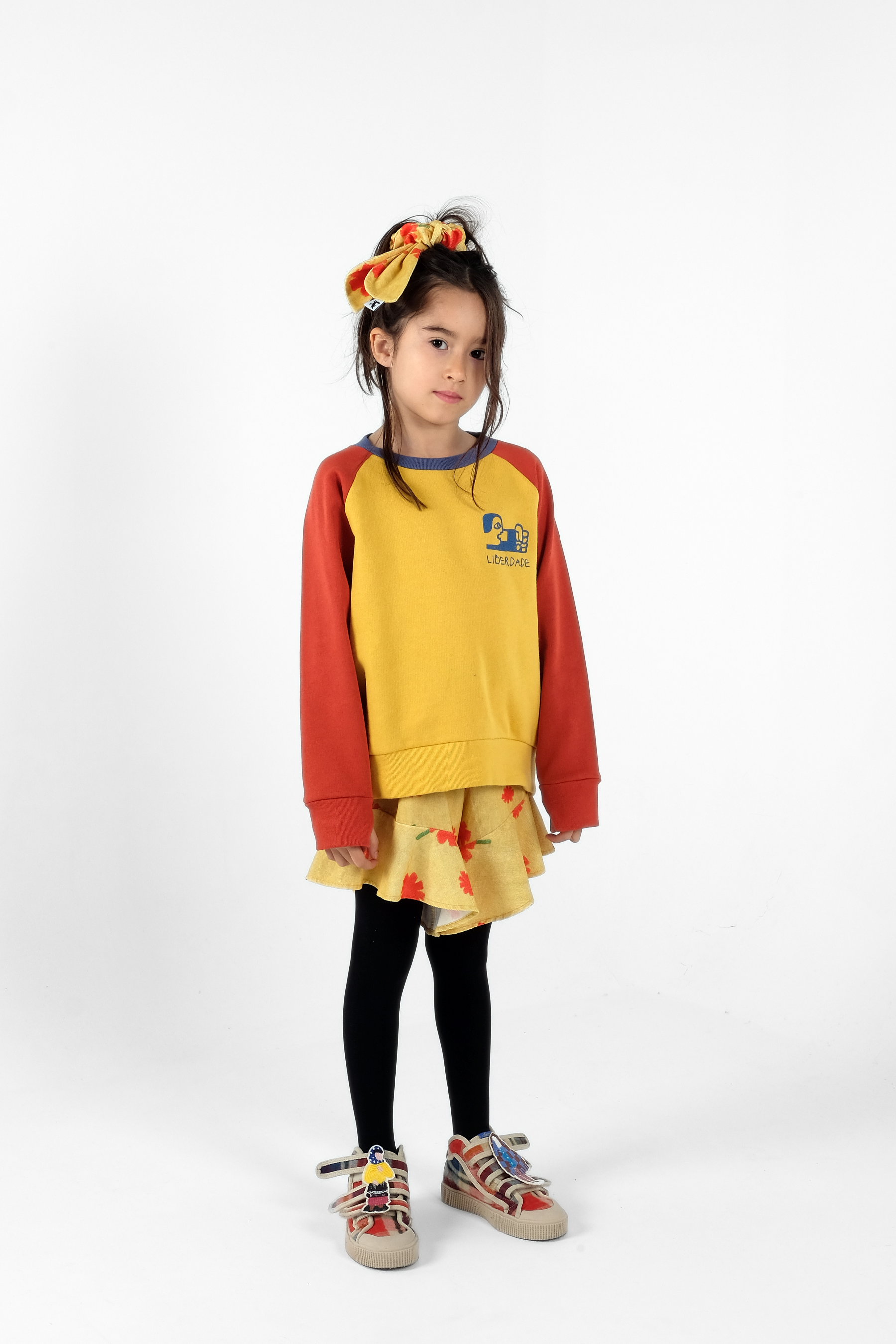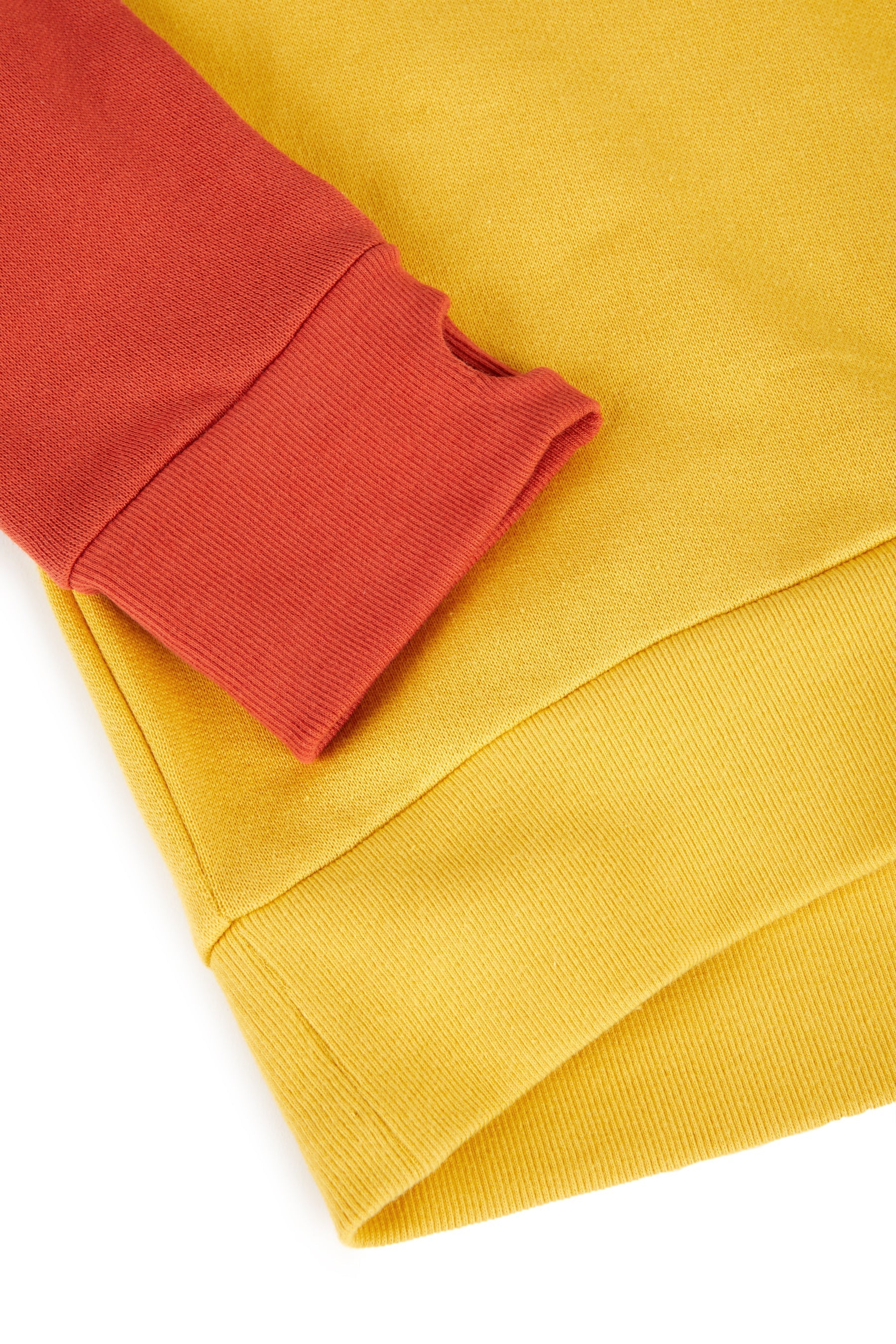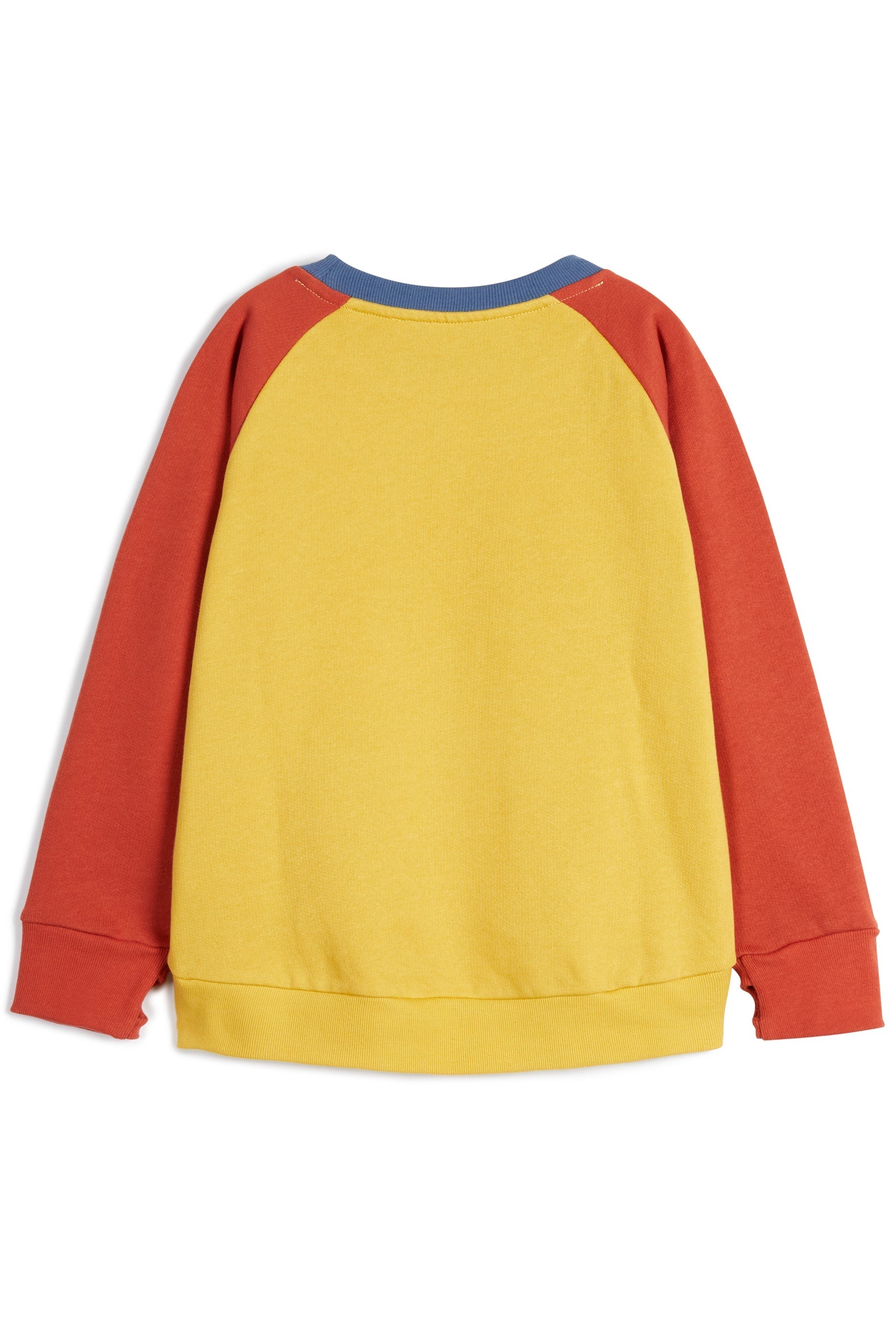 Long sleeved fleece sweatshirt with contrasted raglan sleeves and collar, thumbholes and print