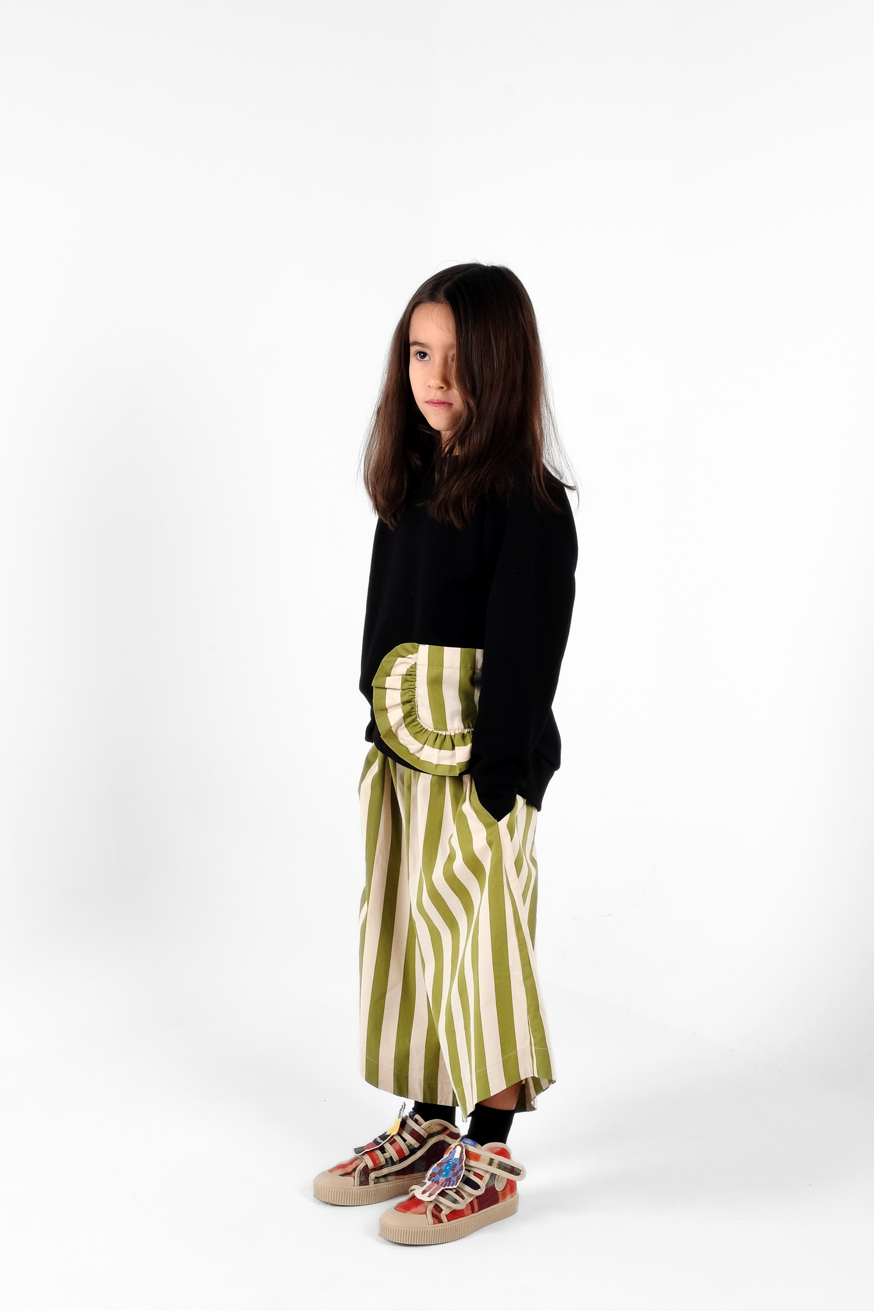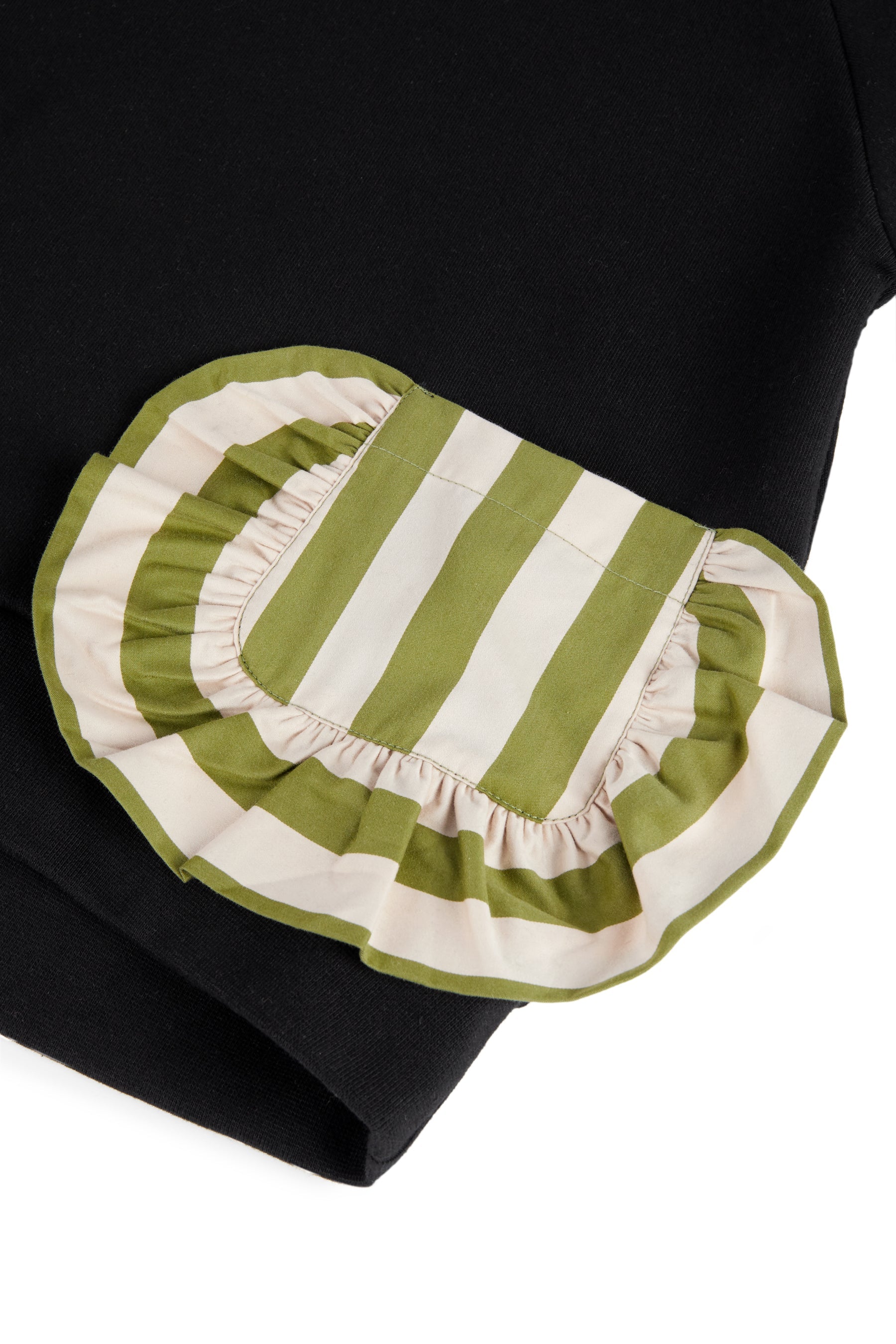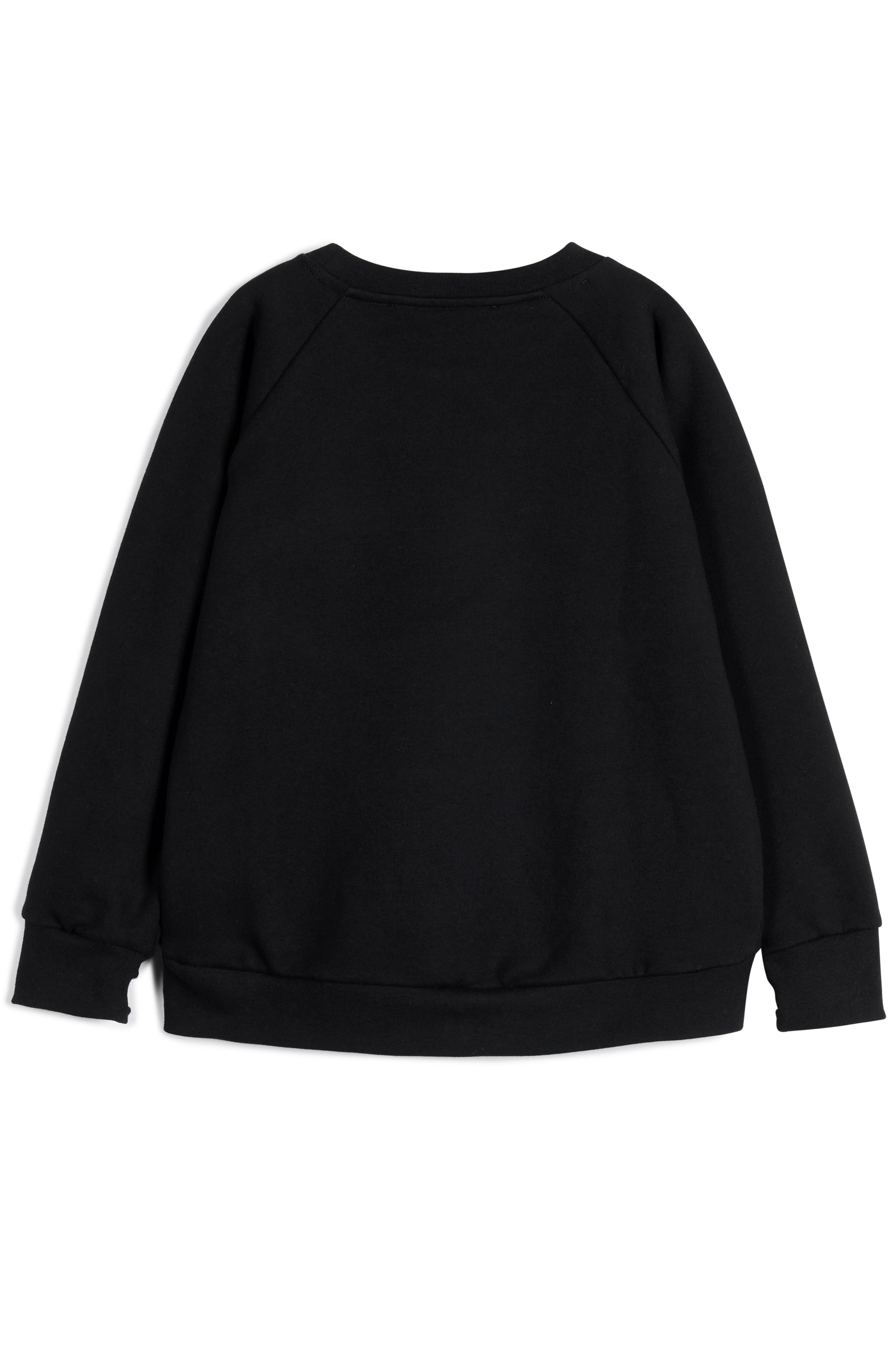 Long sleeved fleece sweatshirt, with raglan sleeves and thumbholes, contrasted front pocket and frill detail