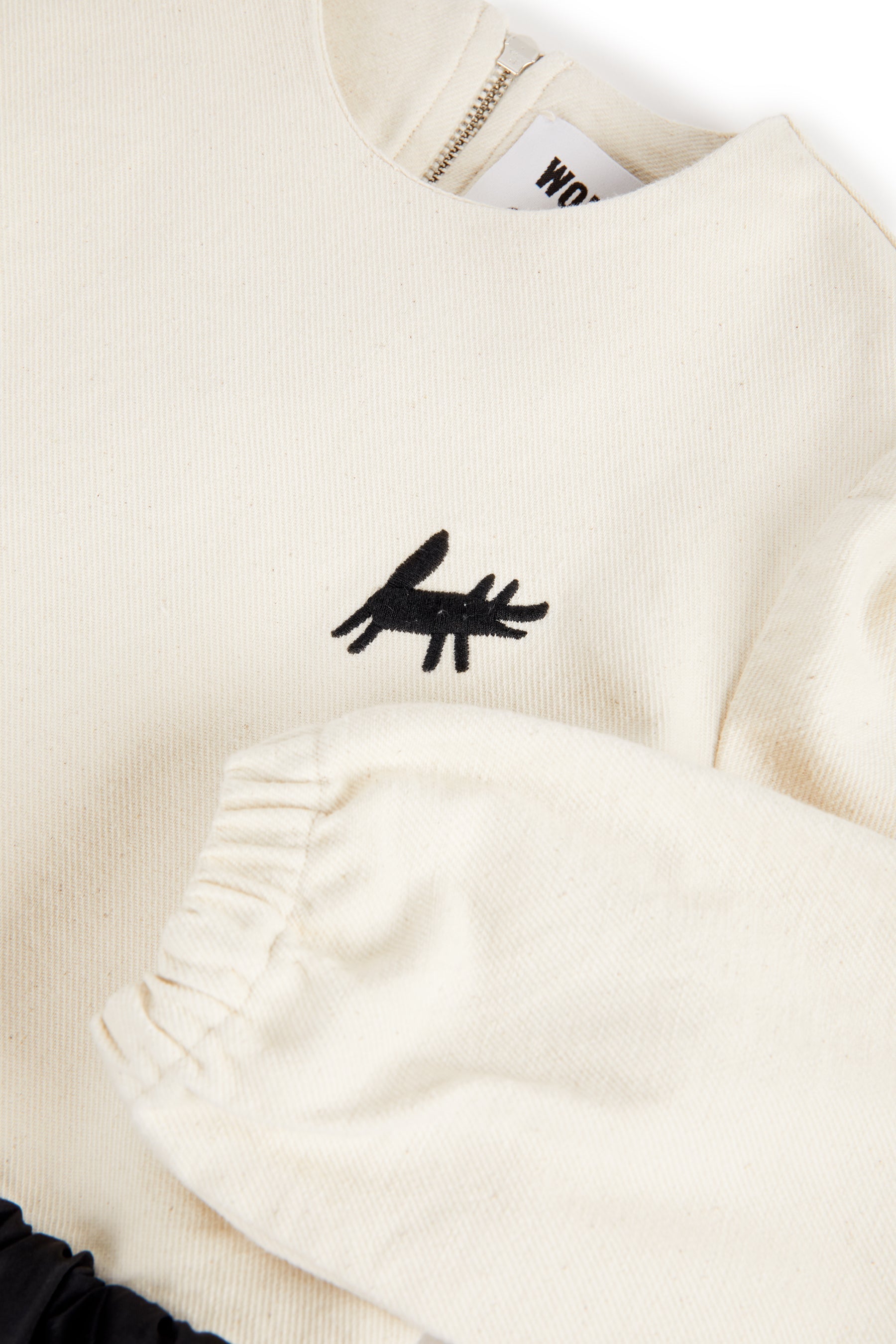Long sleeved blouse with gathered padded bottom, elasticated cuffs, metallic back zipper and small mascot embroidery