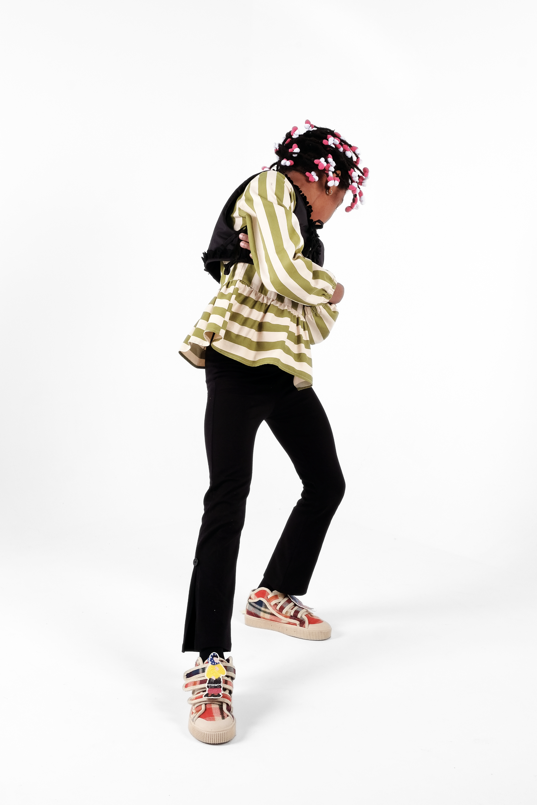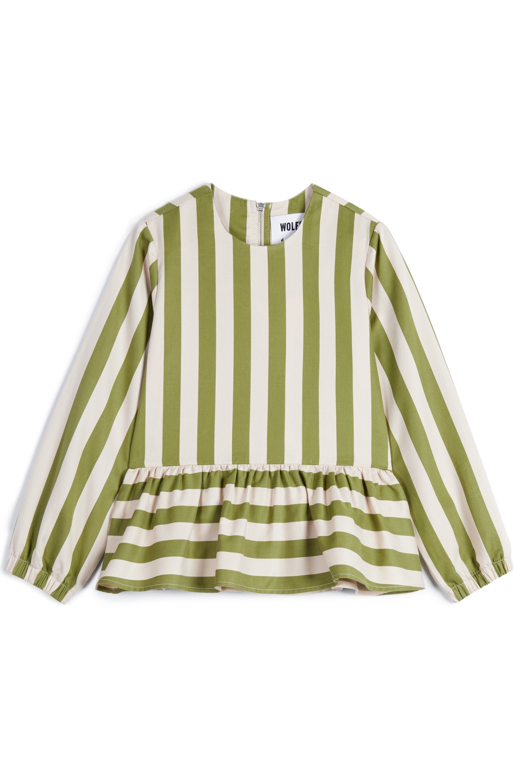Long sleeved blouse with gathered bottom, elasticated cuffs and metallic back zipper