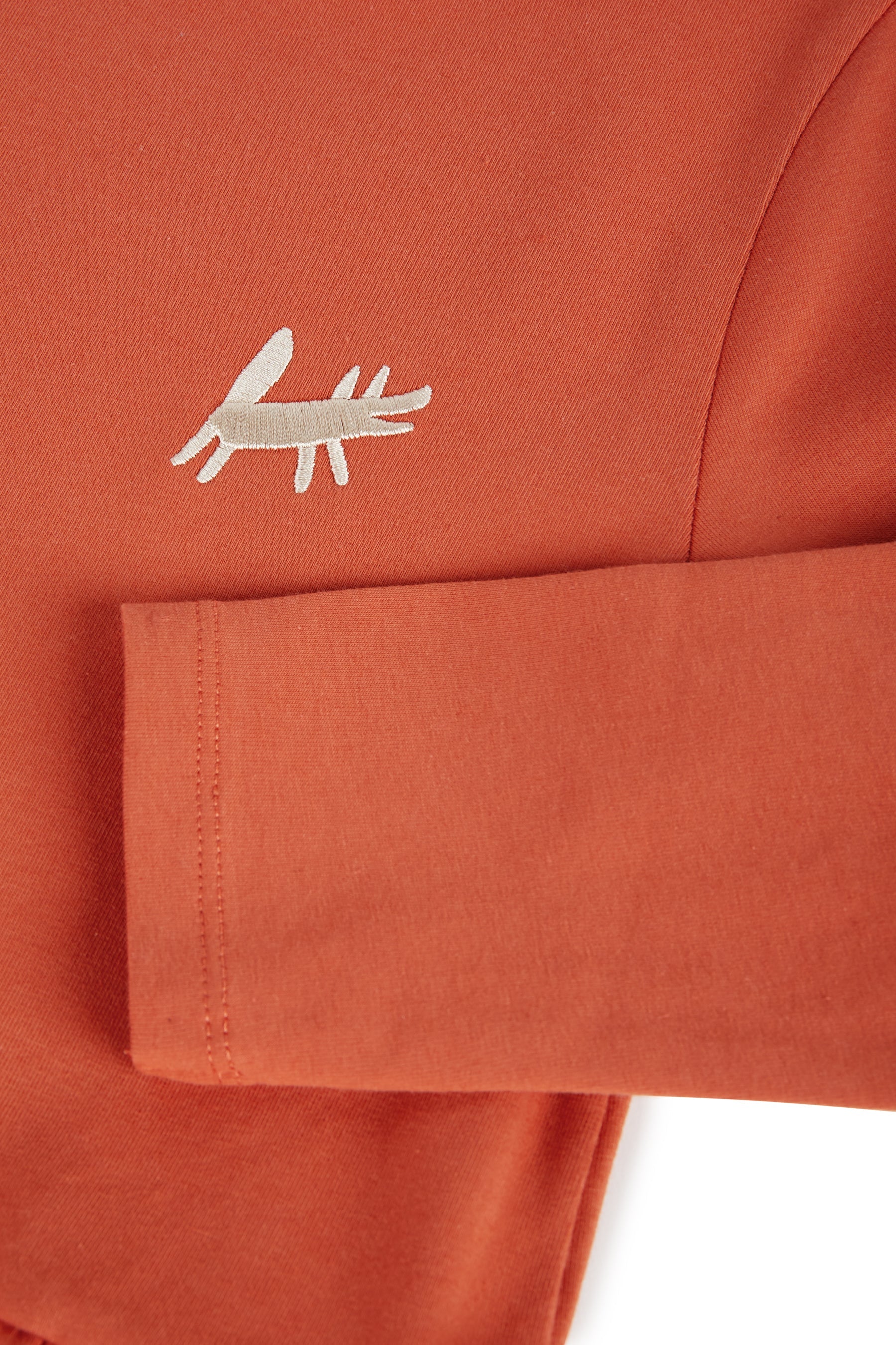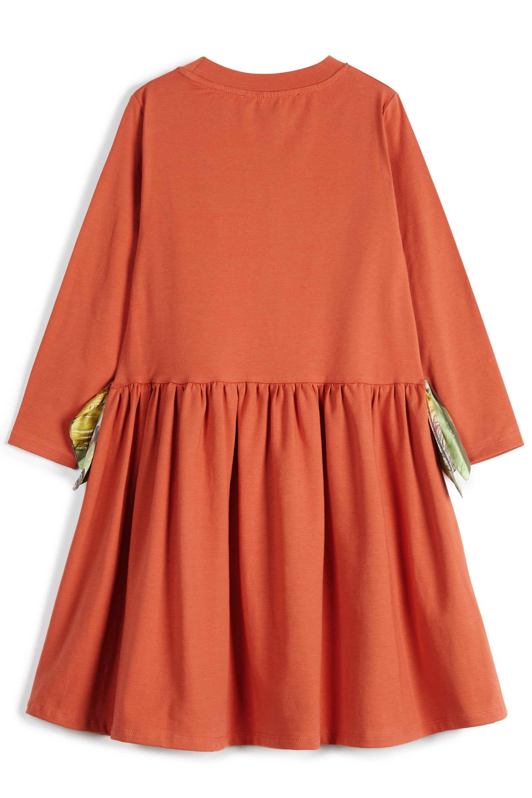 Mid length, long sleeved dress with gathered skirt, side bows and small mascot embroidery