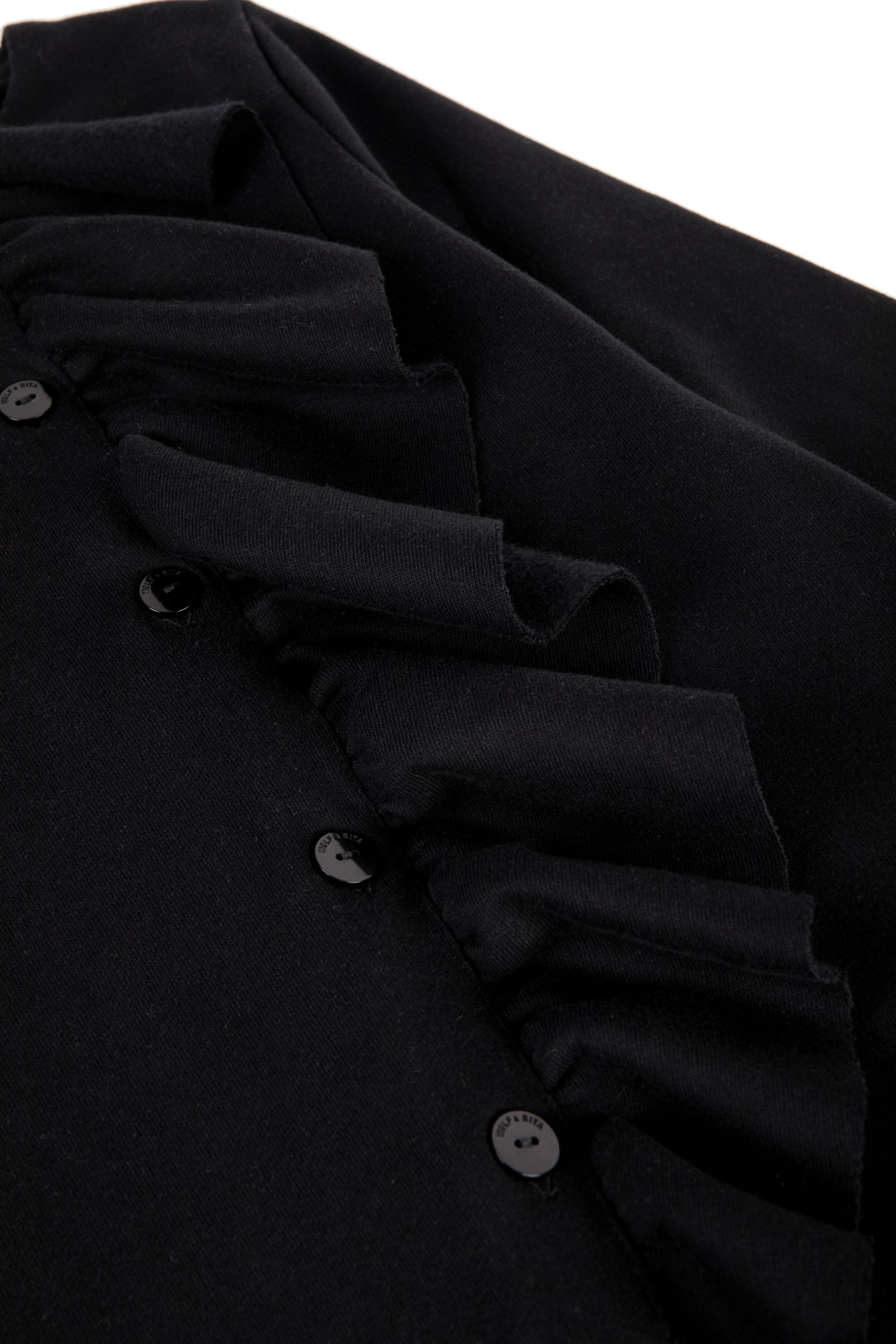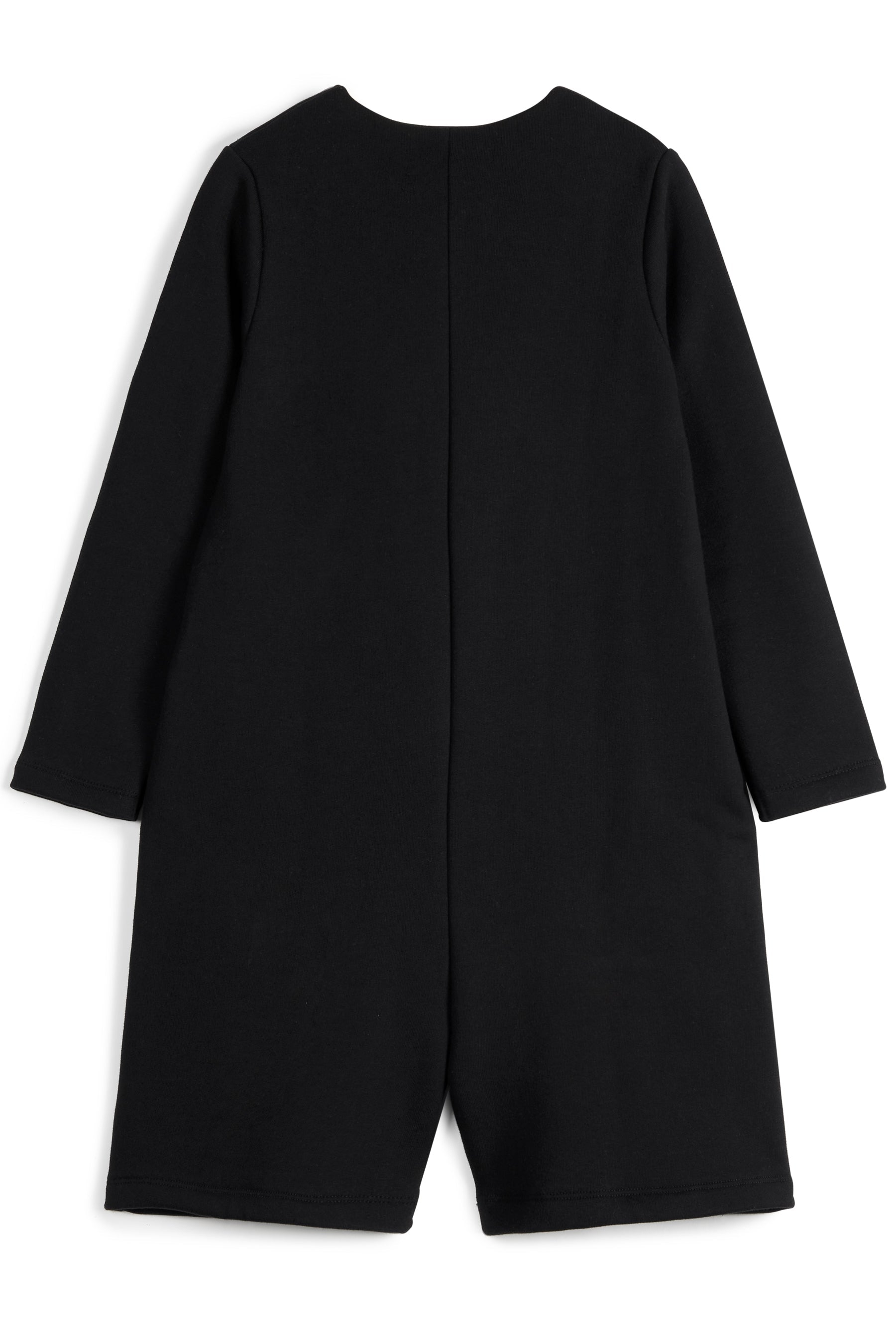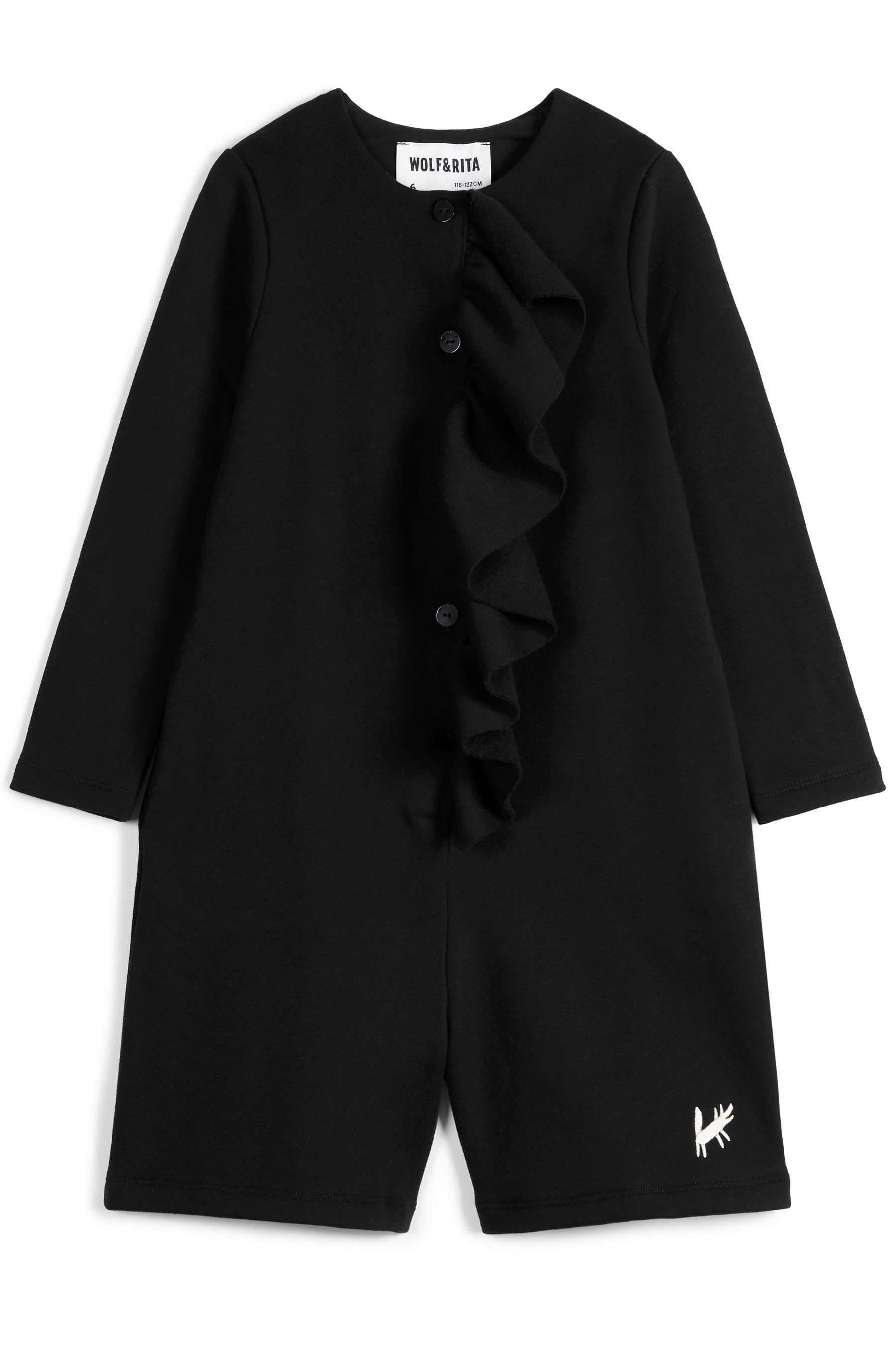 Long sleeved fleece jumpsuit with knee-high legs, side pockets, front buttons, frill detail and small mascot embroidery